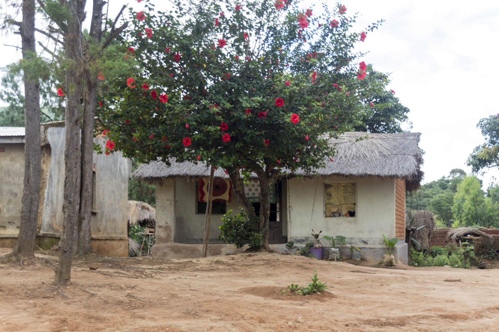 Nous découvrons un village propret, chaleureux, calme, d’ocre et de vert. La marche est vraiment agréable. Les gens nous sourient, rient parfois quand on leur dit « Mawka« , « Bonjour » dans leur langue. La plupart sont bien habillés, ils vont à l’église ou en viennent. Nous la découvrons au bout du chemin, elle est sobre, joliment cachée derrière quelques arbres paraissant issus d’un croisement entre pins et sapins.