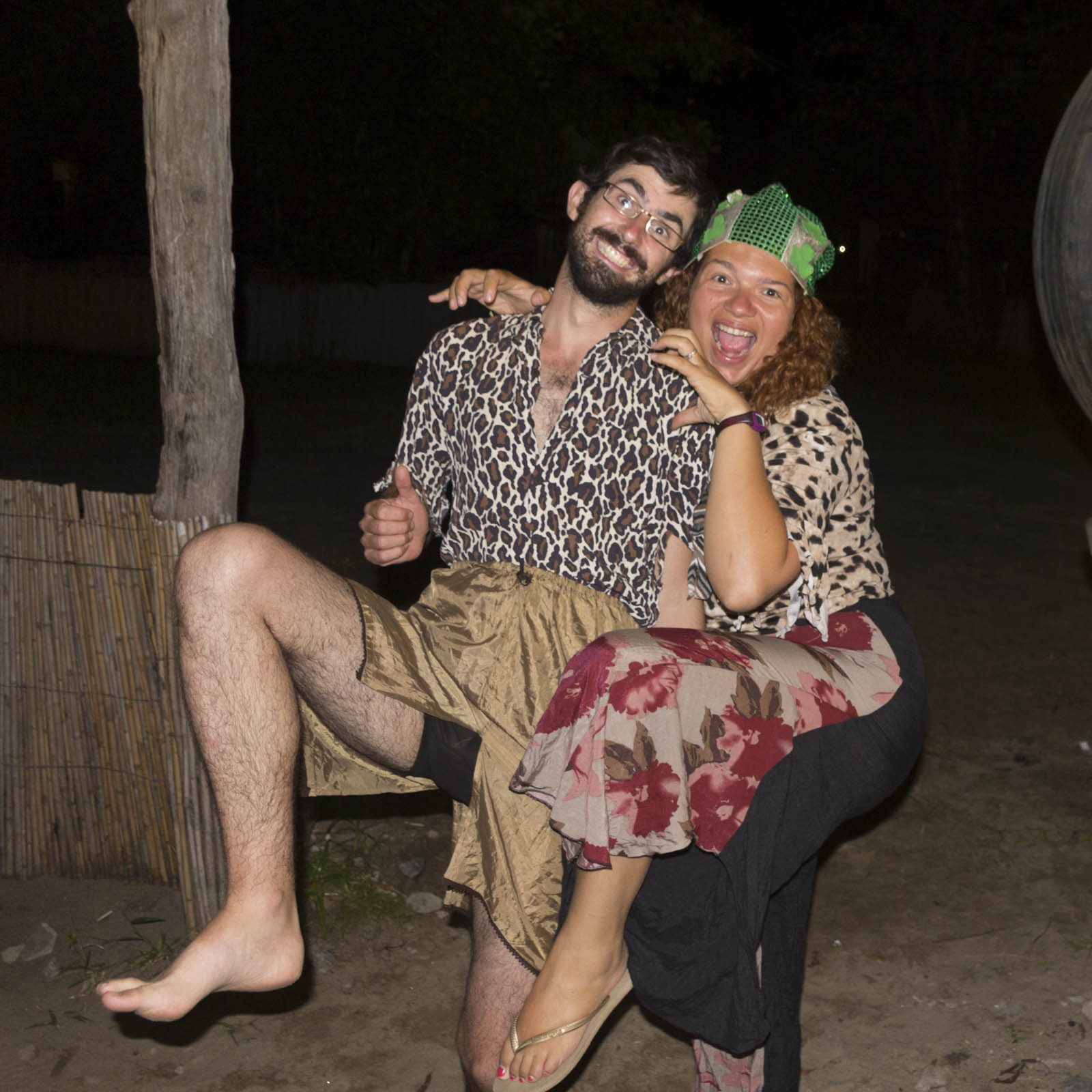 L’échange des tenues est bien plaisant, chacun vient au milieu du cercle et présente la tenue qu’il a choisie, et à qui elle est adressée. C’est très fun. Benoît hérite de quelque chose de relativement sobre, une chemisette léopard avec une petite jupe gris-argentée. Et Sandrine d’une tenue devant, soi-disant, rappeler le chic parisien. On repassera.