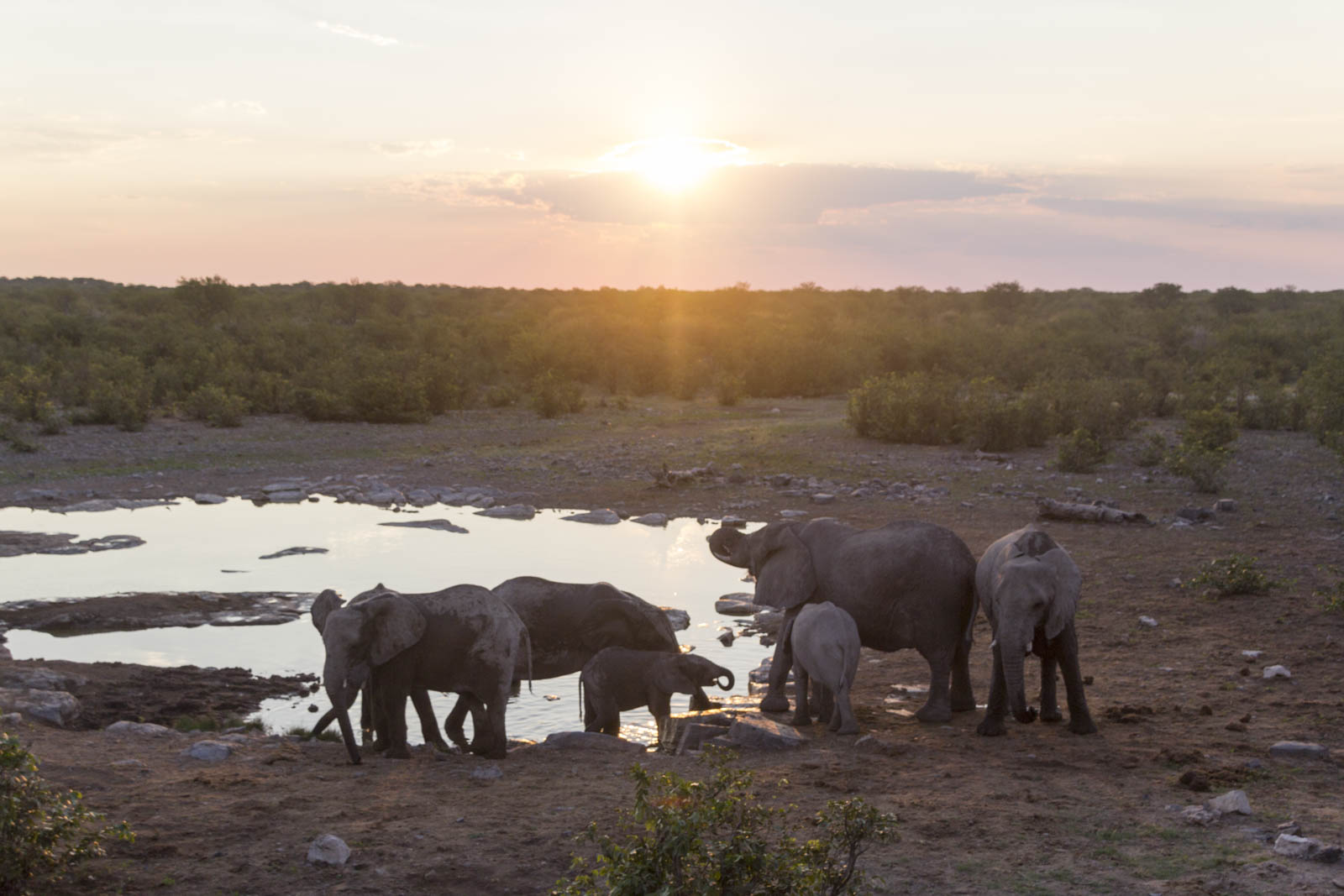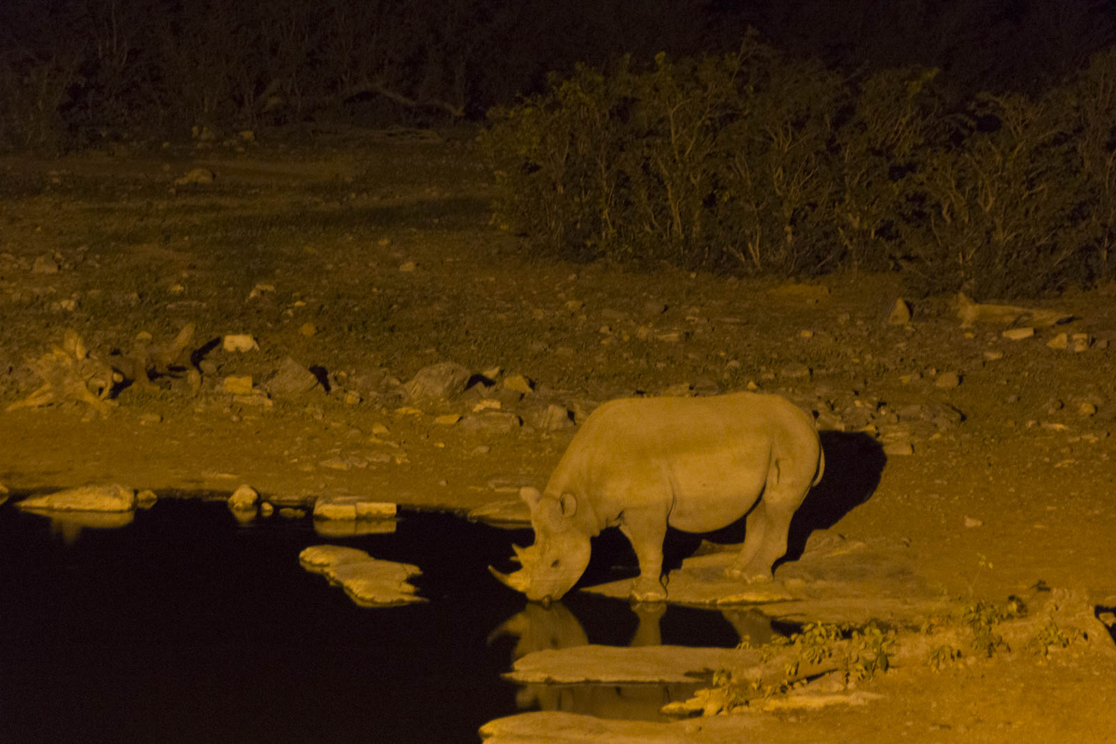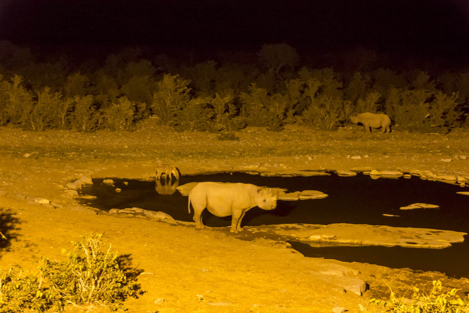 A quelques centaines de mètres de notre campement, en plein milieu du parc d’Etosha, se trouve un point d’eau où certains animaux ont pour habitude de venir s’abreuver. La particularité de celui-ci, c’est qu’il se présente comme un théâtre à ciel ouvert. En venant du camping, on arrive sur un tas de rochers juste à côté du point d’eau, où quelques sièges, un abri, une discrète palissade et deux gros projecteurs ont été installés. Nous nous y installons donc peu avant le coucher de soleil, et regardons la scène devant nous, en contrebas, en l’occurrence un point d’eau avec quelques buissons autour.