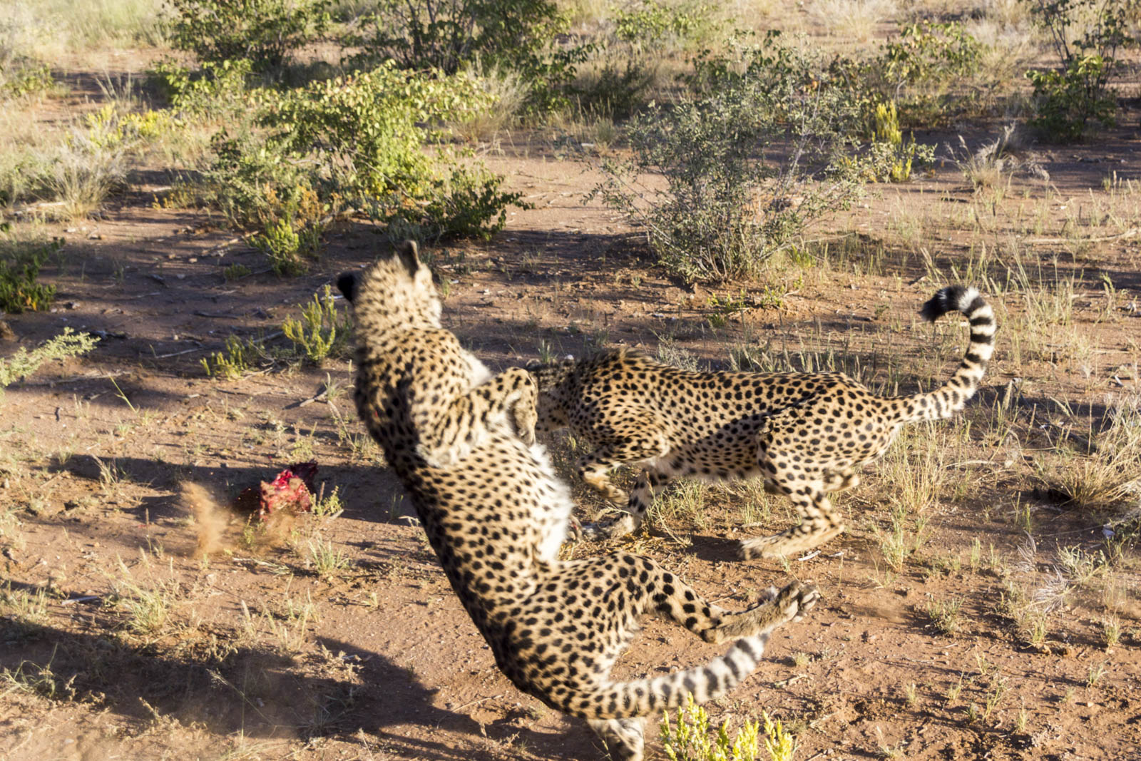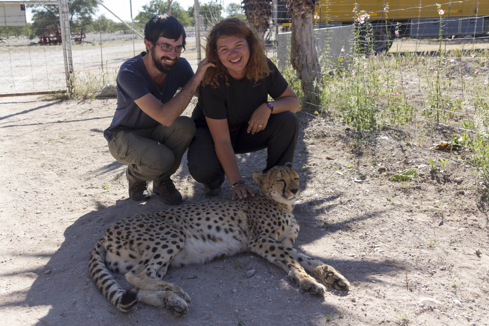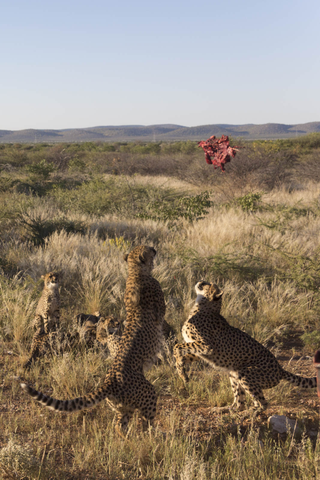 Il aménage aussi des sanitaires pour que les touristes restent camper la nuit, ça fait venir encore plus de monde dans ces contrées reculées. Et en fin de journée, on est invité à une tournée du vaste enclos dans lequel vivent 11 autres guépards, pour assister à leur dîner. Aujourd’hui au menu, un cheval. 2 kg de viande par guépard, ça a l’air sympa. Nous restons donc là, complètement à découvert, et voyons débarquer à toute vitesse ces énormes chats, avec leurs dents acérées et leurs longues griffes, tout près de nous. Mais ils ne viennent pas pour nous, ils sont là pour la viande que leur jette quotidiennement le fils du fermier. Ils sautent très haut pour attraper leur morceau de barbaque avant de courir le manger chacun de leur côté, dans un buisson. Impressionnant animal à la fois rapide, agile et puissant ! Il paraît même qu’ils peuvent atteindre la vitesse de 110 km/h en courant !