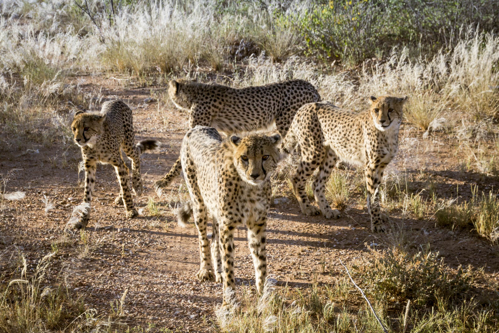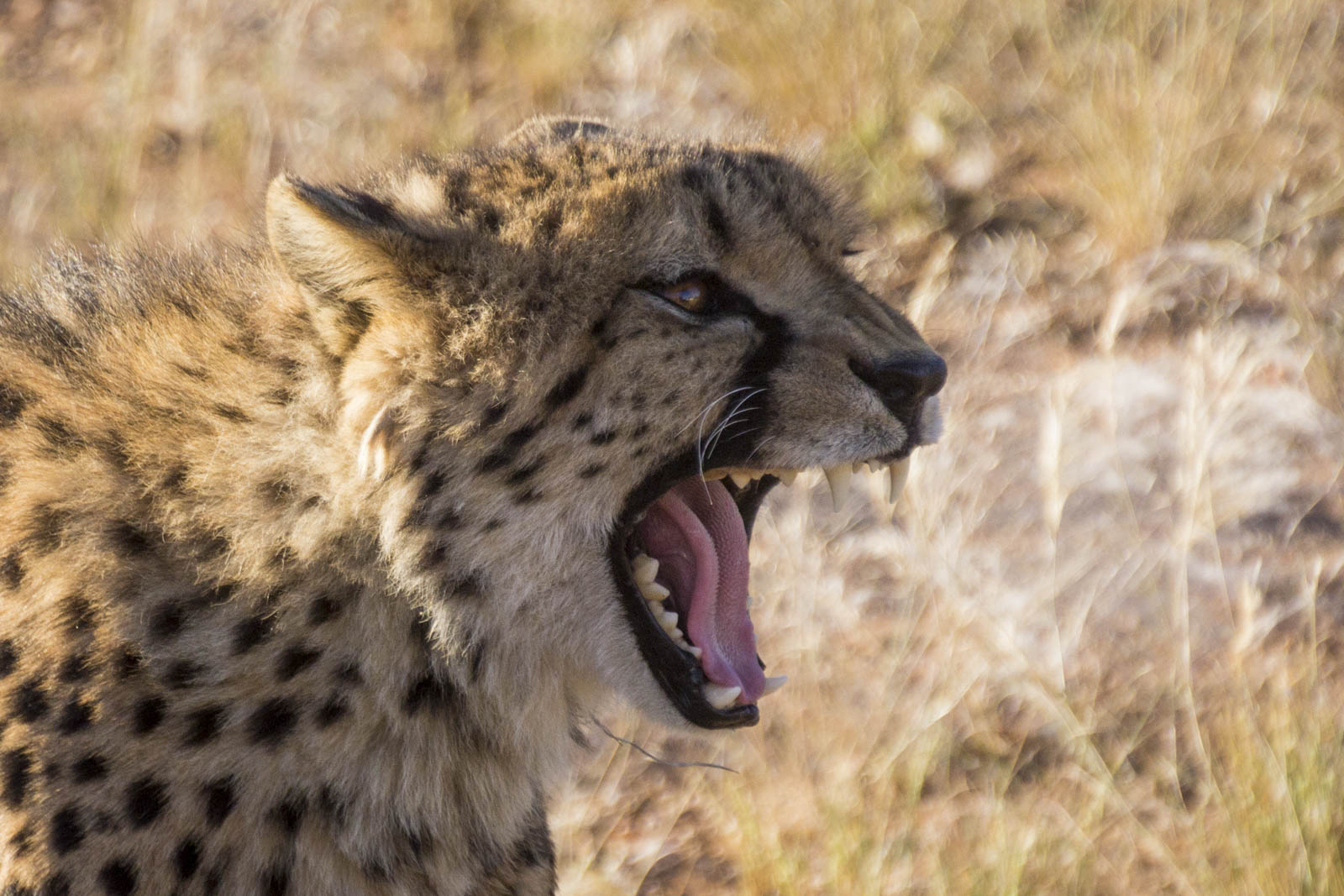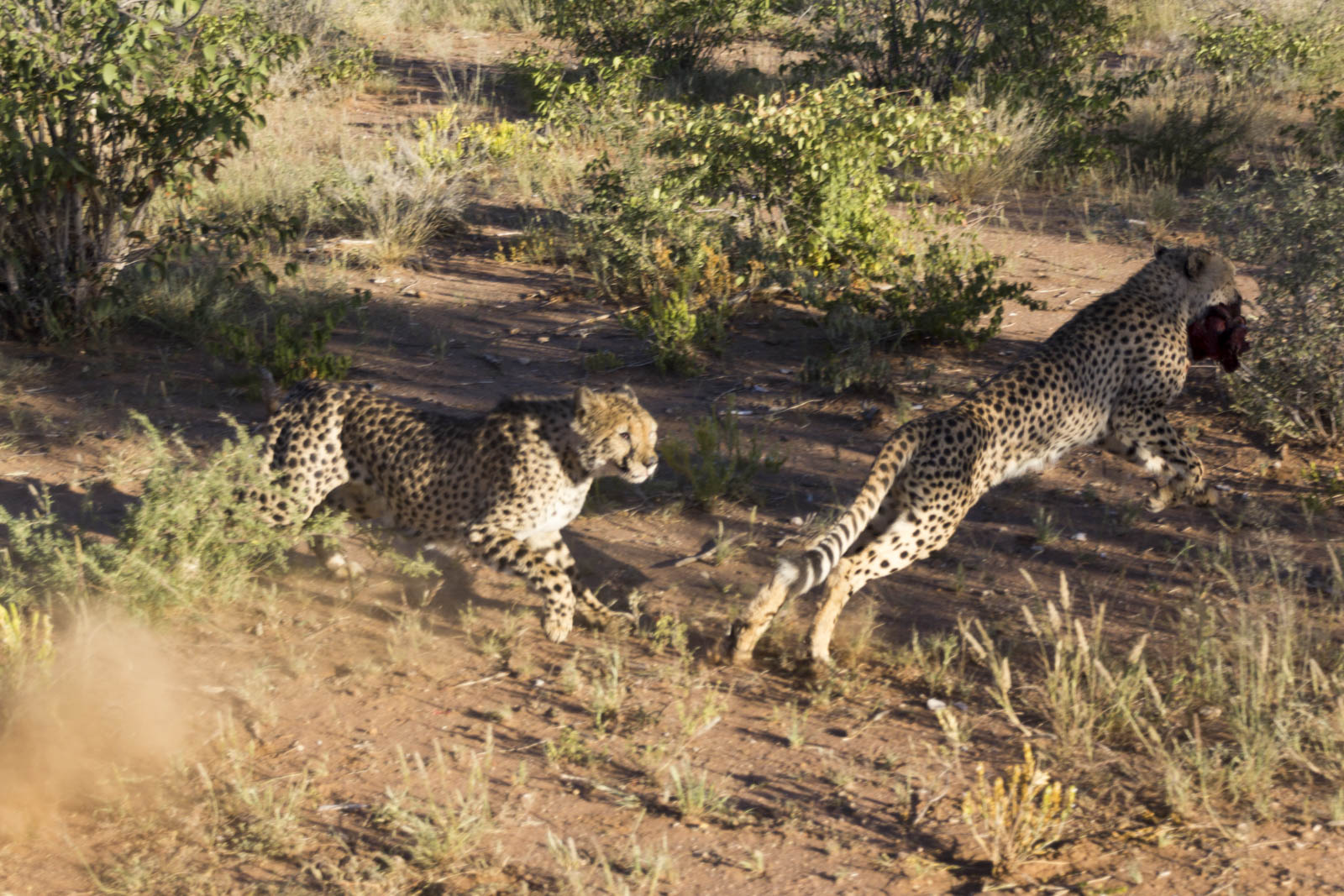 Il aménage aussi des sanitaires pour que les touristes restent camper la nuit, ça fait venir encore plus de monde dans ces contrées reculées. Et en fin de journée, on est invité à une tournée du vaste enclos dans lequel vivent 11 autres guépards, pour assister à leur dîner. Aujourd’hui au menu, un cheval. 2 kg de viande par guépard, ça a l’air sympa. Nous restons donc là, complètement à découvert, et voyons débarquer à toute vitesse ces énormes chats, avec leurs dents acérées et leurs longues griffes, tout près de nous. Mais ils ne viennent pas pour nous, ils sont là pour la viande que leur jette quotidiennement le fils du fermier. Ils sautent très haut pour attraper leur morceau de barbaque avant de courir le manger chacun de leur côté, dans un buisson. Impressionnant animal à la fois rapide, agile et puissant ! Il paraît même qu’ils peuvent atteindre la vitesse de 110 km/h en courant !