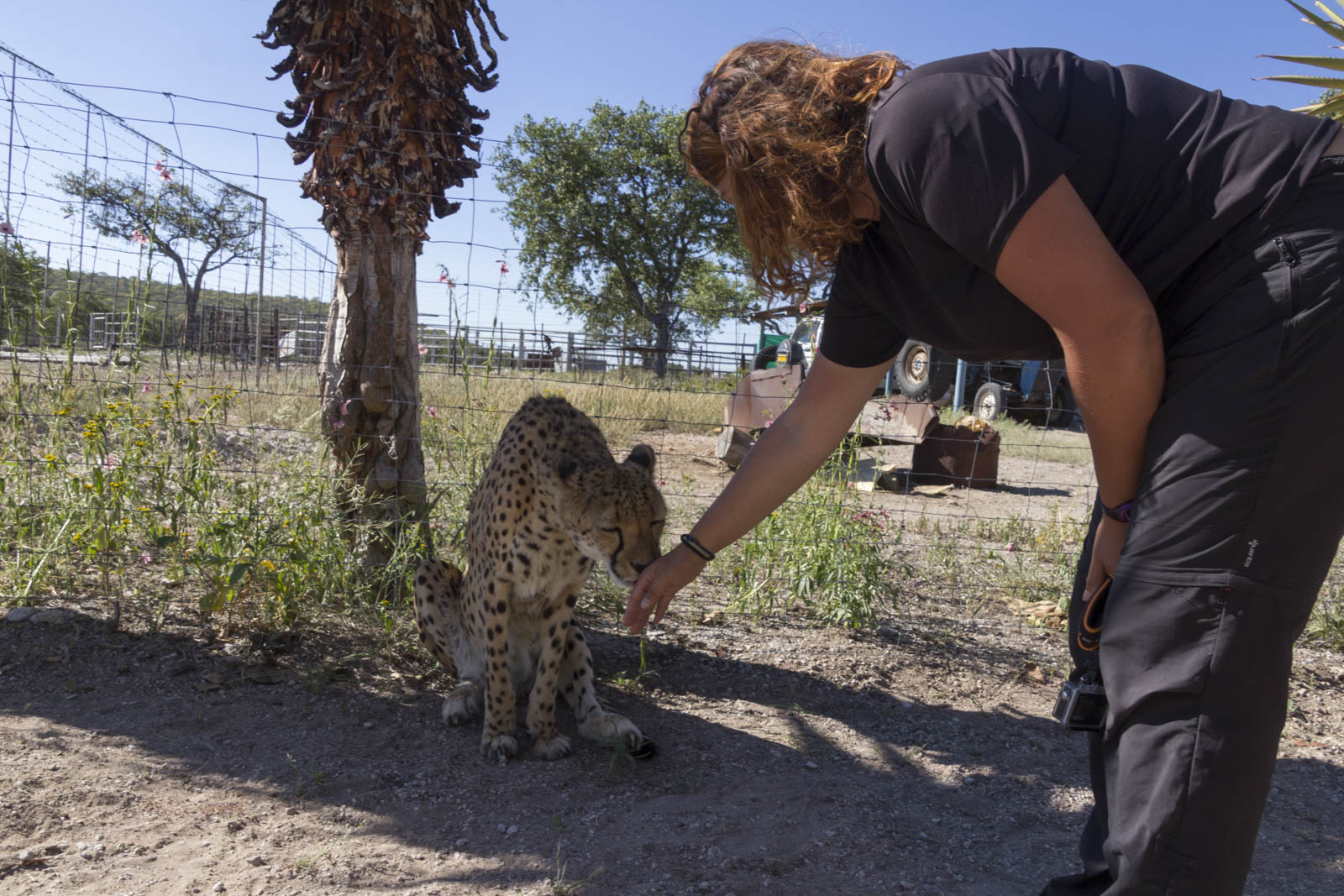 En sortant d’Etosha, nous faisons route vers un nouveau point de vie animale. Une ferme-auberge avec des guépards plus ou moins apprivoisés !