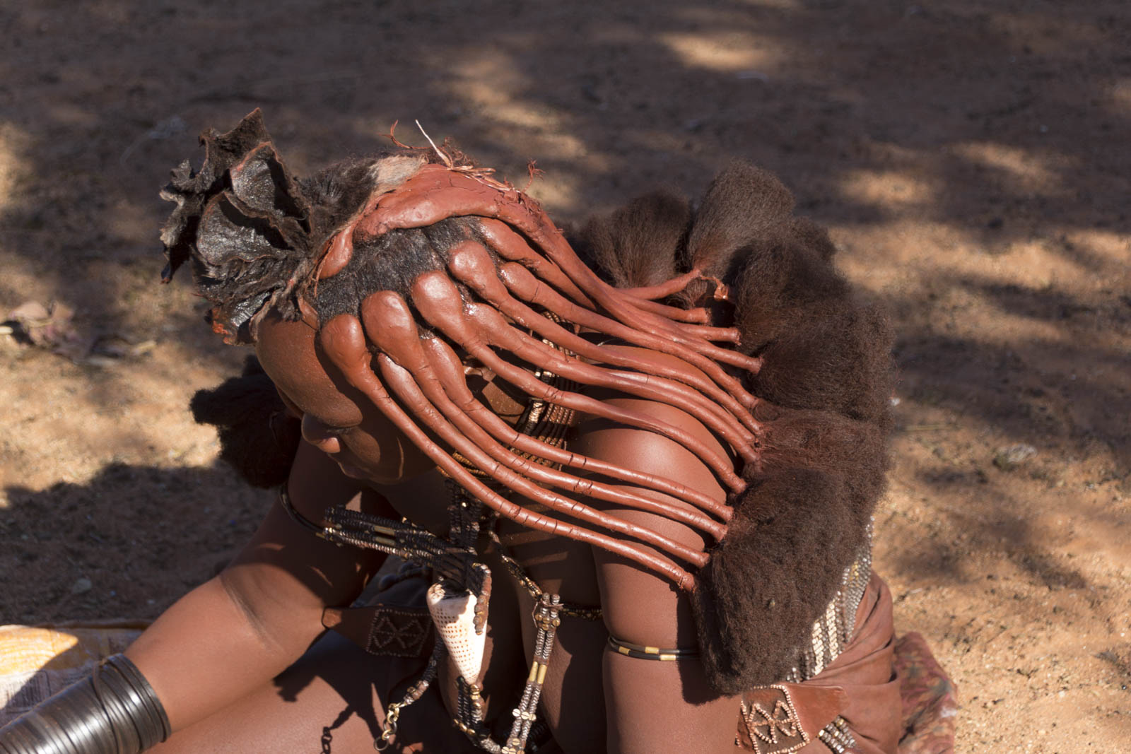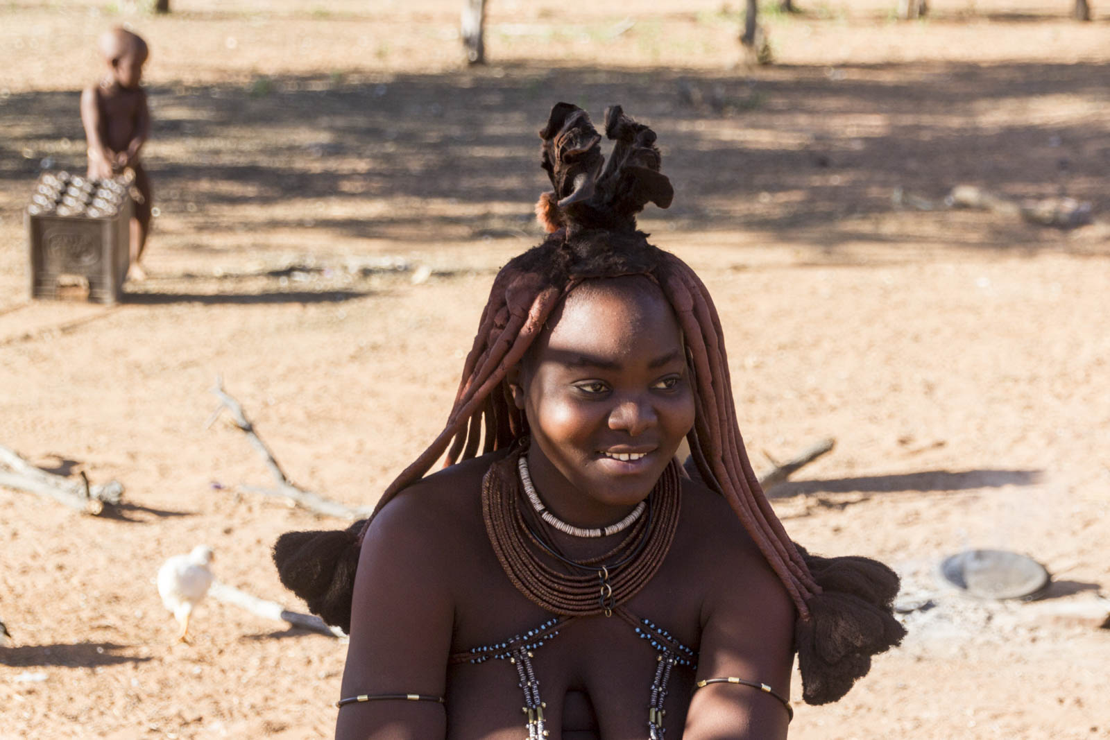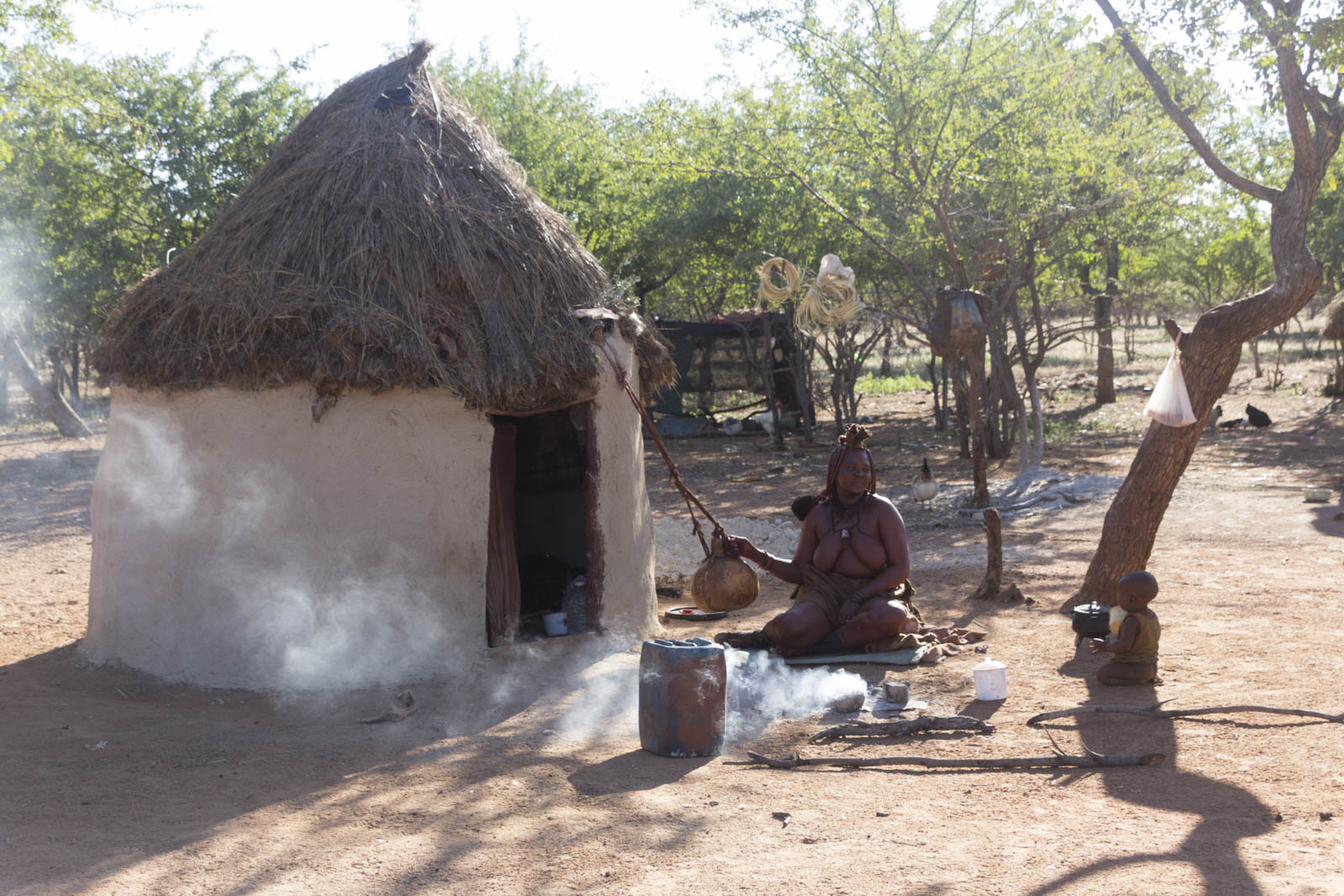 Dans la tradition Himba, les femmes ne se lavent jamais à l’eau. Elles utilisent des fumigations de plantes et s’enduisent le corps et les cheveux d’ocre à la place ! Ce qui donne cette couleur si particulière à leur peau.