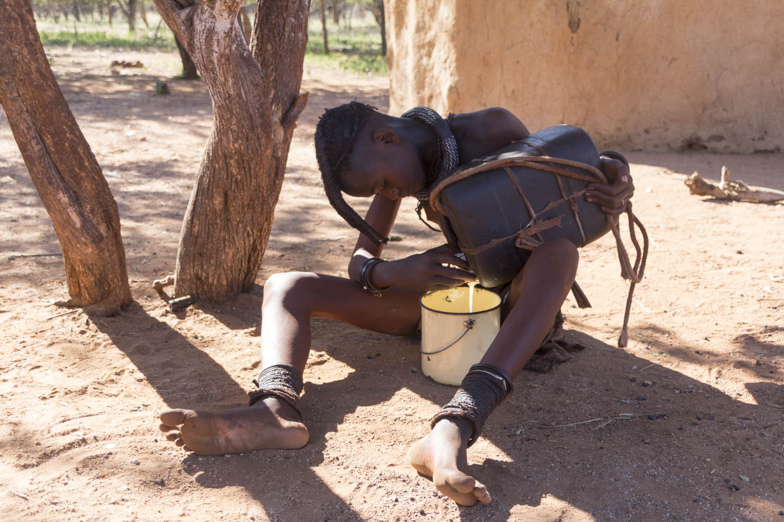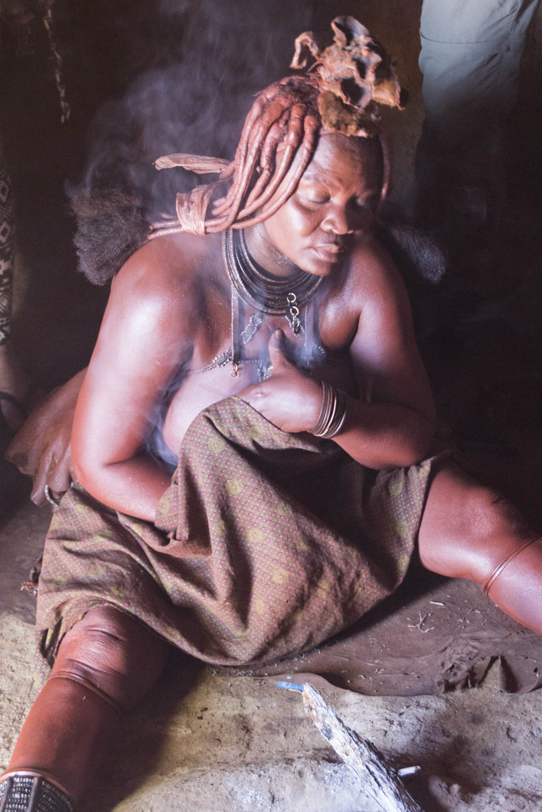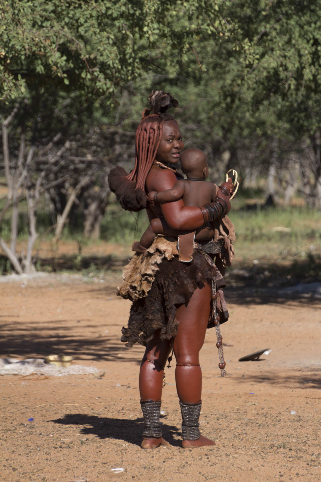 Dans la tradition Himba, les femmes ne se lavent jamais à l’eau. Elles utilisent des fumigations de plantes et s’enduisent le corps et les cheveux d’ocre à la place ! Ce qui donne cette couleur si particulière à leur peau.