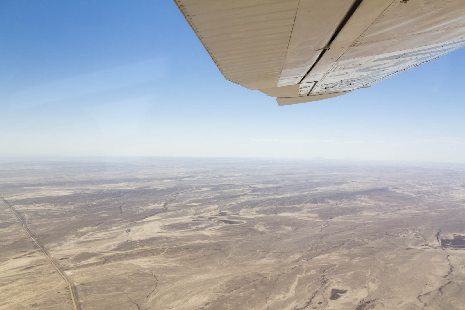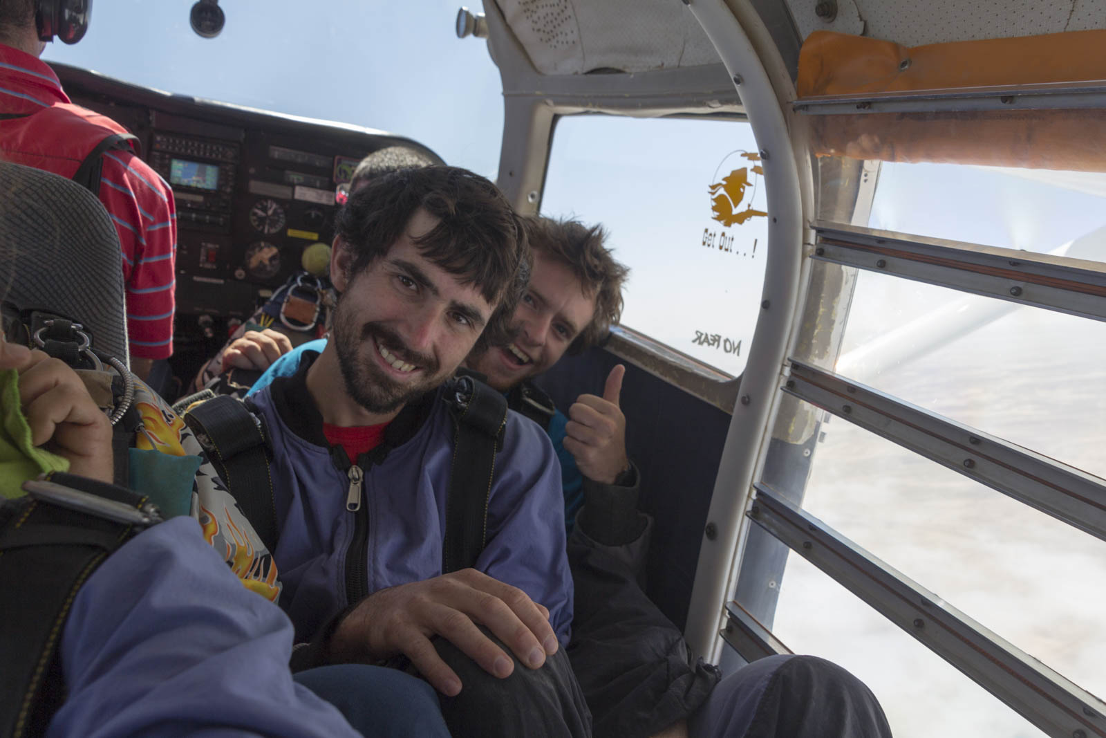 Pendant les 20 minutes de vol, on essaie d’observer un peu les paysages, le désert, la couche nuageuse au-dessus de l’océan, les rochers bruns foncés qui émergent au milieu du désert, formant un petit rift. Puis on atteint l’altitude de 8500 pieds. A ce moment, le pilote indique aux sauteurs de se préparer. Je sauterai en premier. Je me retourne et m’assois sur les genoux de David, qui m’attache à lui en quatre points. Puis je mets mon masque devant les yeux, et enfin il ouvre le petit rideau qui nous sépare de l’extérieur. La peur est à son comble !