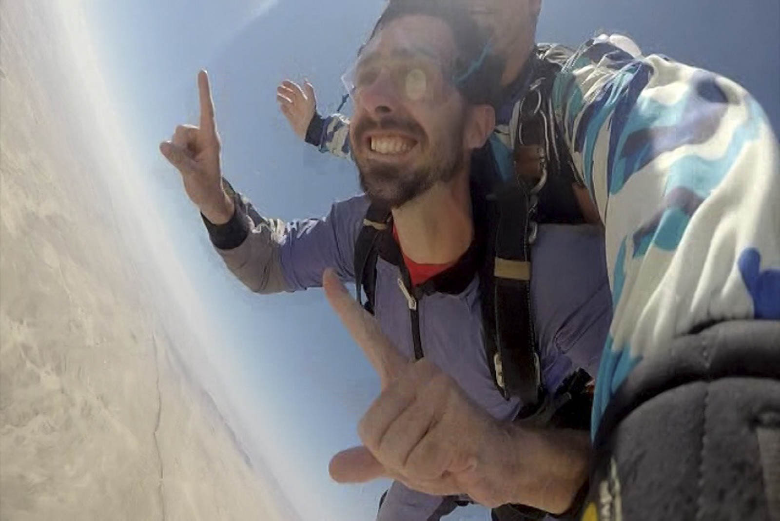 David, celui à qui je serai attaché, me filme en chemin vers l’avion et me demande mon sentiment avant de monter à bord de l’appareil. Je suis terrifié ! Mais j’essaye de feindre un sentiment de confiance en balbutiant difficilement que tout va bien… Puis nous montons dans l’avion, et décollons. Je commence à trembler.