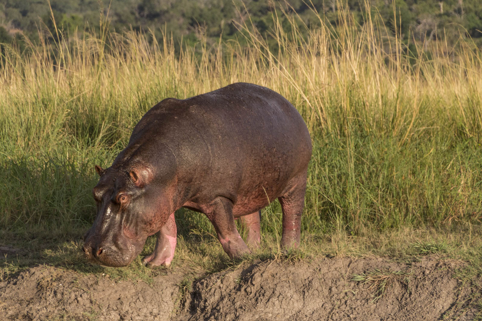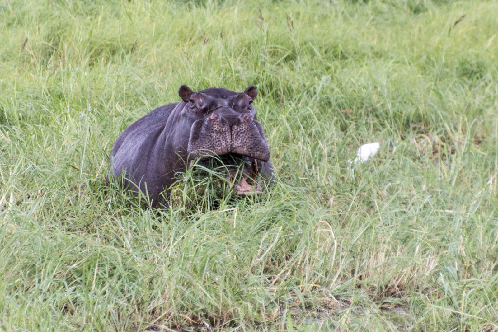 Puis dans les eaux peu profondes de la rivière, quelques éléphants qui broutent en continu, les pieds dans l’eau. Encore une belle approche de ces magnifiques pachydermes. A leurs côtés, et sans rivalité apparente, de nombreux hippopotames broutent également. Apparemment, il n’y a pas de conflit alimentaire entre les hippos et les éléphants, et donc pas d’agressivité, car ils ne mangent pas exactement les mêmes plantes ou les mêmes parties de plantes. Mais difficile de voir la nuance depuis le bateau. En tout cas, ça donne des images sympas. Et surtout, c’est enfin l’occasion d’apercevoir en entier, sur terre et de plein pied, les hippopotames. Jusqu’à présent, ils ne nous étaient apparus qu’en mode iceberg, avec juste une partie du dos et le haut de la tête sortis de l’eau. Et bien comme attendu, la partie immergée est bien plus impressionnante !