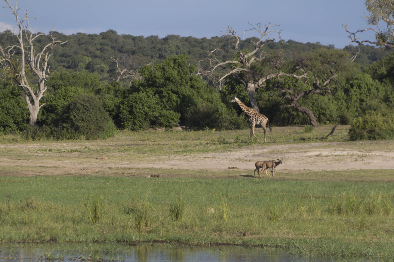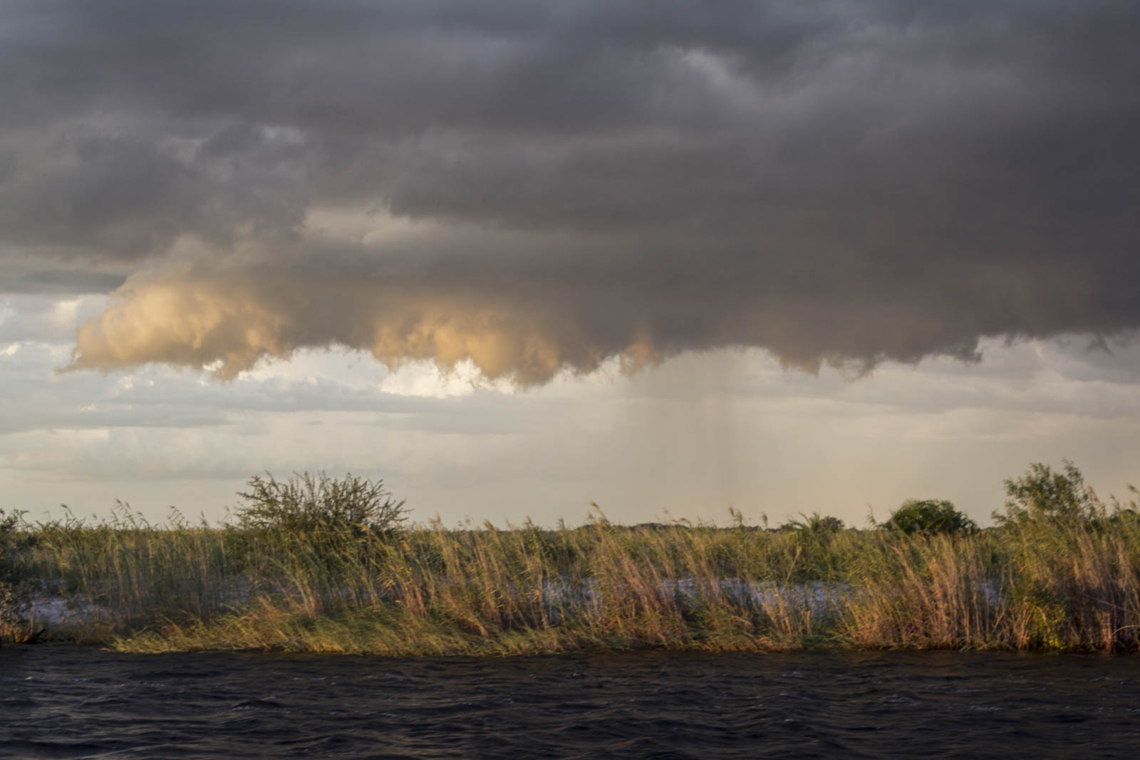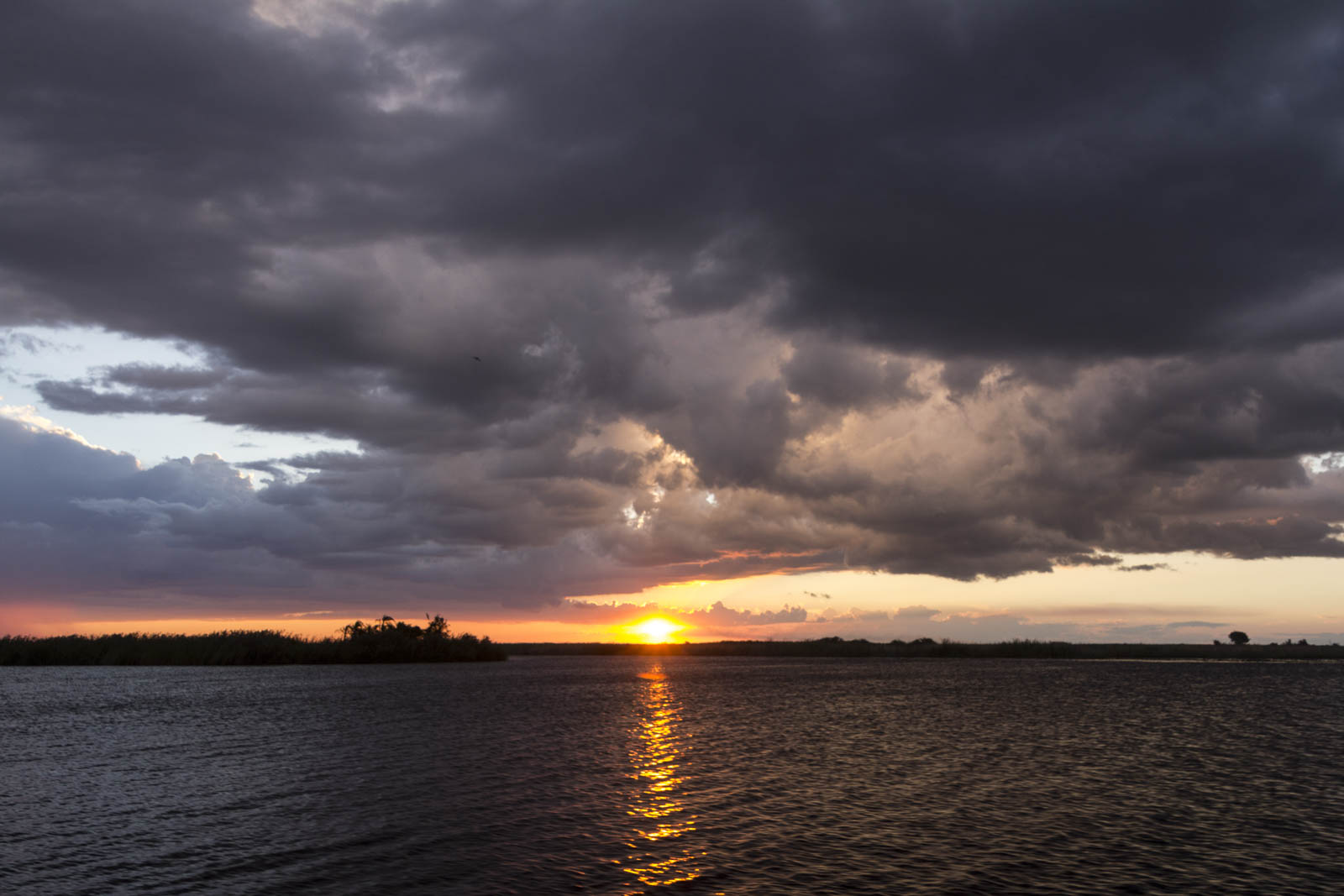 Enfin, en approchant d’une rive, la ménagerie africaine « habituelle » apparaît : une girafe qui passe au loin, un petit groupe d’impalas et quelques kudus tranquilles, et un bébé crocodile qui se balade juste devant nous. Et derrière, au milieu des grands arbres, on se prend à imaginer les quelques fauves qui doivent dormir là, à attendre la tombée de la nuit pour aller chasser. D’ailleurs, le ciel commence à prendre une belle teinte rouge, des nuages de toutes tailles se sont formés et plus au Sud, il a l’air de pleuvoir. Il est temps de rentrer car la nuit arrive.