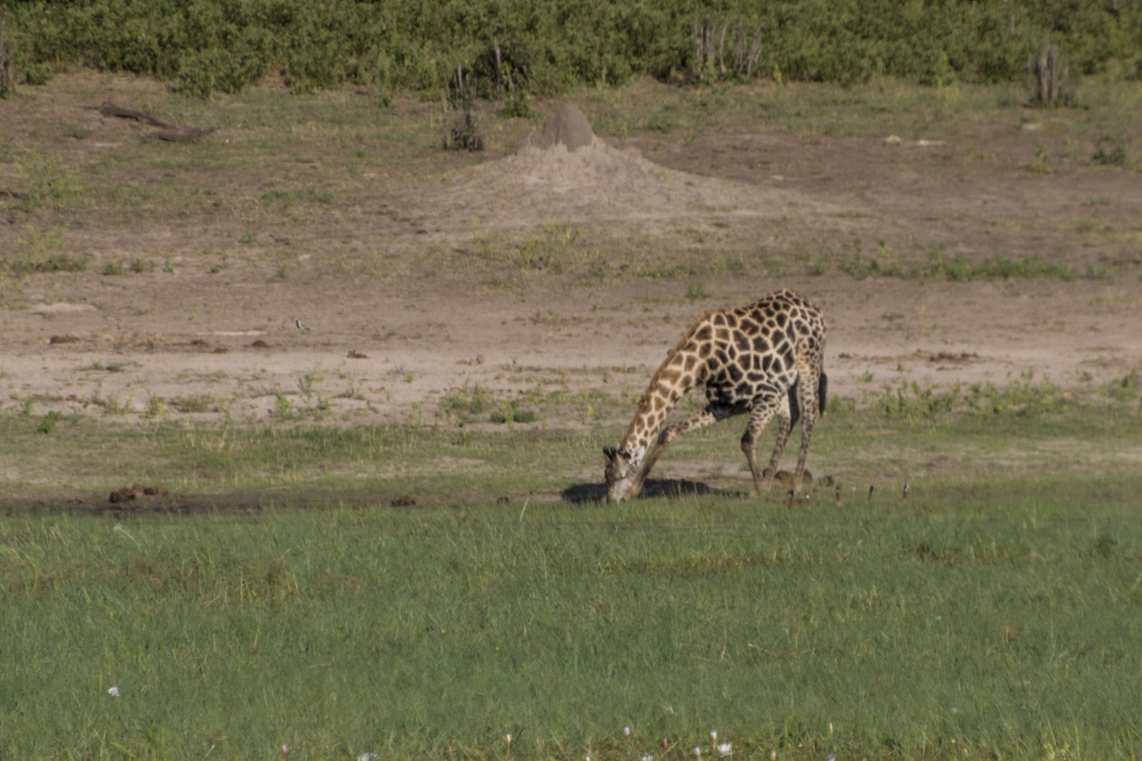 Enfin, je suis impressionné par le sens de l’orientation de nos guides au milieu de cet environnement sauvage. Déjà dans les méandres du delta pour parvenir à cette île, et maintenant sur cette grande île. Tous les éléments environnants leur servent de points de repère : une termitière orientée de telle ou telle manière, un baobab au milieu d’une clairière, un ensemble d’arbres, le soleil. Mais encore plus fort, ils arrivent aussi à trouver certains animaux en suivant leurs traces : empreintes de pas bien sûr, mais aussi excréments et aspects de la végétation environnante. C’est ainsi que sur une piste, nous avons trouvé des traces de hyènes et de lion, mais a priori trop anciennes pour être suivies. En revanche, la girafe est passée il n’y a pas très longtemps. Ses crottes toute fraîches le confirment. Après une bonne marche, on finit effectivement par l’apercevoir au loin. Mais elle a l’air de boiter, on ne s’en approchera pas trop. Balaises les gars en tout cas !