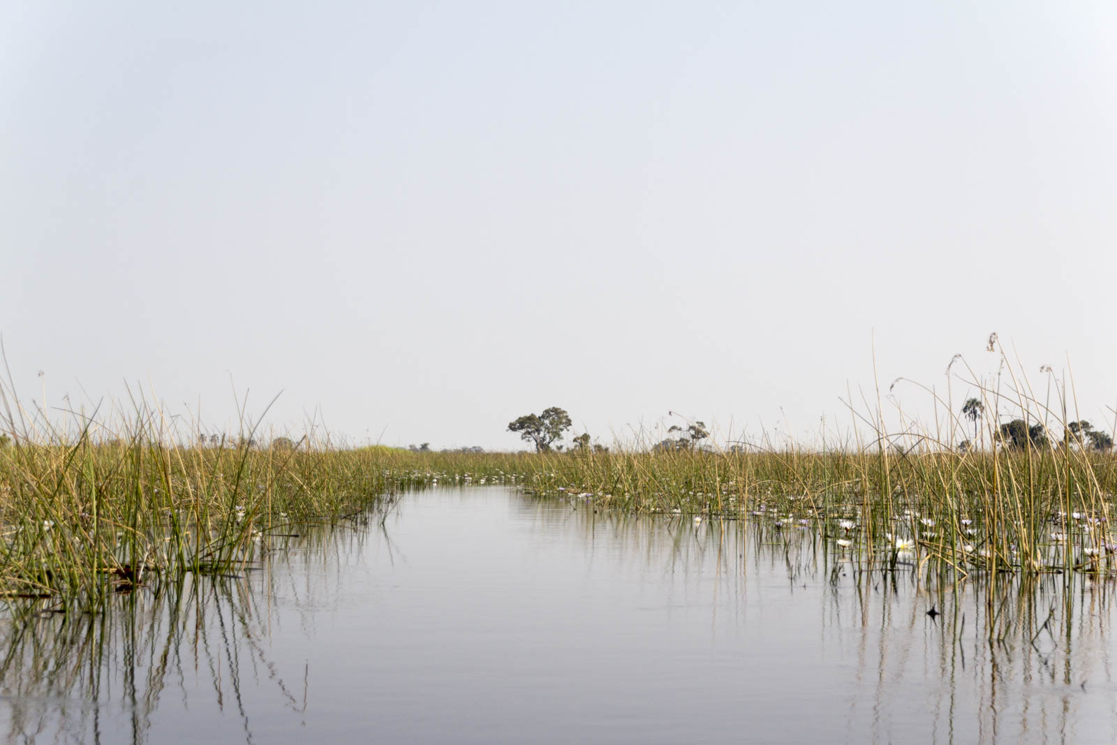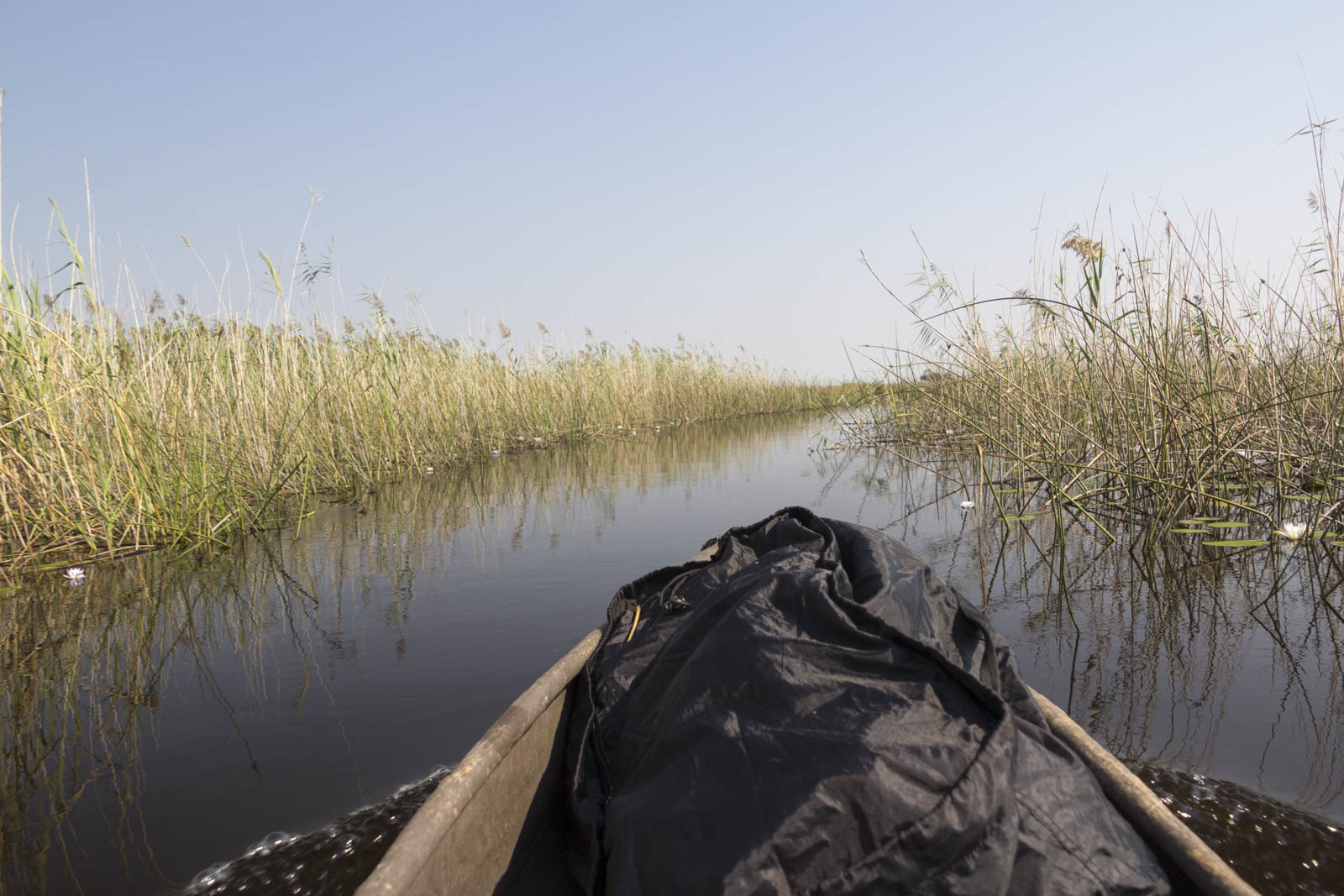 C’est dans les eaux de ce Delta que nous sommes partis pour trois jours de retraite paisible au cœur de la nature, et deux nuits de camping sauvage, avec pour seul moyen de locomotion le mokoro. C’est une sorte de longue pirogue peu profonde, traditionnellement construite dans un tronc d’ébène ou « d’arbre à saucisses », que l’on vide. Mais aujourd’hui, ils sont plus fréquemment faits en fibre de verre. Le mokoro se conduit à l’aide d’une longue perche en bois d’environ 5 mètres. Pour avancer, le piroguier l’enfonce jusqu’au fond de l’eau et pousse sur le fond de la rivière. Il s’en sert aussi pour guider l’embarcation.