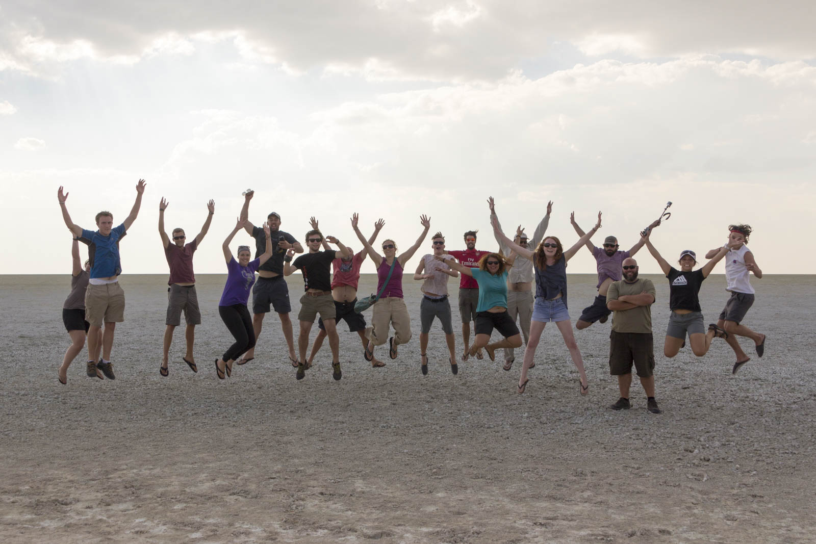 Au milieu du parc d’Etosha, nous découvrons une première curiosité naturelle : un immense désert de sel à perte de vue, tout plat. On se croirait revenus à Uyuni ! C’est d’ailleurs l’occasion pour le groupe de prendre quelques photos rigolotes avec la perspective.