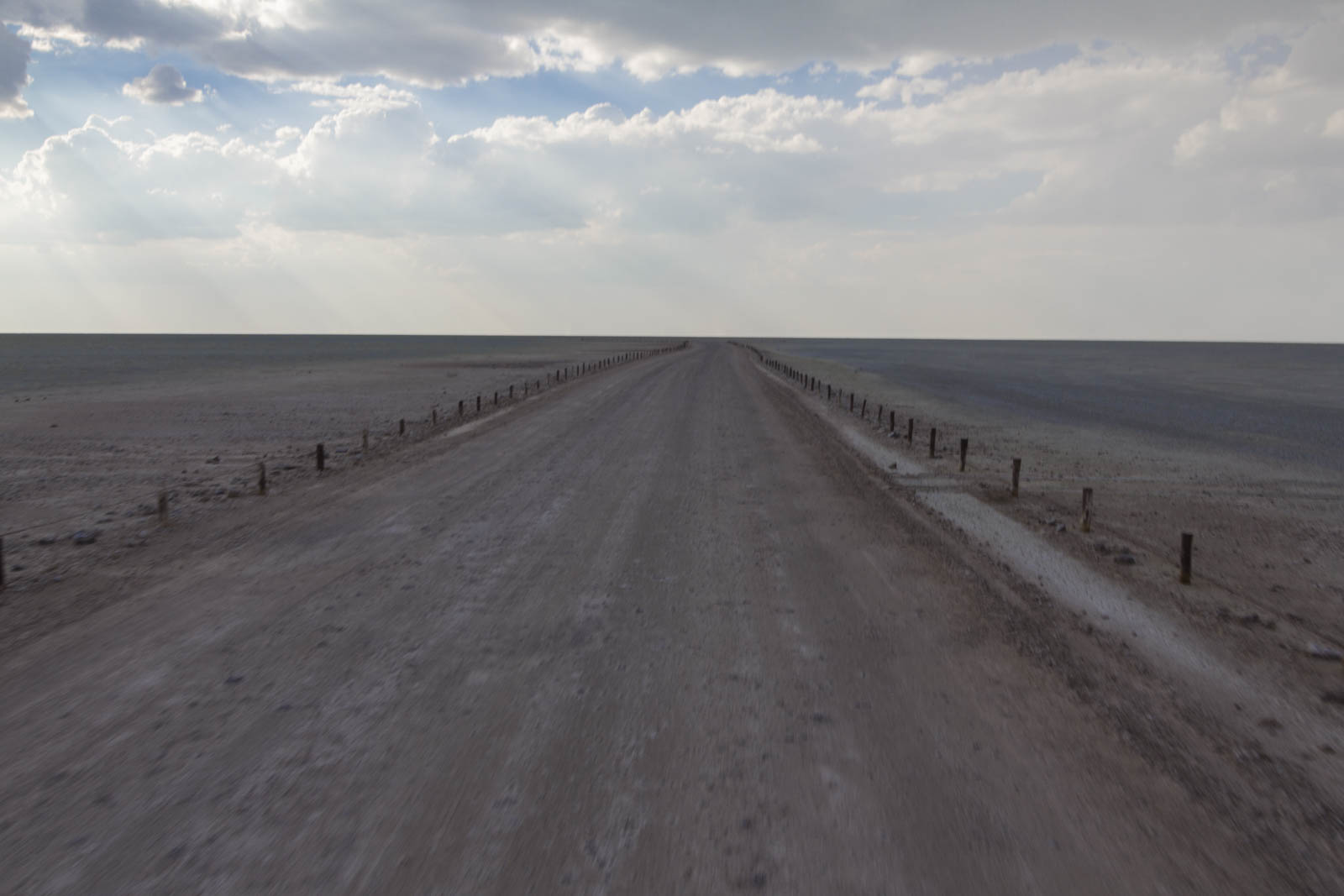 Mais le désert de sel d’Etosha est plus gris que blanc, ce qui atténue le contraste avec le ciel. Cette couleur grisâtre du sel s’explique probablement par l’humidité présente dans le sol. Il y a quelques semaines, en effet, c’était la saison des pluies. Et toute l’étendue de ce désert aurait dû être recouverte d’eau. Malheureusement, il n’a pas assez plu cette année, pas suffisamment pour faire émerger une seule goutte d’eau du sol : un signal très alarmant pour les gardes du Parc. Puisque cette eau permet d’hydrater l’exceptionnelle faune environnante. Et du coup, le peu d’eau qui est tombé a été absorbé par le sel, lui donnant cette couleur, ainsi que l’impression de marcher sur un sol mou.