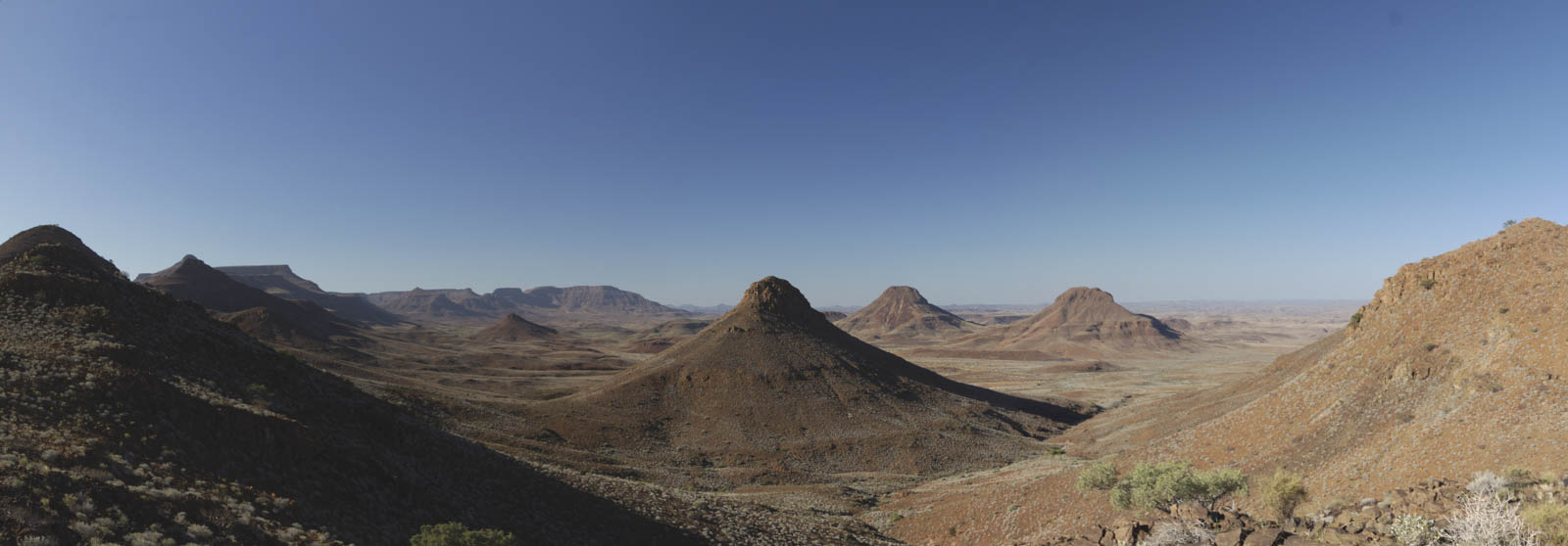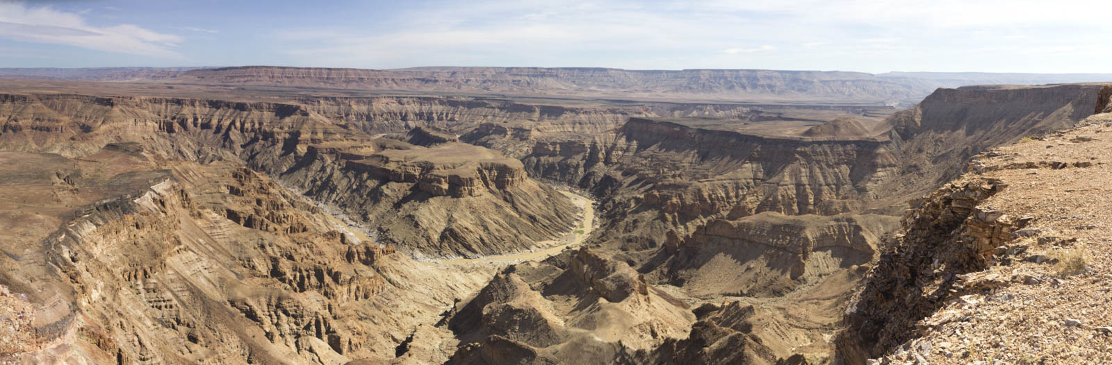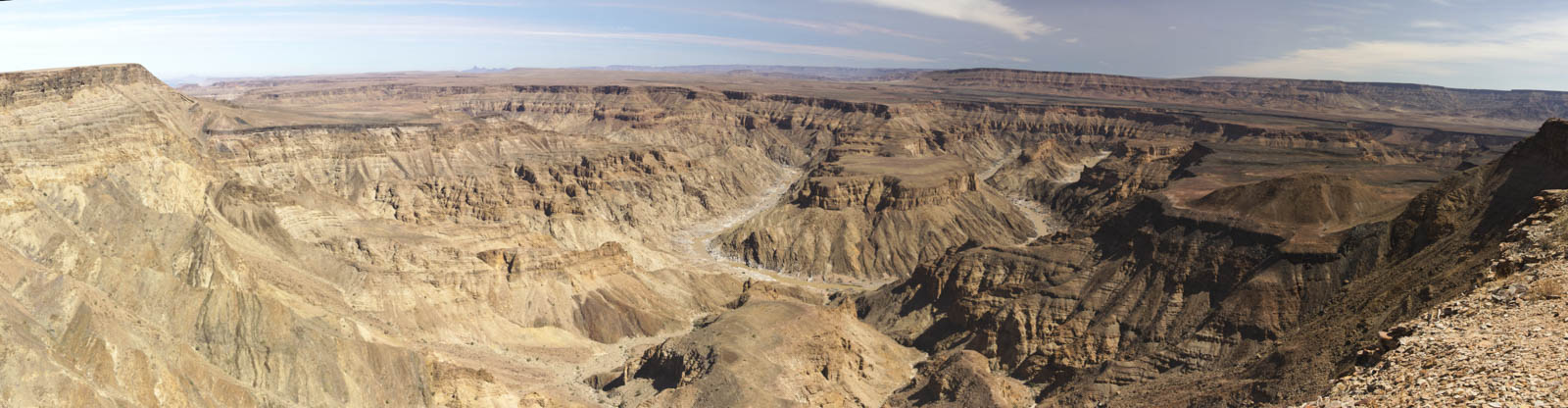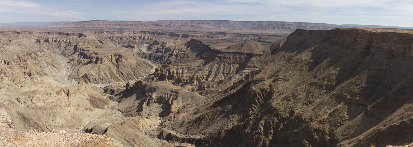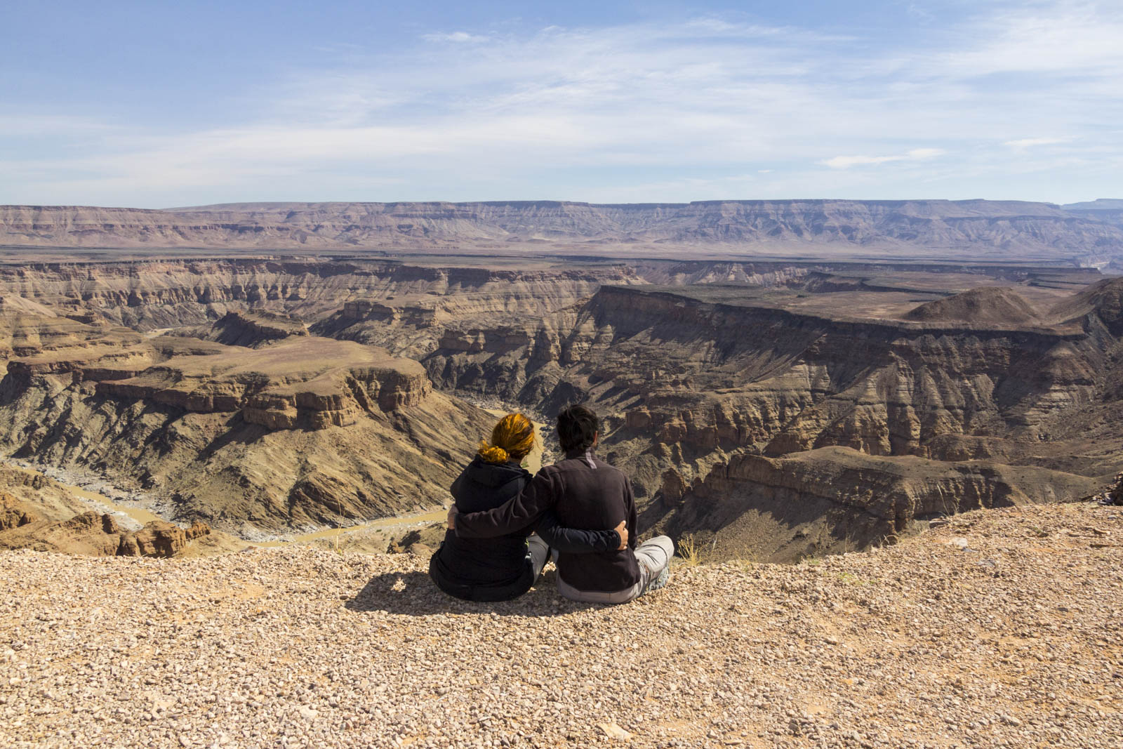 Notre épopée sur les routes namibiennes s’achève tout au sud du pays, dans un parc transfrontalier avec l’Afrique du Sud. Après avoir traversé une autre zone montagneuse, nous sommes arrivés sur un haut plateau qui héberge une véritable merveille géologique : le Fish River Canyon. C’est le second plus grand canyon du monde, d’une largeur allant jusqu’à 27 km et d’une profondeur maximale de 550 mètres. Et encore plus fort, c’est aussi un canyon dans le canyon. Dans le canyon supérieur, aujourd’hui très large, s’est créé un second canyon, bien plus étroit, où coule tout au fond la tranquille Fish River. On aurait pu rester de nombreuses heures à contempler cette magnifique formation géologique. On a aussi rêvé de pouvoir descendre tout en bas et de l’admirer sous un autre angle, mais malheureusement ce privilège n’est réservé qu’aux trekkeurs qui effectuent le circuit de 5 jours en autonomie dans le fond du canyon. Ou aux géologues qui viennent faire des recherches sur ces formations rocheuses vieilles de 650 millions d’années. Les veinards !