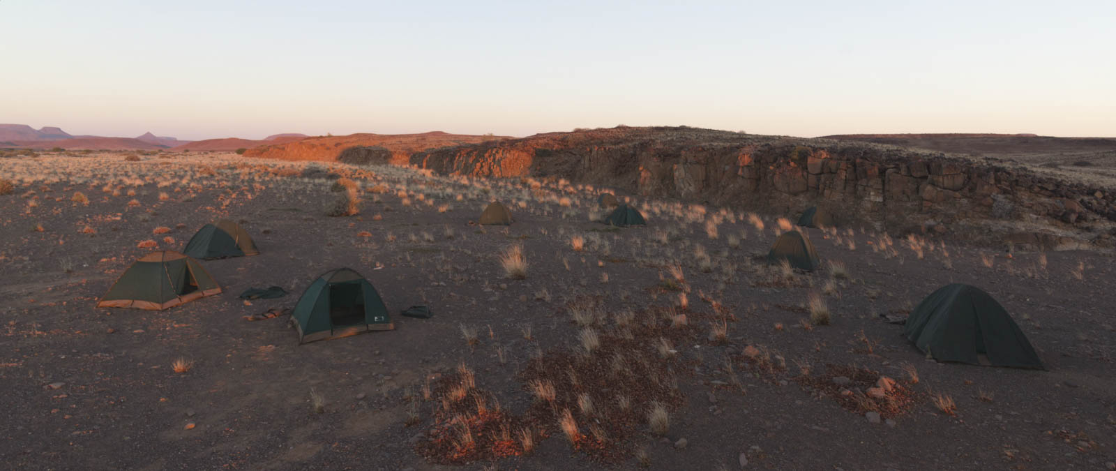 En sortant d’Etosha, nous poursuivons notre route vers l’Ouest et l’océan. Au fur et à mesure de notre progression, l’aridité s’accentue, la végétation rétrécit jusqu’à disparaître presque totalement. Des reliefs aux couleurs brunes, voire rougeâtres, commencent à apparaître. Après quelques kilomètres au milieu de ces montagnes, on finit carrément par se croire dans la Vallée de la Mort, aux Etats-Unis. Ou dans le désert d’Atacama, au Chili. A quelques buissons près toutefois. C’est dans ce décor exceptionnel que nous fêtons dans le truck l’anniversaire d’Andy, à coups de nombreux cubis de vin bien sûr. Et nous achevons cette belle journée par un camping sauvage au milieu du désert, avec au menu steak de koudou et frites maison s’il-vous-plaît ! Une nuit magnifique !