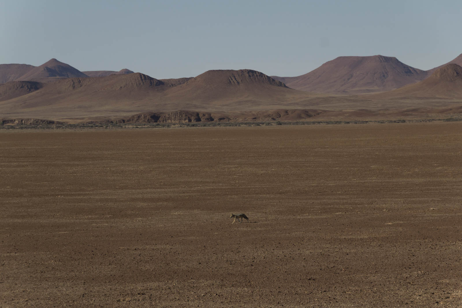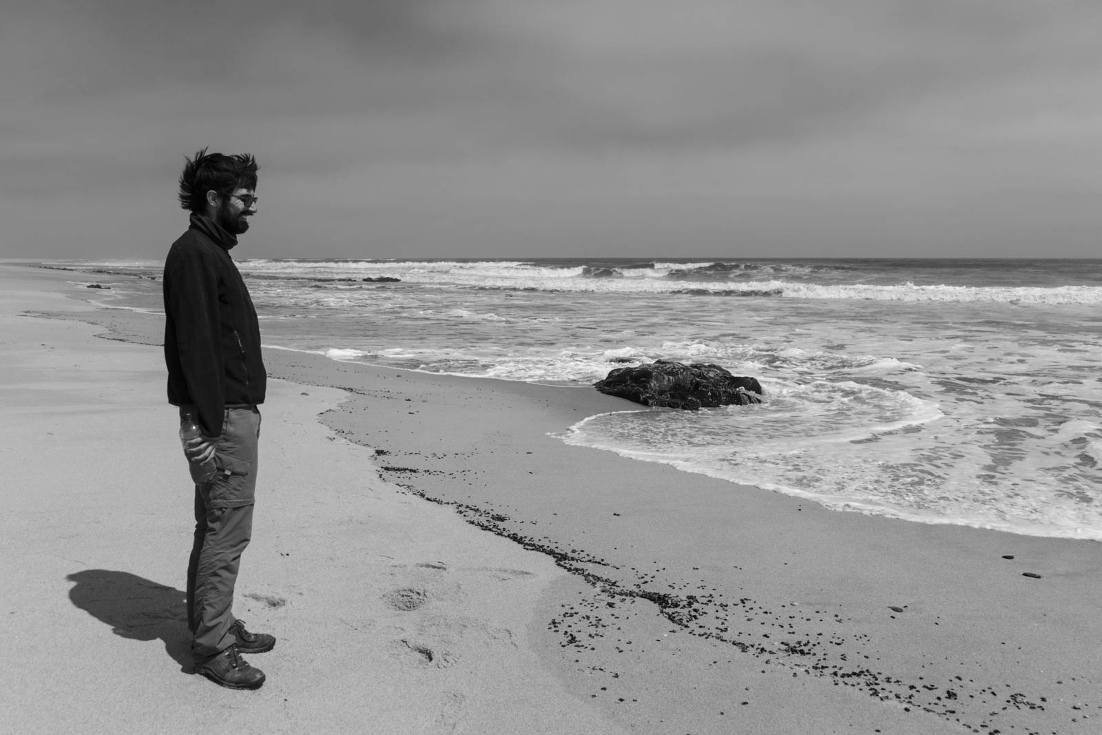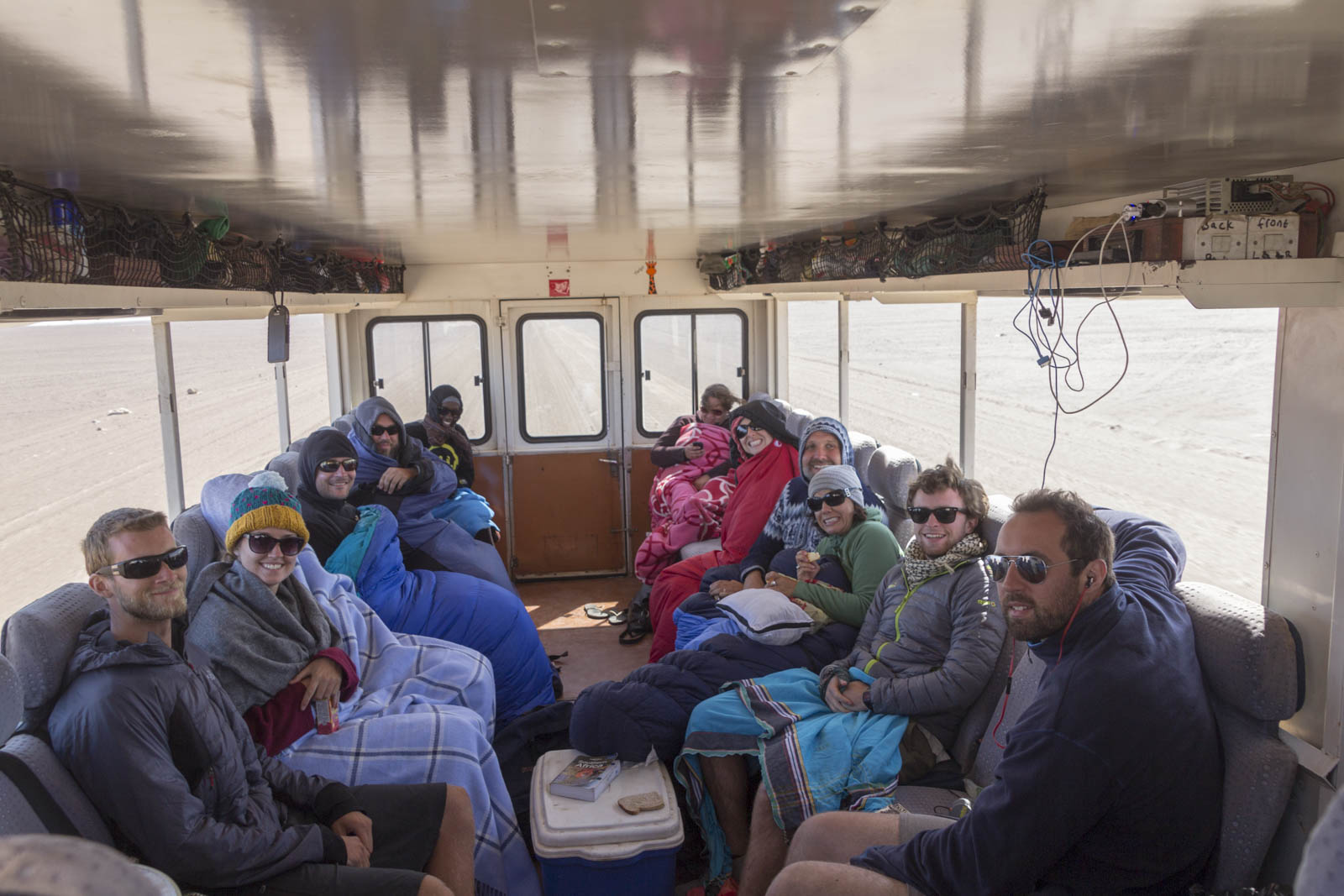 Le lendemain, nous poursuivons notre route dans ce décor des plus désertiques. La végétation a désormais disparu, et seuls quelques rares chacals viennent témoigner d’une présence de vie dans cet environnement. Cela marque notre entrée dans le Parc National de Skeleton Coast, cette région côtière du nord de la Namibie qui porte bien son nom, car les seules traces de vie qu’on y trouve sont désormais à l’état de squelettes. Et le décor est à peine croyable : un désert de pierres et de sable qui longe l’océan, extrêmement aride, mais gris et glacial en cette saison. Dans le truck, on est d’ailleurs tous gelés !