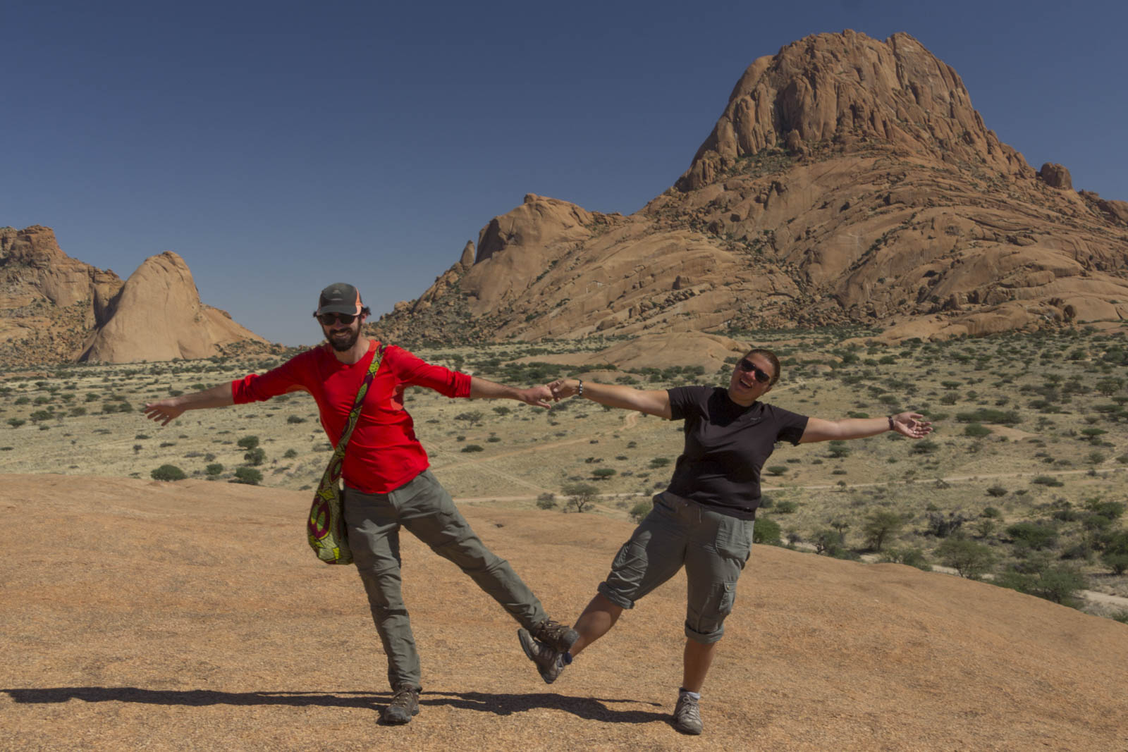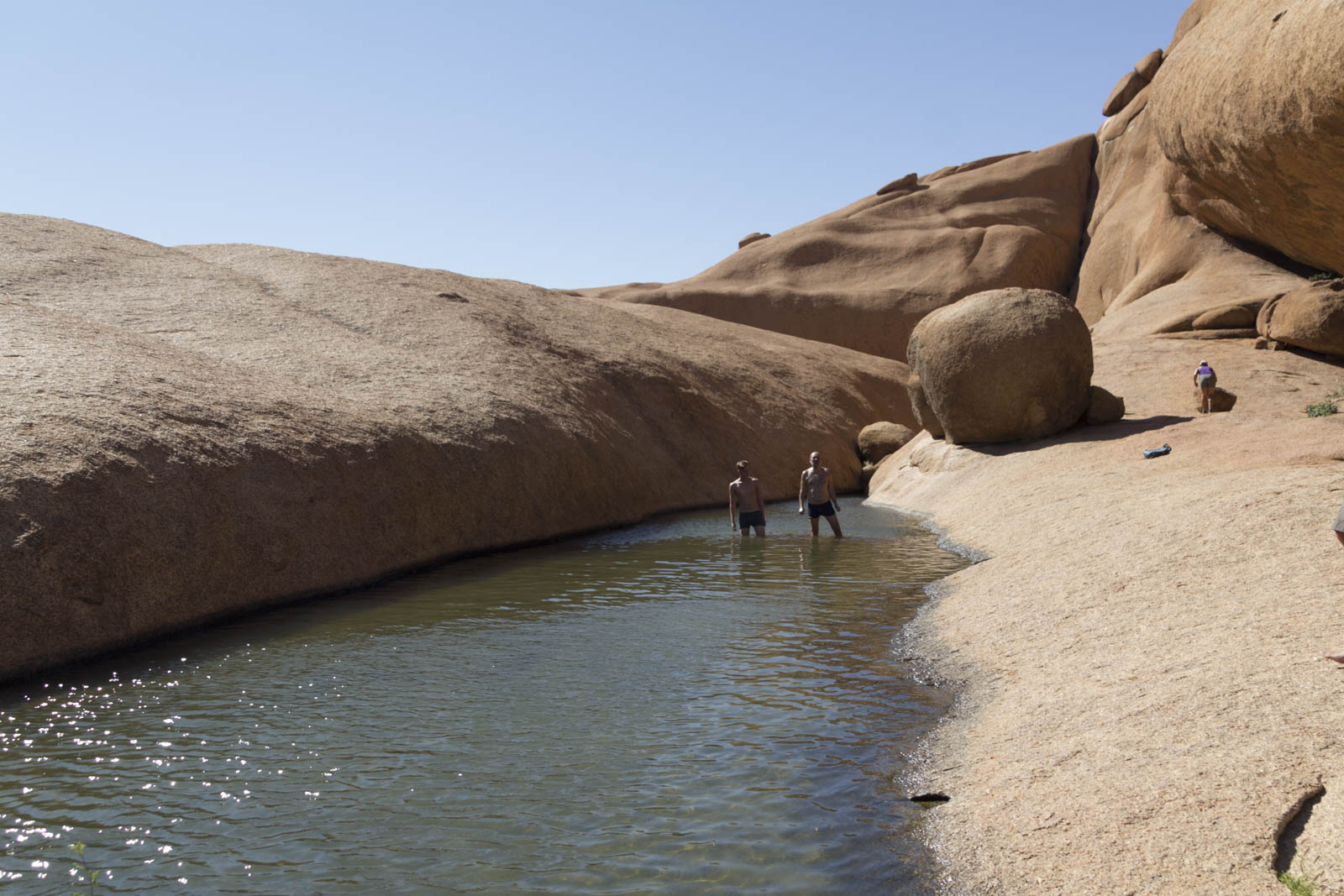 Et puis, quelques heures plus tard, nous bifurquons vers l’intérieur des terres. Très rapidement, la température dans le truck remonte en flèche, la brume se dissipe, la route s’élève et nous nous retrouvons à Spitzkoppe, dans un décor complètement différent. Nous quittons nos duvets, nos coupe-vents et nos polaires et partons nous balader au milieu d’énormes blocs de granit rouge, sous un soleil de plomb. Il ne manquera que nos maillots de bain, puisque Tabitha ne nous avait pas précisé qu’on arriverait à une magnifique piscine naturelle propice à la baignade. Le paysage rappelle à certains le désert du centre de l’Australie. Nous, on ne connaît pas – encore ? -, mais on les croit sur parole. Quant à la piscine naturelle, les garçons en profiteront quand même pour se rafraîchir en caleçon. Désolés les filles.