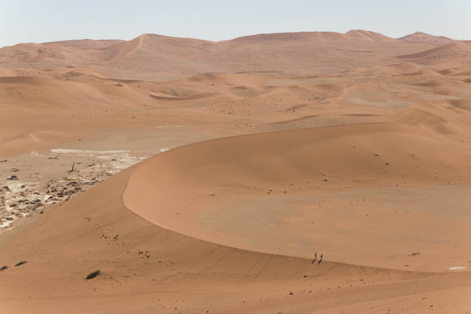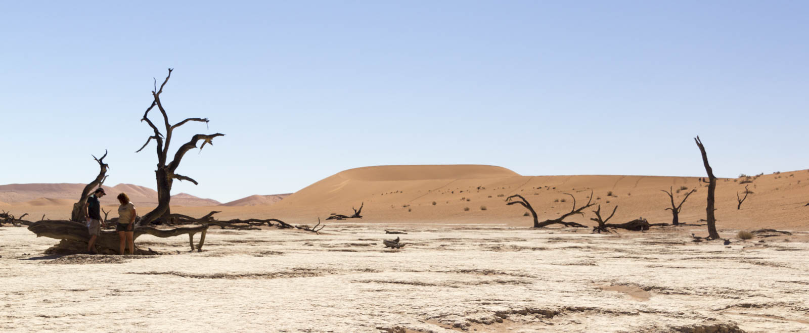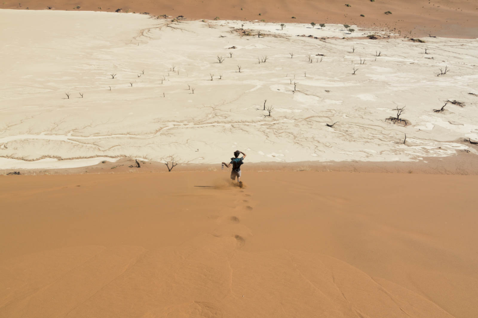 Pour nous, c’est le moment de faire un peu d’exercice, et nous nous lançons à l’assaut de ces énormes tas de sable. Celui-ci brûle sous nos pieds et à chaque pas nous nous enfonçons davantage dans le sable très fin, mais en continuant notre ascension nous finissons par apercevoir de l’autre côté une grande étendue blanche, un sol rocailleux recouvert de quelques arbres noirs, complètement cramés. On a comme l’impression que les dunes se sont refermées sur eux, jusqu’à les étouffer. En réalité, cette étendue blanche est un deadvlei. Avant, une rivière coulait ici, permettant le développement de cette végétation. Mais le désert a gagné du terrain, inexorablement, et la rivière a fini par disparaître, abandonnant ces arbres à la sécheresse. Et tout est resté comme figé dans cette espace sans vie.