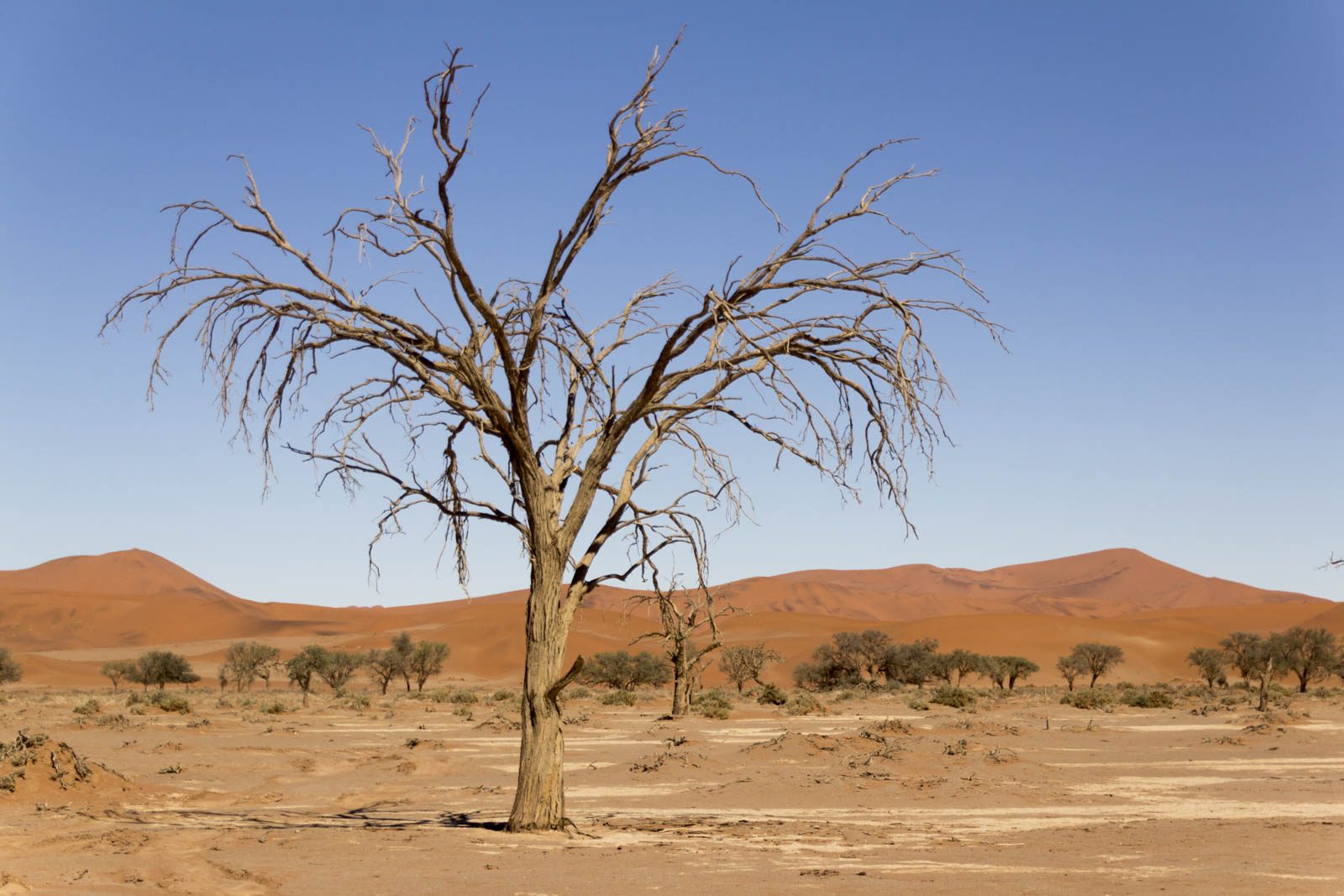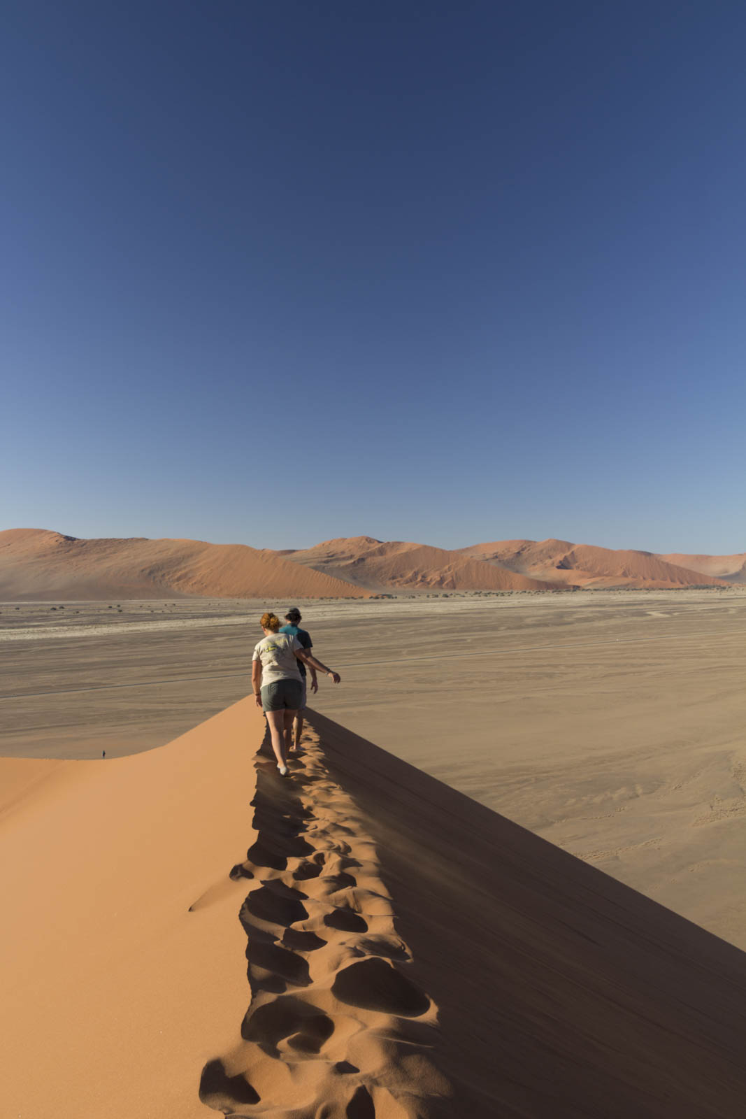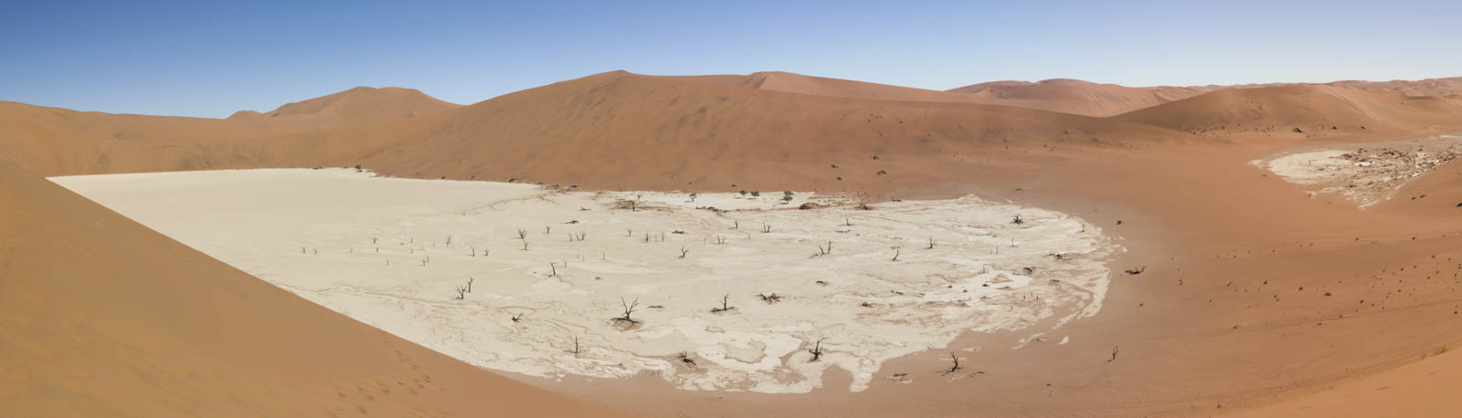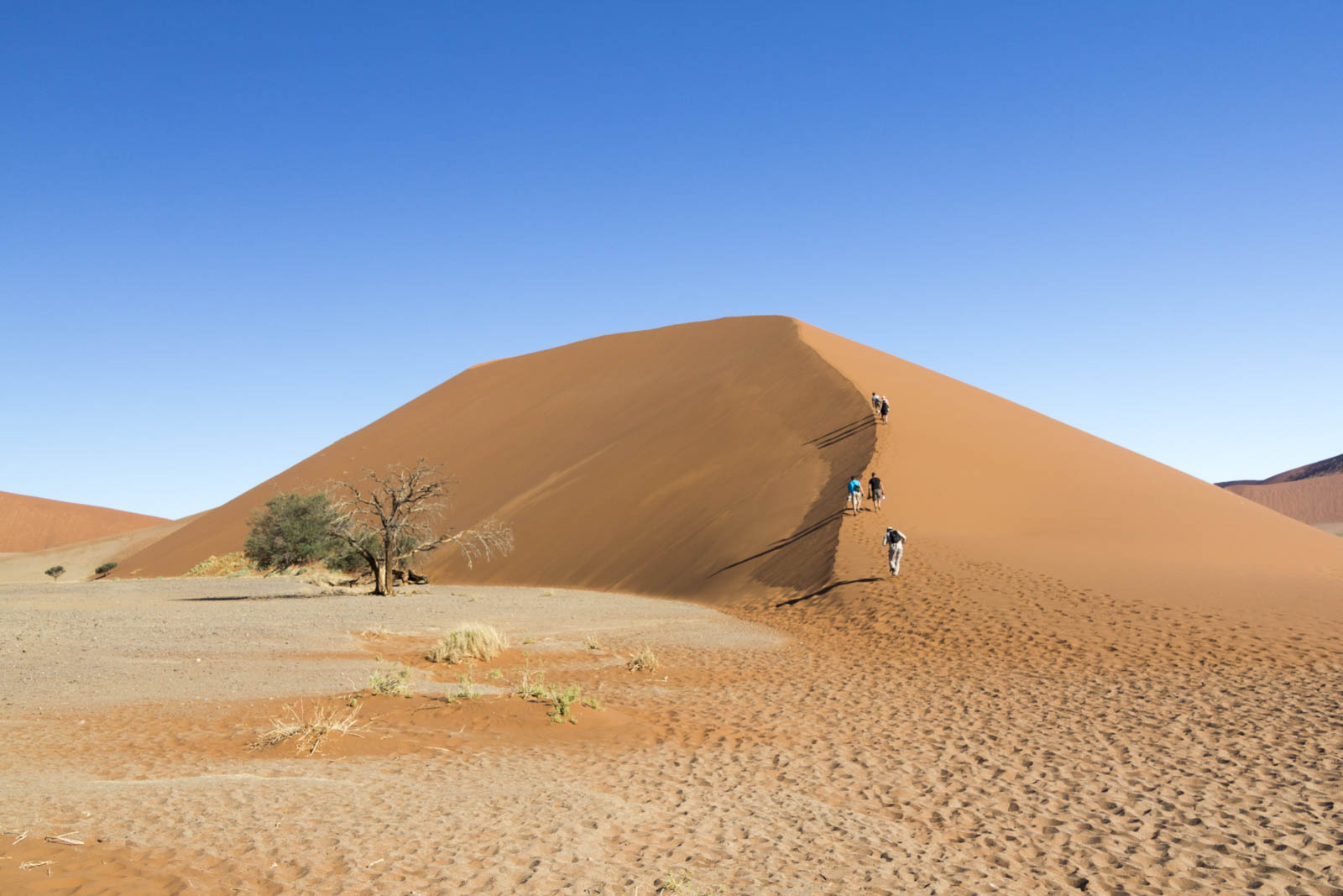 Pour nous, c’est le moment de faire un peu d’exercice, et nous nous lançons à l’assaut de ces énormes tas de sable. Celui-ci brûle sous nos pieds et à chaque pas nous nous enfonçons davantage dans le sable très fin, mais en continuant notre ascension nous finissons par apercevoir de l’autre côté une grande étendue blanche, un sol rocailleux recouvert de quelques arbres noirs, complètement cramés. On a comme l’impression que les dunes se sont refermées sur eux, jusqu’à les étouffer. En réalité, cette étendue blanche est un deadvlei. Avant, une rivière coulait ici, permettant le développement de cette végétation. Mais le désert a gagné du terrain, inexorablement, et la rivière a fini par disparaître, abandonnant ces arbres à la sécheresse. Et tout est resté comme figé dans cette espace sans vie.