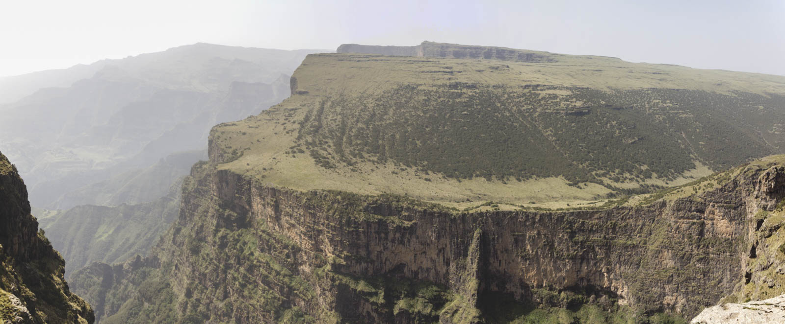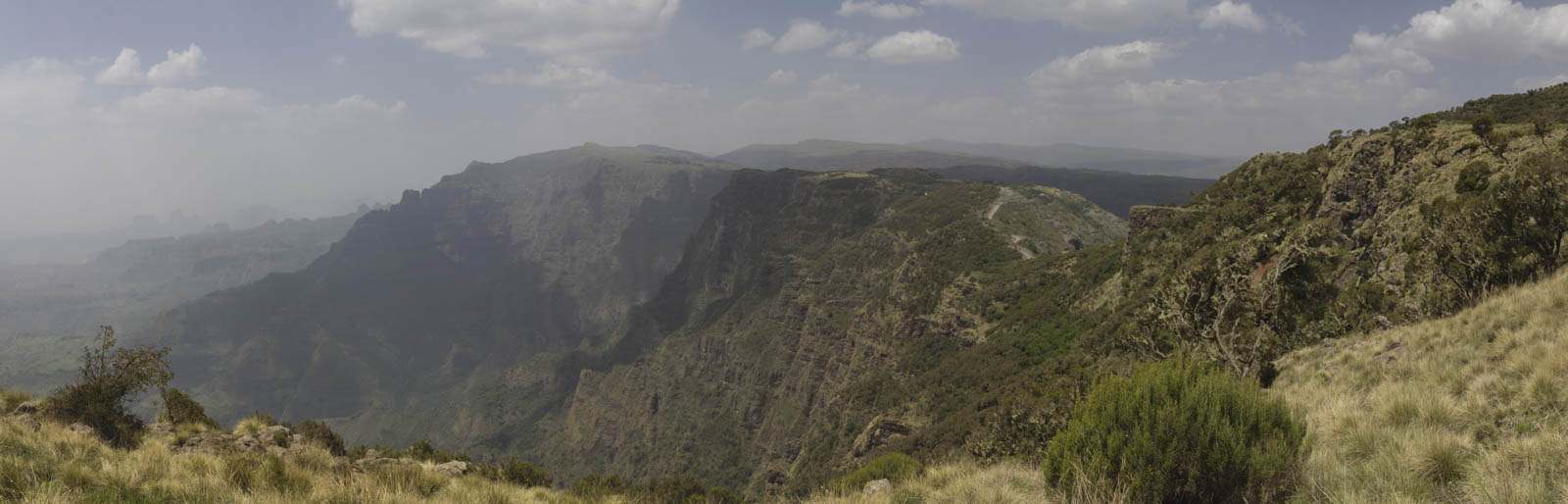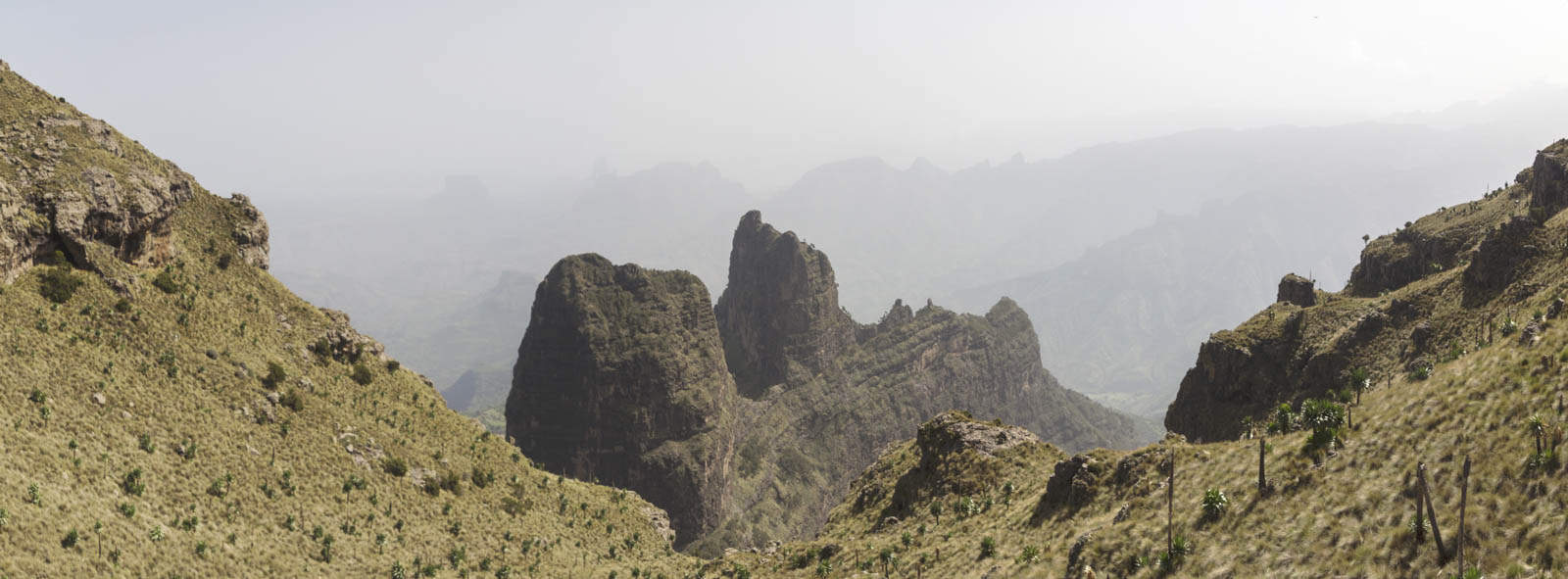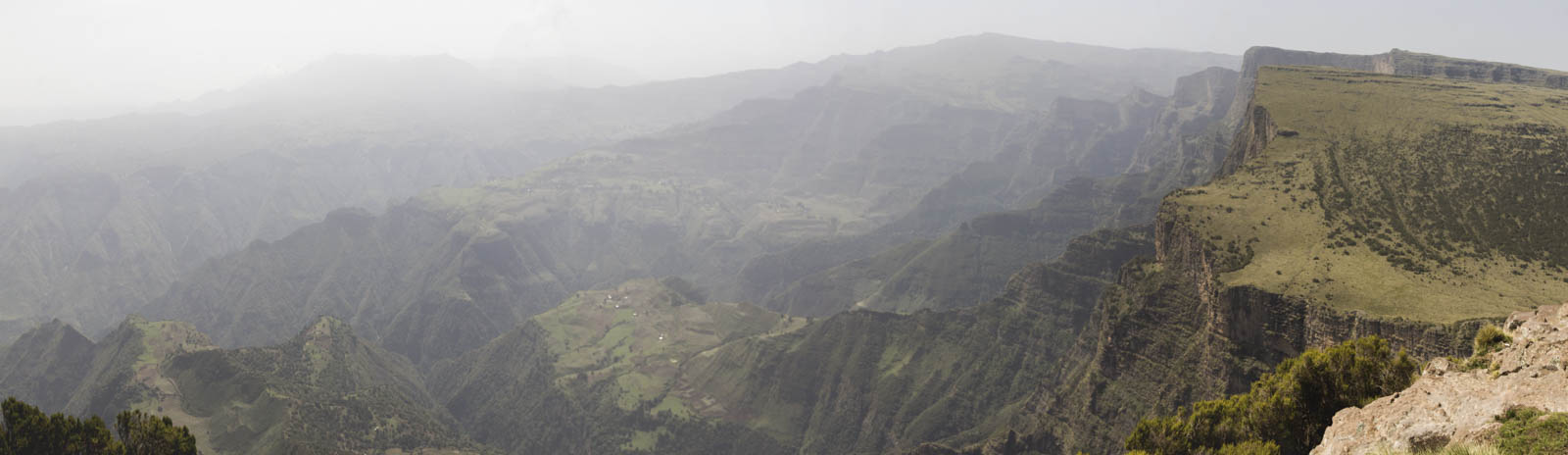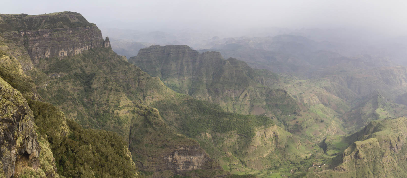 La première journée est plutôt une marche d’acclimatation. Nous restons à une altitude comprise entre 3100 et 3300 mètres, pour un total de 13,5 km. Et très rapidement, nous découvrons nos premiers paysages d’Abyssinie. Des hauts plateaux fractionnés, écartés, soulevés, affaissés, collisionnés. Des pics rocheux abrupts et des falaises abyssales, de plus de 500 mètres de haut. Une végétation variée (grands arbres, arbustes, prairies) entourant des villages perdus, paraissant inaccessibles. Nous sommes déjà émerveillés. Et puis il y a ce voile de brouillard permanent, un mélange de nuages de sable, de poussière et de brume, qui enveloppe les plateaux et recouvre les vallées. Ce voile, qui ne s’est pas levé une fois au cours du trek, nous a empêchés de voir la silhouette des montagnes découper abruptement la ligne d’horizon. Ca enlève un peu de photogénie aux lieux, mais rajoute un caractère mystérieux, quasi mystique. On ressent encore plus le caractère inhospitalier et reculé de la région. Et à chaque passage de crête, on découvre une nouvelle vallée et de nouveaux plateaux, qui sembleraient s’étendre ainsi à l’infini.