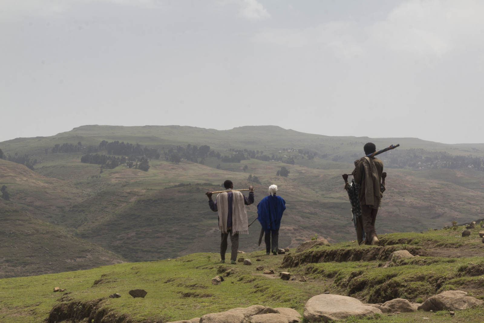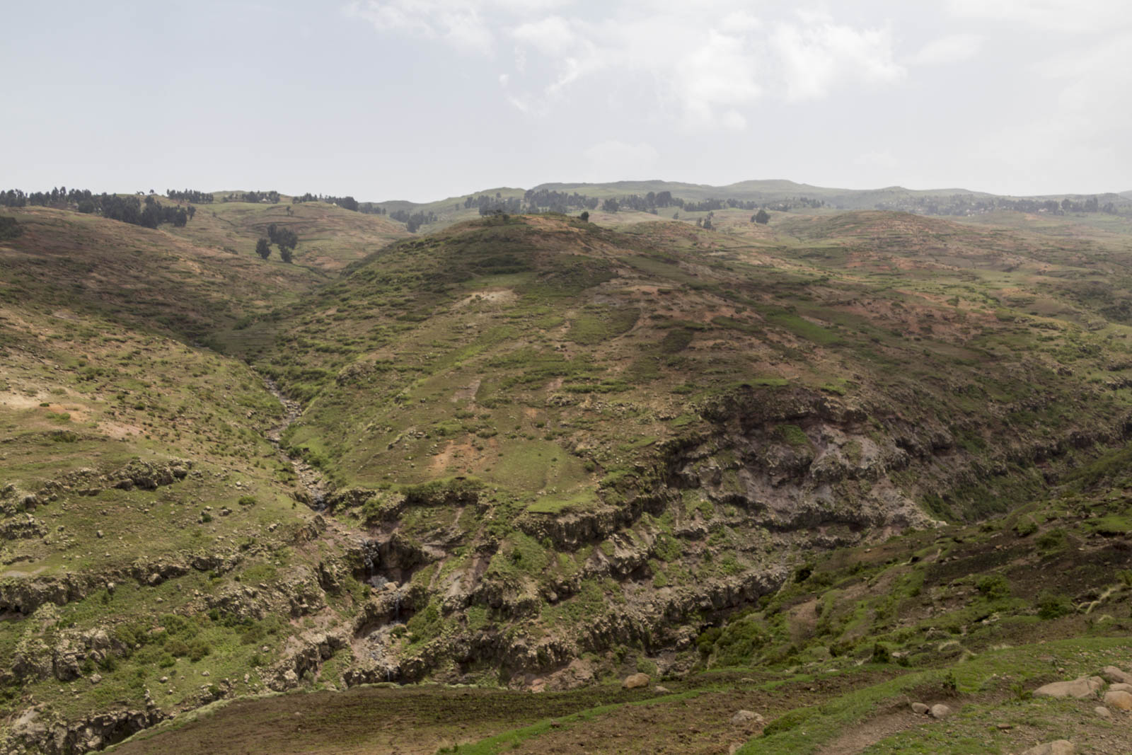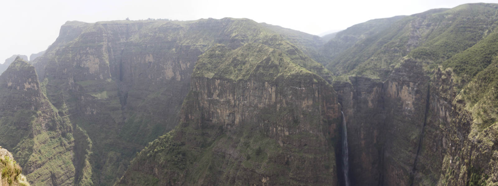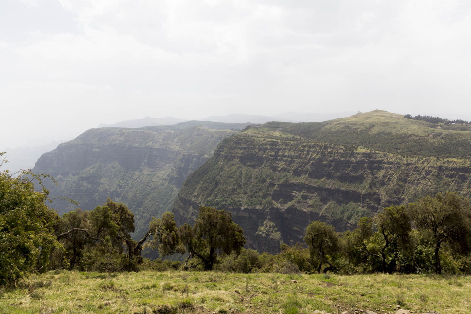 La première journée est plutôt une marche d’acclimatation. Nous restons à une altitude comprise entre 3100 et 3300 mètres, pour un total de 13,5 km. Et très rapidement, nous découvrons nos premiers paysages d’Abyssinie. Des hauts plateaux fractionnés, écartés, soulevés, affaissés, collisionnés. Des pics rocheux abrupts et des falaises abyssales, de plus de 500 mètres de haut. Une végétation variée (grands arbres, arbustes, prairies) entourant des villages perdus, paraissant inaccessibles. Nous sommes déjà émerveillés. Et puis il y a ce voile de brouillard permanent, un mélange de nuages de sable, de poussière et de brume, qui enveloppe les plateaux et recouvre les vallées. Ce voile, qui ne s’est pas levé une fois au cours du trek, nous a empêchés de voir la silhouette des montagnes découper abruptement la ligne d’horizon. Ca enlève un peu de photogénie aux lieux, mais rajoute un caractère mystérieux, quasi mystique. On ressent encore plus le caractère inhospitalier et reculé de la région. Et à chaque passage de crête, on découvre une nouvelle vallée et de nouveaux plateaux, qui sembleraient s’étendre ainsi à l’infini.