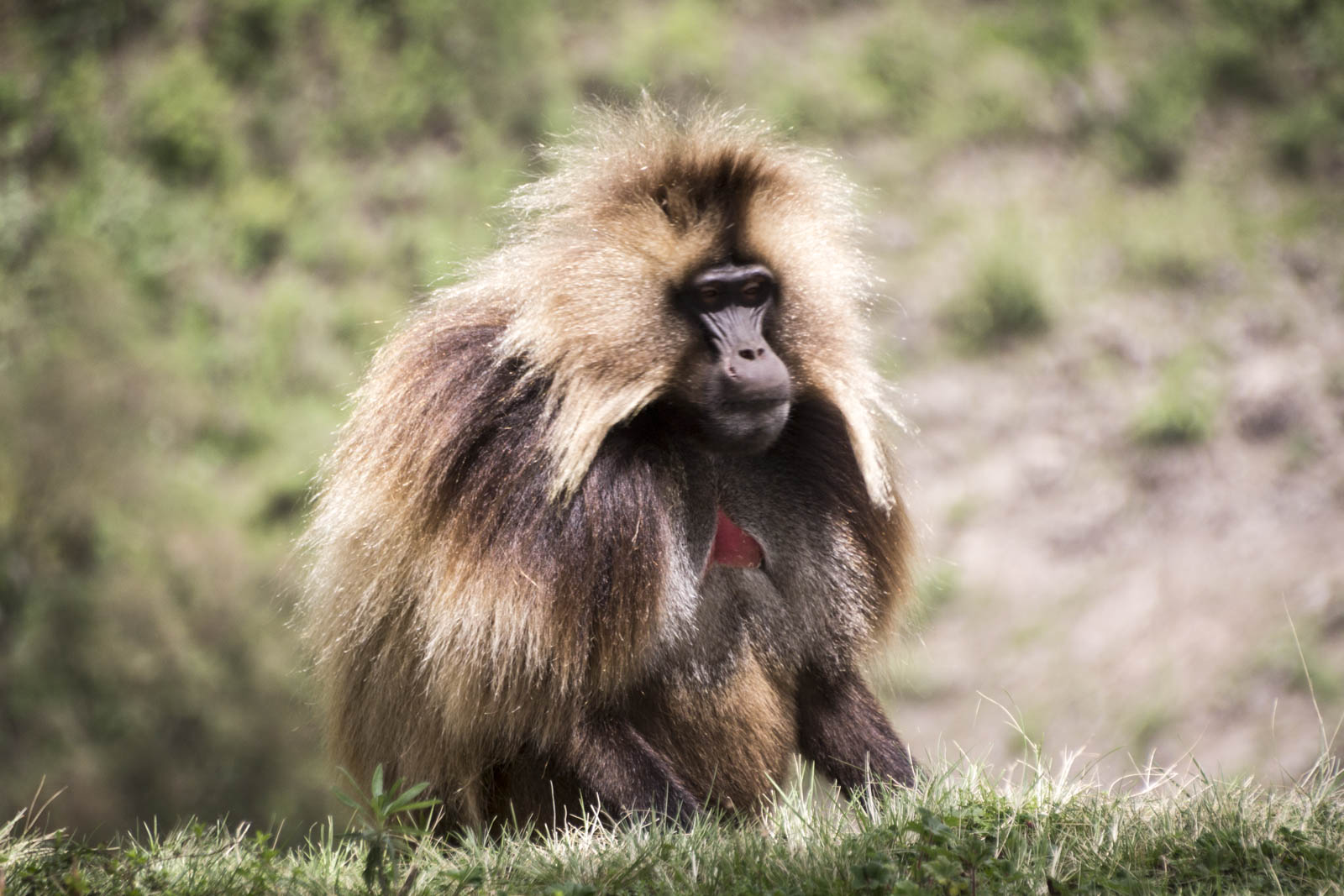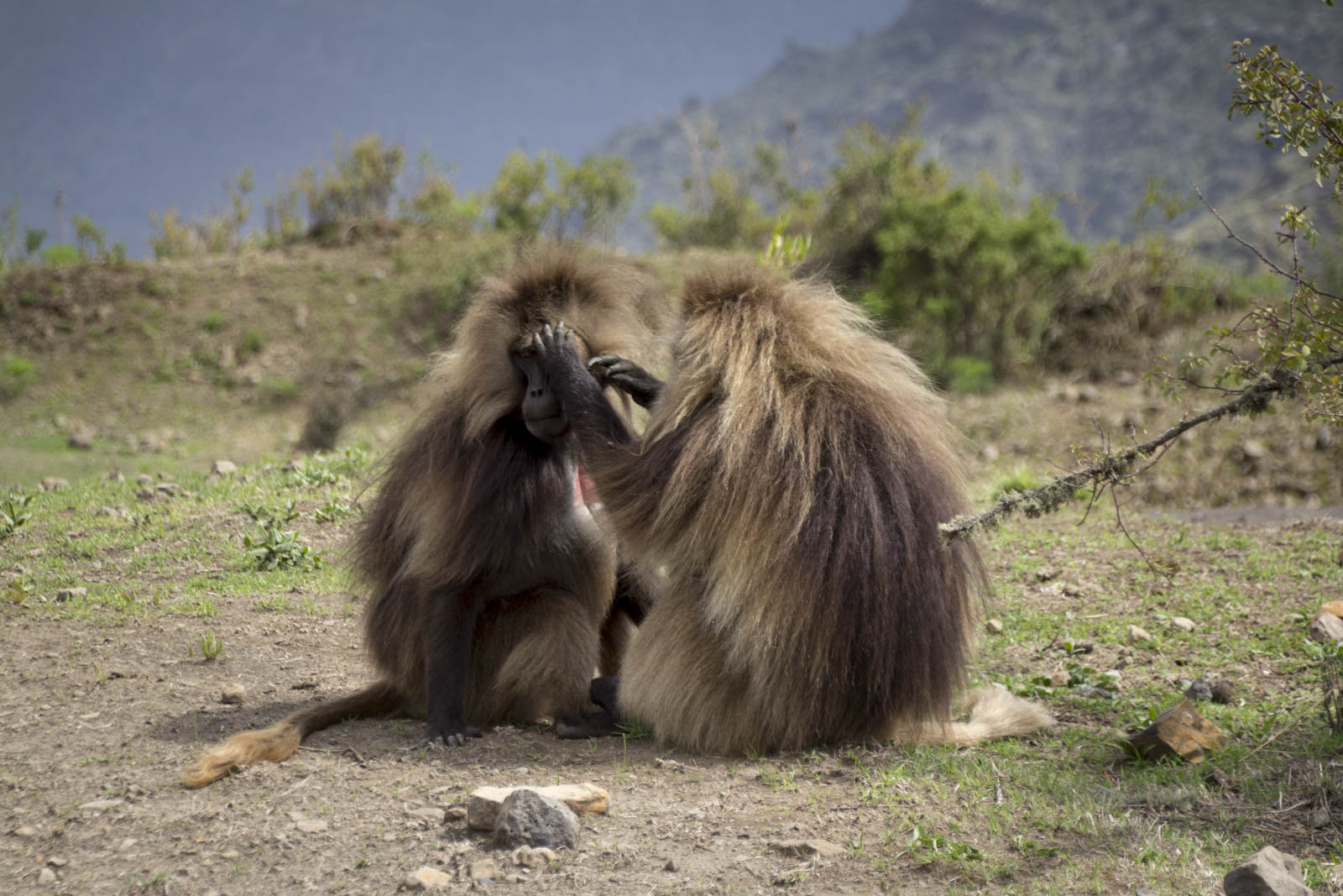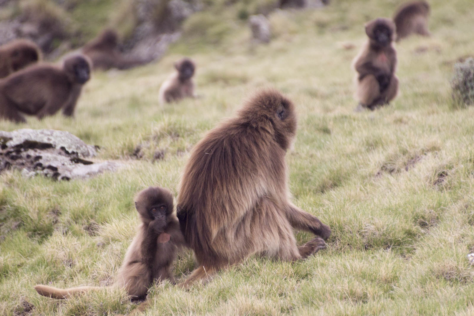 En ce premier jour, nous rencontrons aussi nos premiers babouins gelada. Bon techniquement, ce ne sont pas à proprement parler des babouins, même s’ils appartiennent à la même famille des cercopithécidés (il est pas beau celui-là ? :) ). Mais en dehors de ces grands mots, ces primates ressemblent quand même assez fort à des babouins. Leur caractéristique principale est cette peau apparente sur la poitrine et non sur les fesses, comme chez les babouins. Les mâles paraissent bien plus gros que les femelles, avec une grosse crinière sur la tête qui fait qu’on les appelle parfois « singe-lion ». D’ailleurs, un des passe-temps favori des femelles est de chercher des insectes dans le pelage de leur mâle, et de les manger. C’est très rigolo de les observer ainsi. Et quand ils ne mangent pas des insectes capillaires, les gelada restent assis par terre, dans l’herbe, à grignoter méticuleusement des brins d’herbe. Vraiment, on les a trouvés superbes, ces primates.