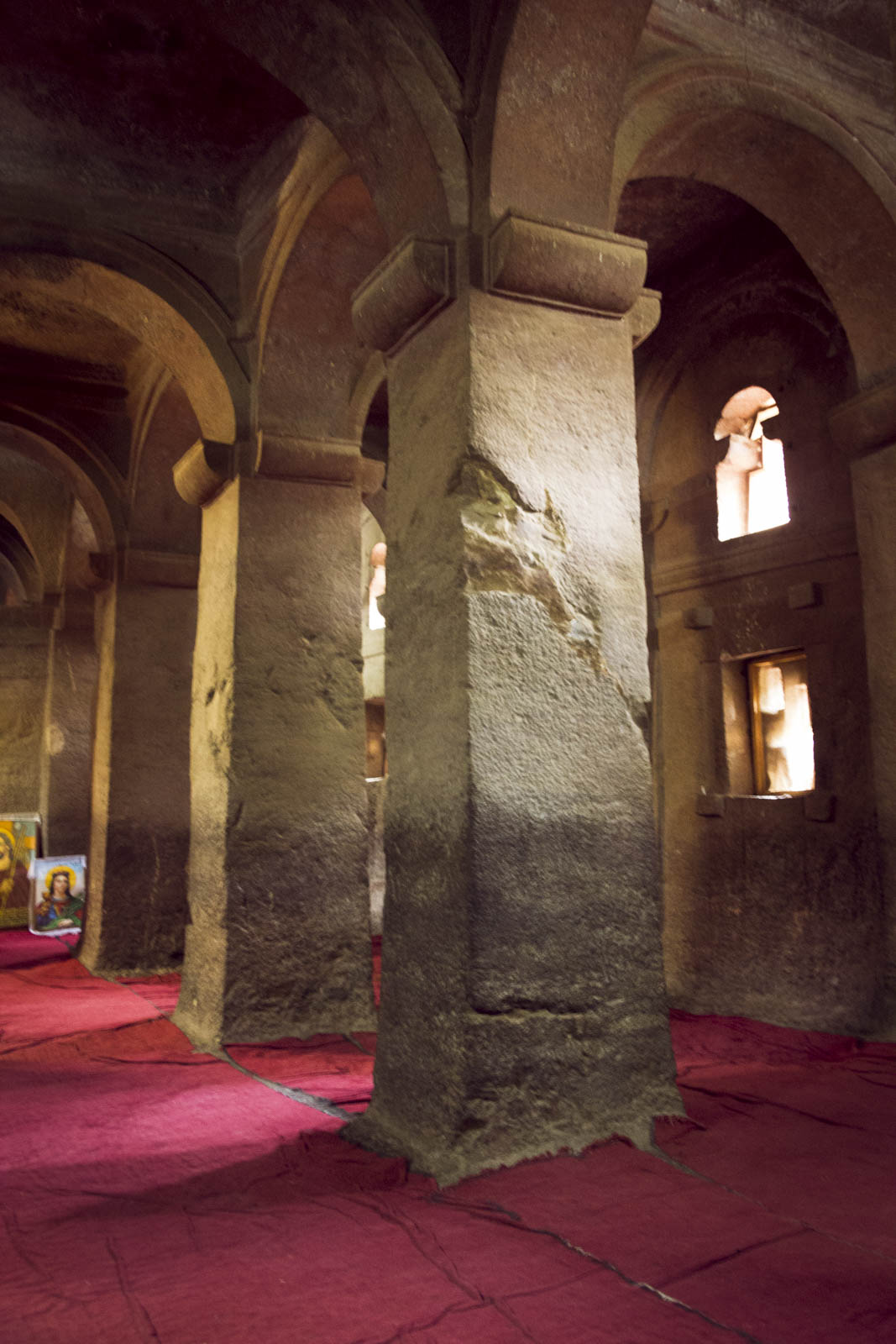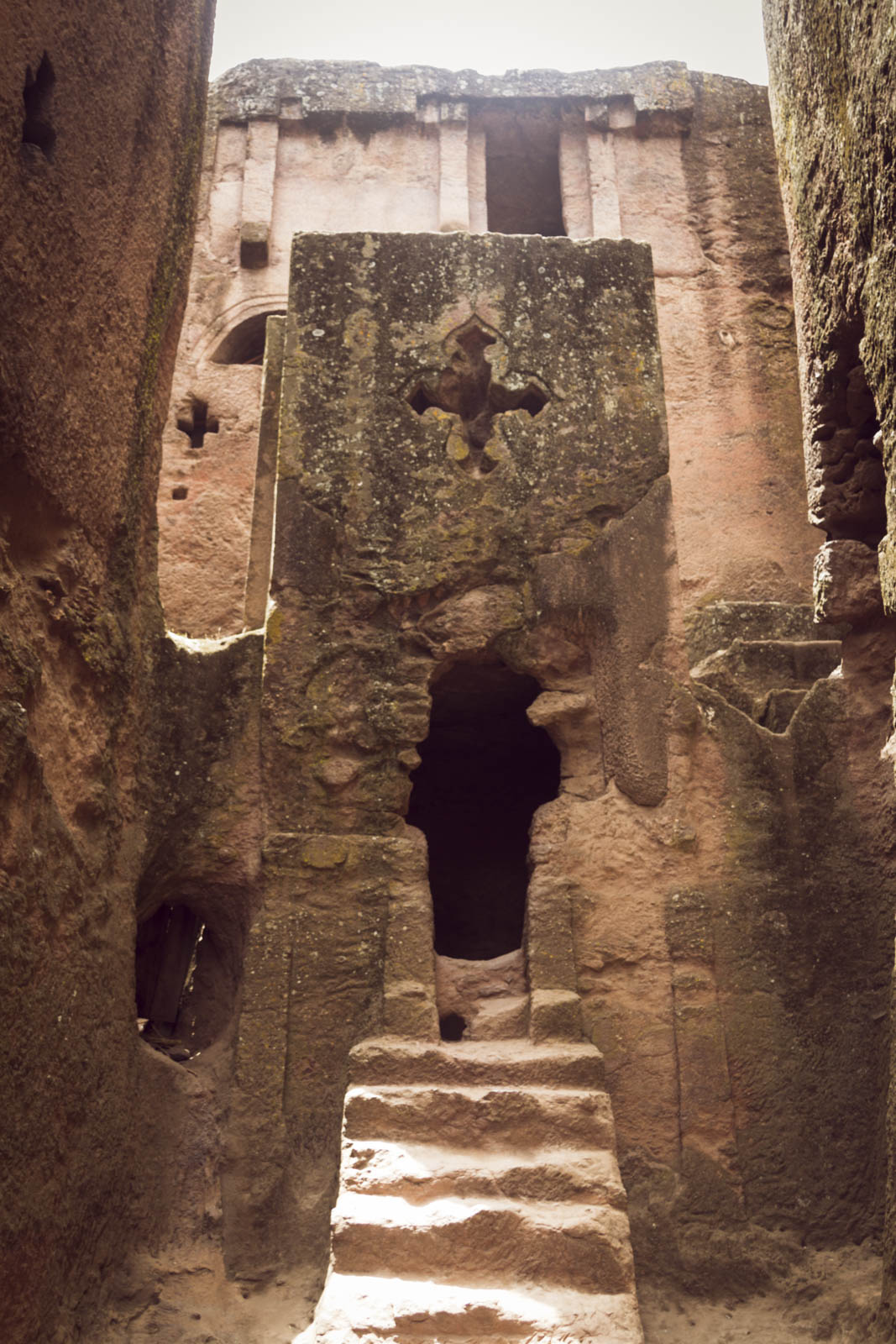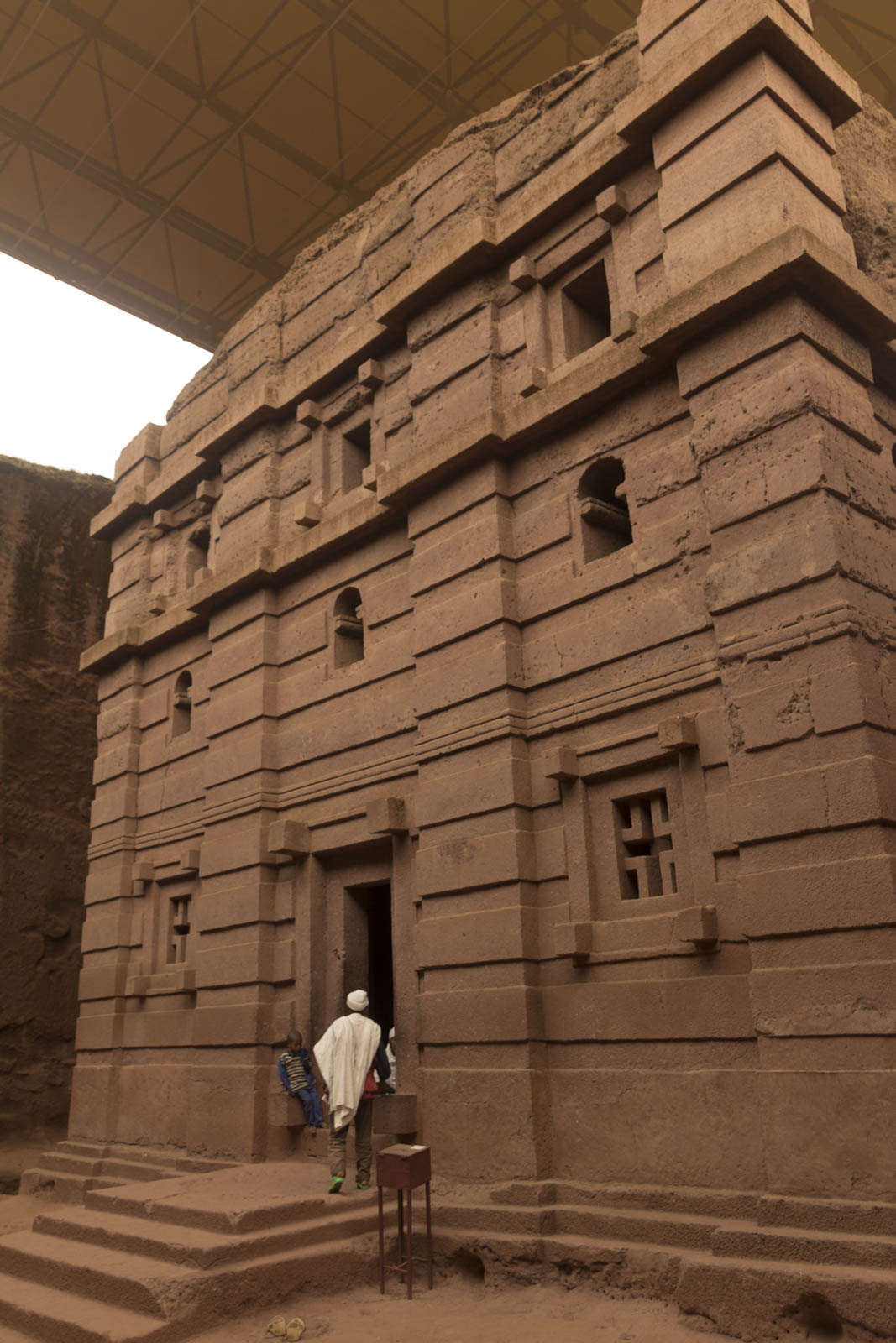 Mais la plus belle église reste quand même Bet Gyorgis, l’église Saint Georges. Elle est un peu excentrée par rapport aux autres, mais a la particularité de ne pas avoir de toit Unesco. Elle a la forme d’une magnifique croix orthodoxe. Cet église semble être un majestueux bloc de pierre, tout droit sorti du sol. Mais c’est l’inverse, tout a été creusé avec les petits outils de l’époque. Un travail remarquable, qui donne toute la mesure de cette œuvre titanesque. L’intérieur, en revanche, est comme pour les autres un peu exigu et moins intéressant.