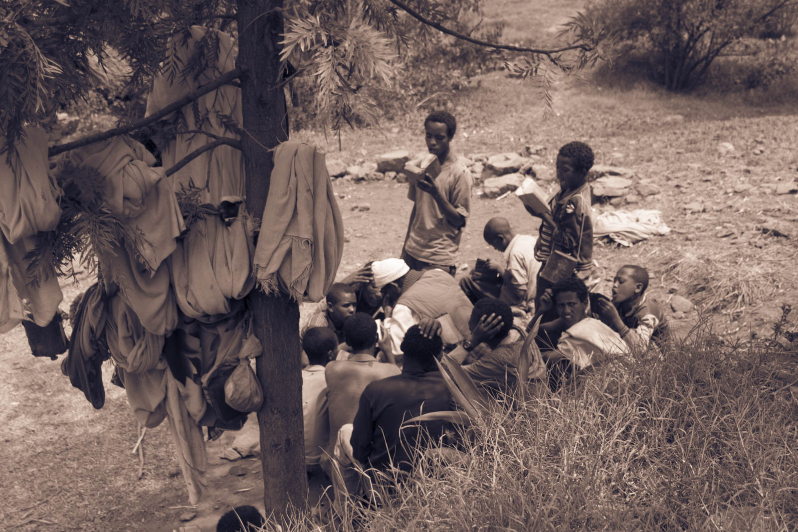 En tout cas Lalibela, bien que touristique, est un site incontournable d’Ethiopie. Pour les églises massives et l’impressionnant travail architectural réalisé, mais aussi pour la ferveur qui règne sur le site. Si nous n’avons pas assisté à une messe matinale, nous avons vu tout au long de la journée des gens vêtus de blanc venir prier, plutôt de façon solitaire aux abords des différentes églises. Et de nombreux enfants, à l’école orthodoxe, écouter et réciter religieusement les textes anciens. Une ambiance très particulière.