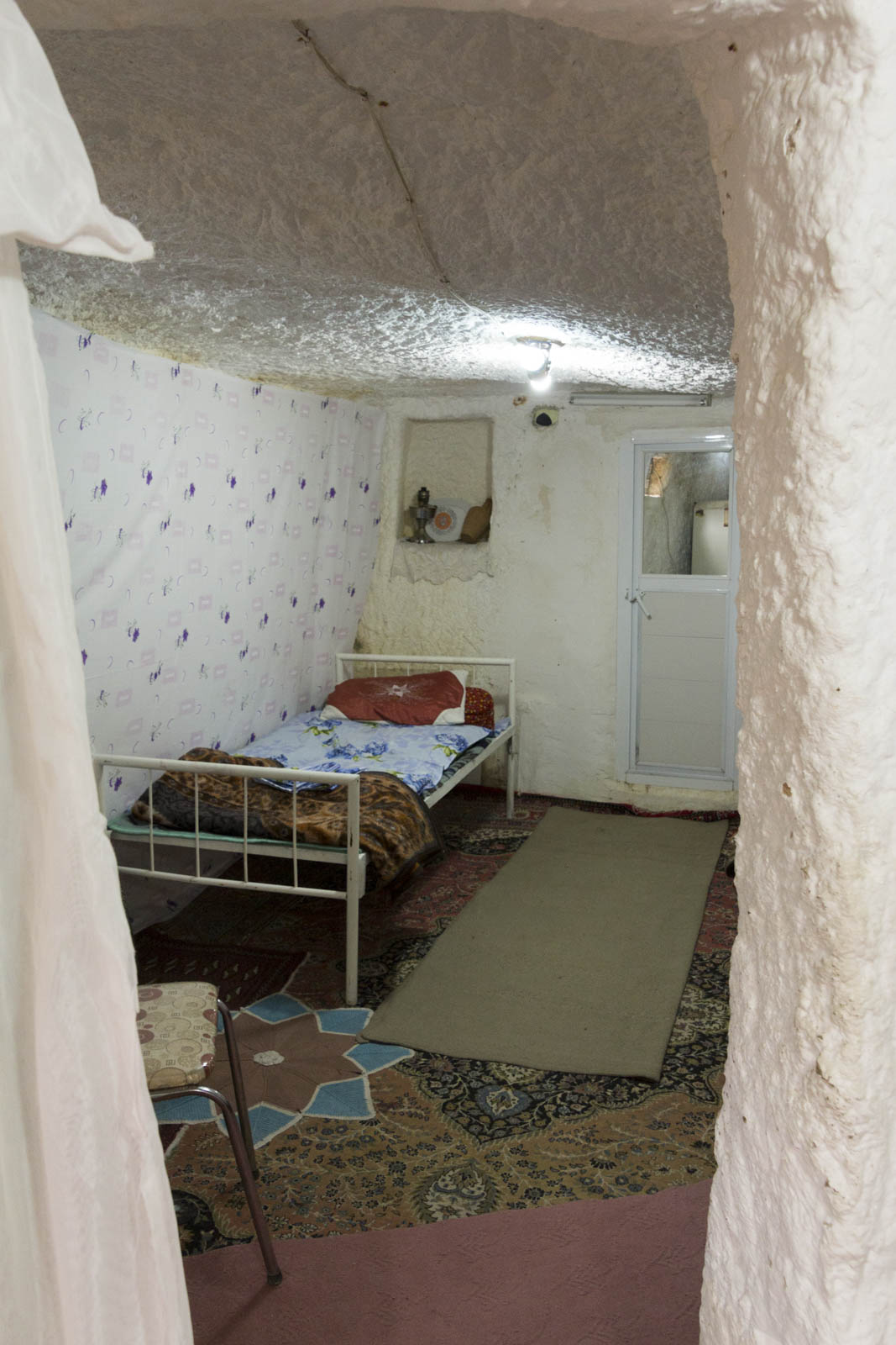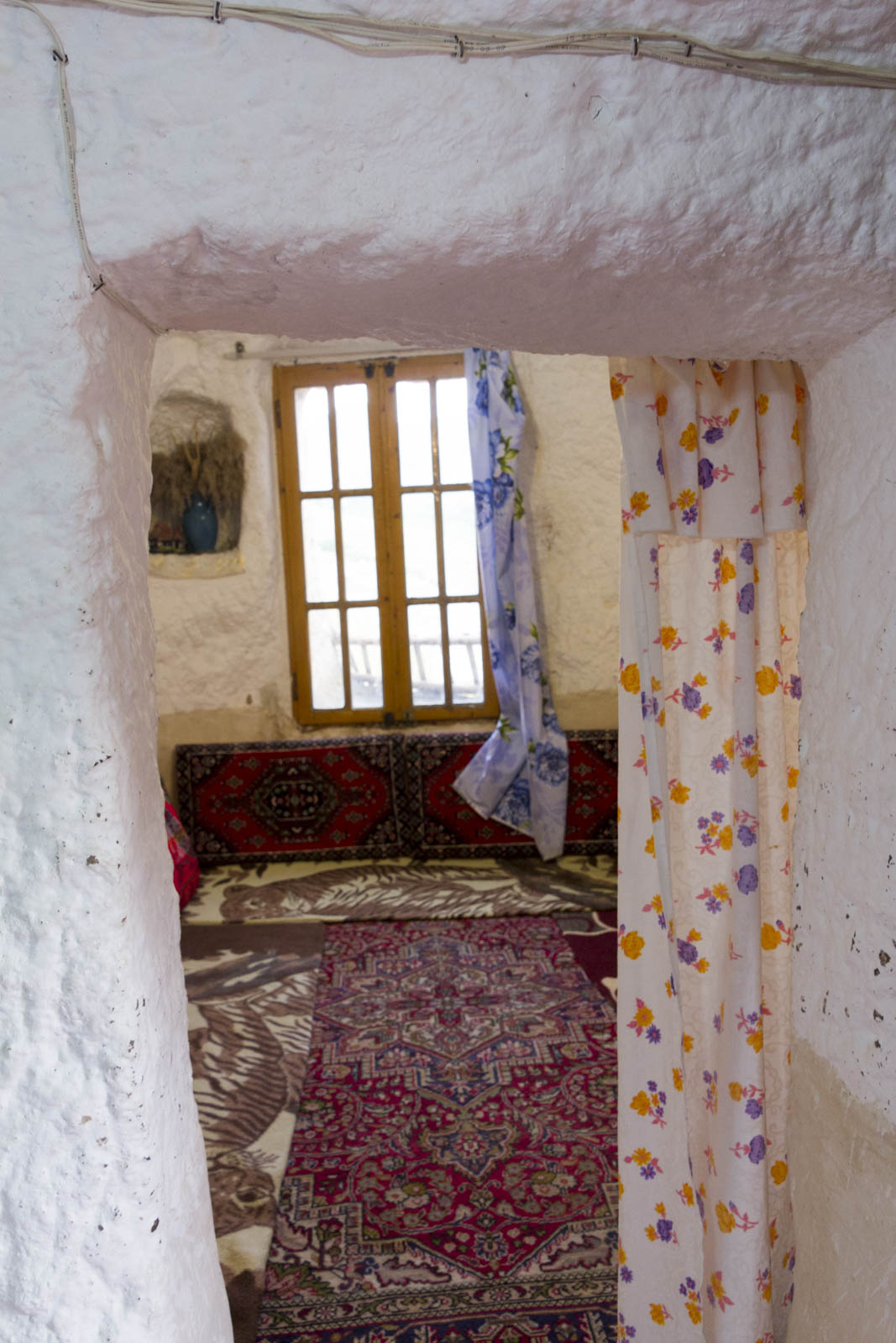Tout en haut du village, on peut voir son étendue actuelle, qui va bien au-delà de la rivière en contrebas de la montagne. Là-haut, alors qu’on s’est mis à l’abri pour laisser passer une averse, un homme nous aborde et nous explique que ses parents vivent dans la maison juste en face, une habitation troglodyte traditionnelle. Il nous invite à venir la visiter, alors on ne se fait pas prier. On se déchausse et rentre dans un vestibule étroit et bas de plafond. Un lavabo avec de l’eau courante est en face de nous. A notre gauche, une pièce à vivre avec de grands tapis au sol et de nombreux coussins, un endroit où l’on vient lire, prier, manger… A notre droite, une pièce pour dormir, se changer, cuisiner, se laver. C’est plutôt simple, mais l’homme nous apprend que tout cela a été excavé de la montagne, au rythme de 1 mètre cube par jour !