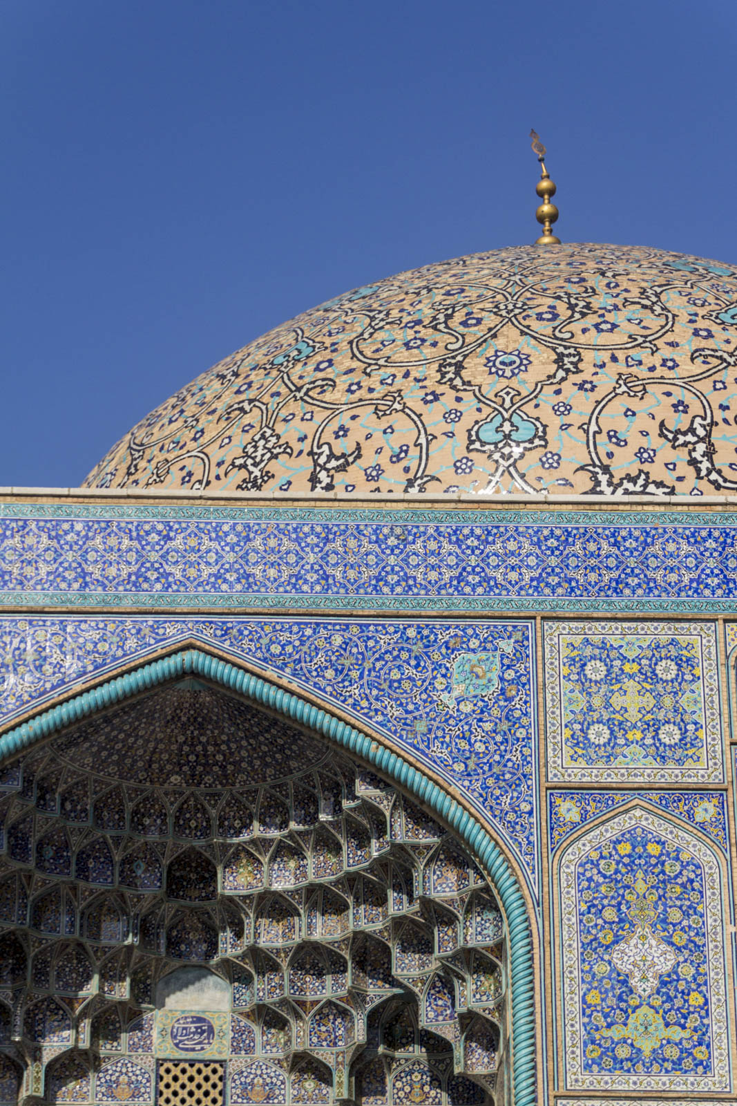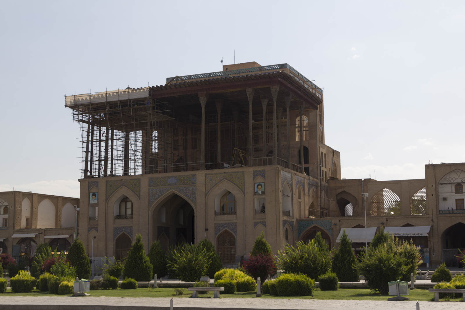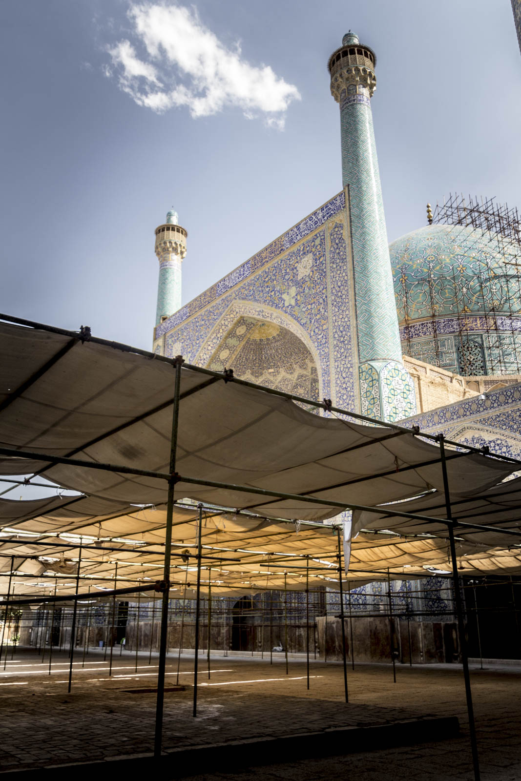 Et de chaque côté de la place on trouve un édifice remarquable. Au Nord, l’entrée de l’immense bazar. A l’Ouest, le palais d’Ali Qapu, une ancienne demeure royale, elle aussi en rénovation, décidément… Dommage car c’est du haut de ce palais que l’on est censé avoir la plus belle vue sur l’ensemble de la place. A l’Est, on trouve la somptueuse mosquée du Sheikh Loftallah, remarquable pour l’extrême finesse de ses faïences, ses mosaïques, sa luminosité, ses vitraux. Un véritable chef d’œuvre. Toutefois, l’un des rois de l’époque la trouvait trop petite à son goût. Il a donc fait construire, au Sud de la place cette fois, la grandiose mosquée de l’Imam avec sa grande place centrale ouverte, mais avec la vue malheureusement obstruée par un tas de bâches étendues là pour offrir un peu d’ombre aux fidèles pendant les prières pendant l’été. Vraiment dommage. On a néanmoins apprécié ses coupoles, ses tours et ses faïences peintes recouvrant tous les murs.