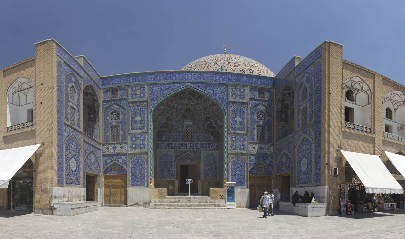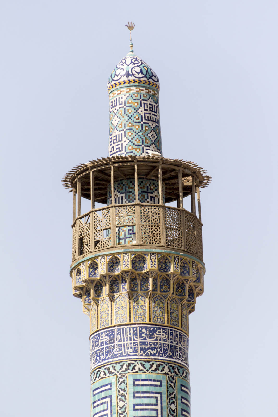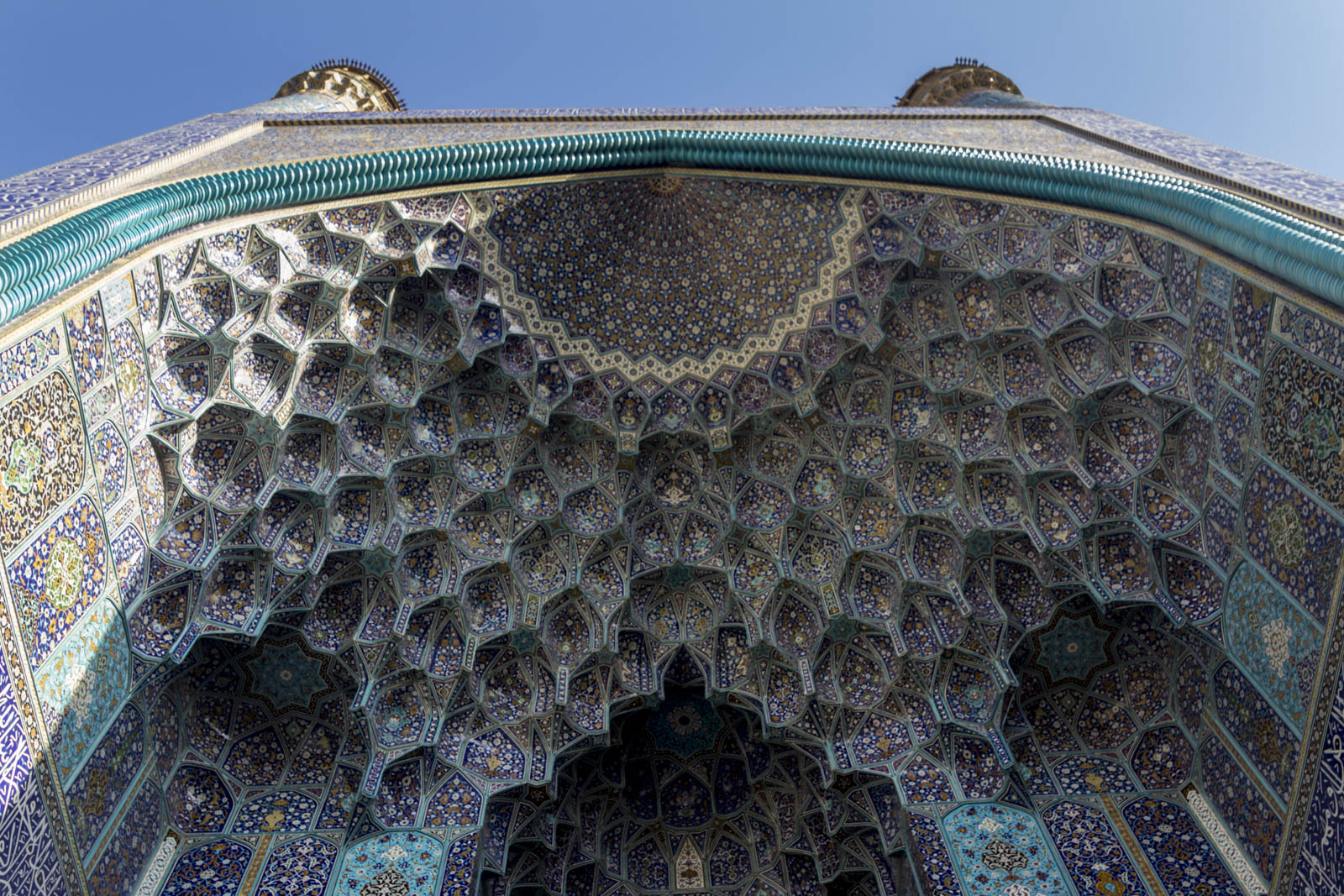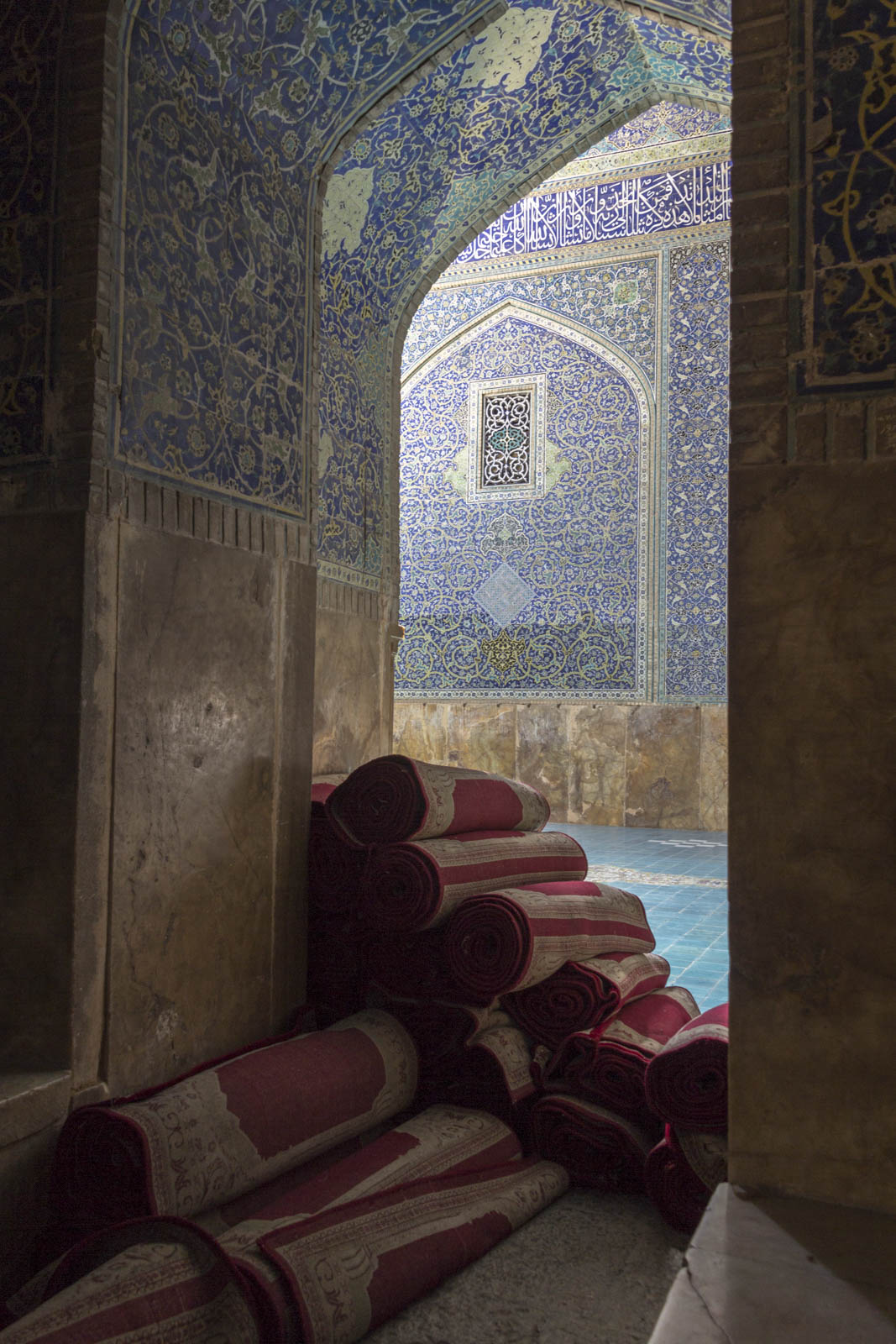 Et de chaque côté de la place on trouve un édifice remarquable. Au Nord, l’entrée de l’immense bazar. A l’Ouest, le palais d’Ali Qapu, une ancienne demeure royale, elle aussi en rénovation, décidément… Dommage car c’est du haut de ce palais que l’on est censé avoir la plus belle vue sur l’ensemble de la place. A l’Est, on trouve la somptueuse mosquée du Sheikh Loftallah, remarquable pour l’extrême finesse de ses faïences, ses mosaïques, sa luminosité, ses vitraux. Un véritable chef d’œuvre. Toutefois, l’un des rois de l’époque la trouvait trop petite à son goût. Il a donc fait construire, au Sud de la place cette fois, la grandiose mosquée de l’Imam avec sa grande place centrale ouverte, mais avec la vue malheureusement obstruée par un tas de bâches étendues là pour offrir un peu d’ombre aux fidèles pendant les prières pendant l’été. Vraiment dommage. On a néanmoins apprécié ses coupoles, ses tours et ses faïences peintes recouvrant tous les murs.