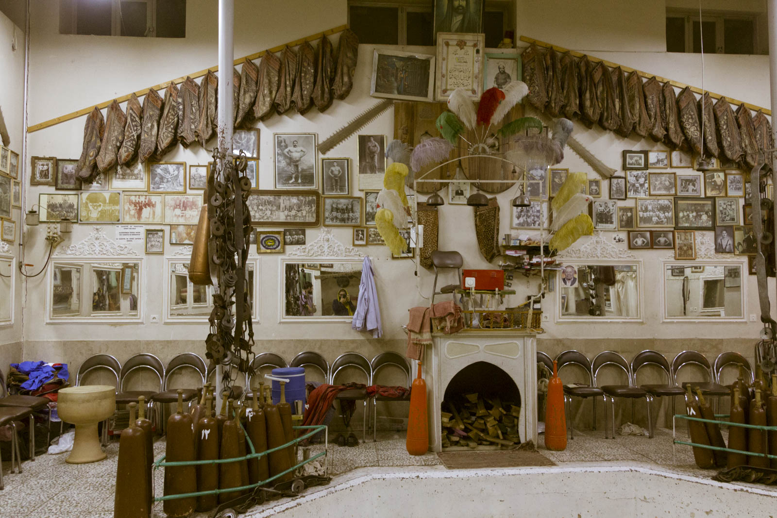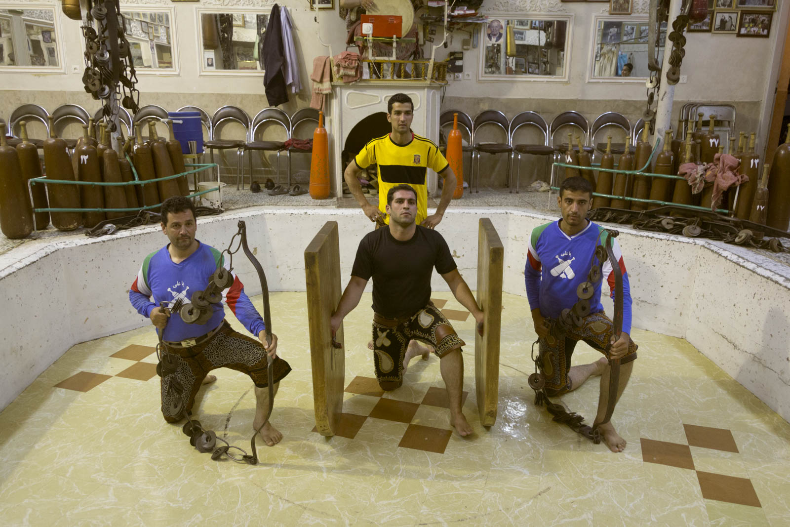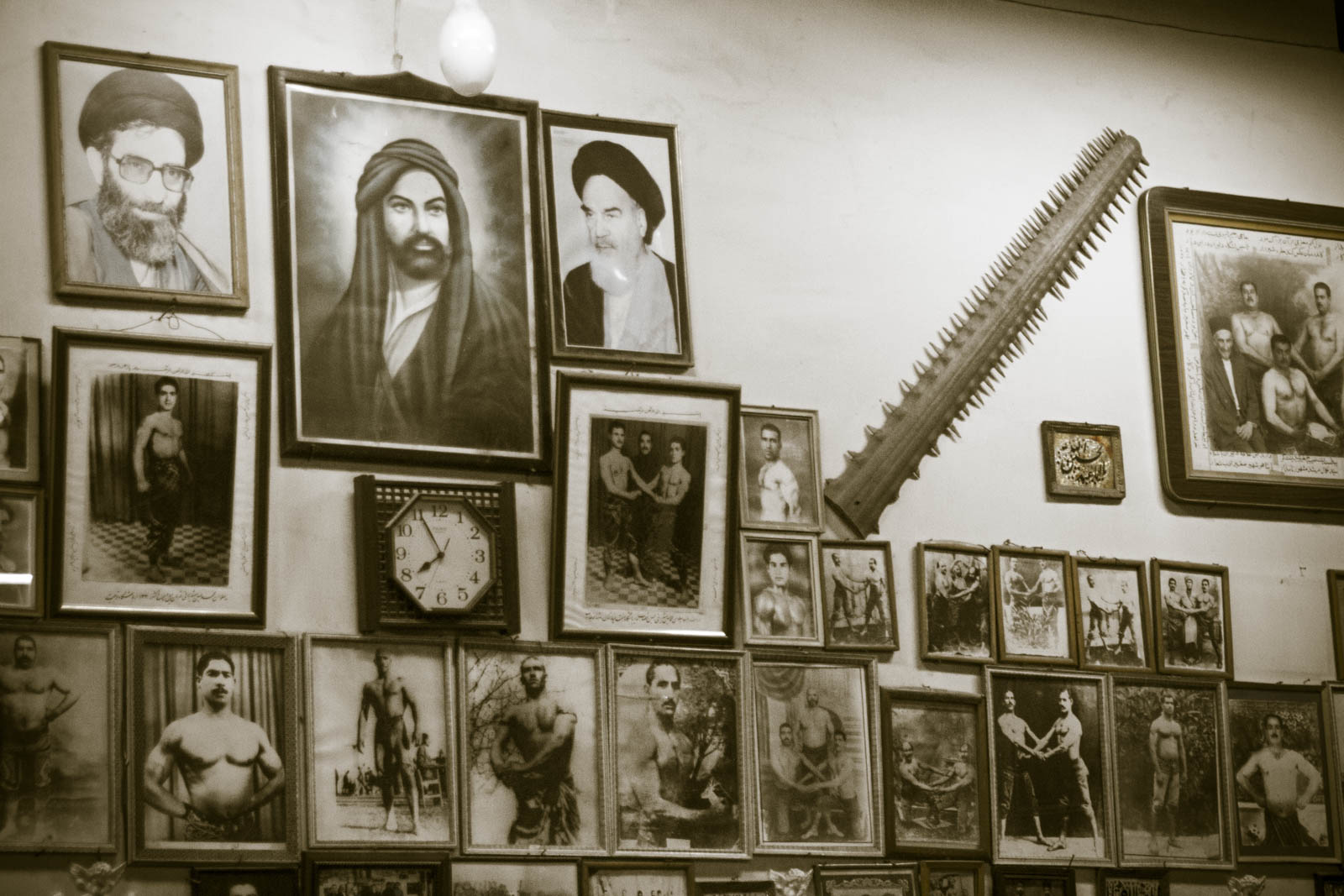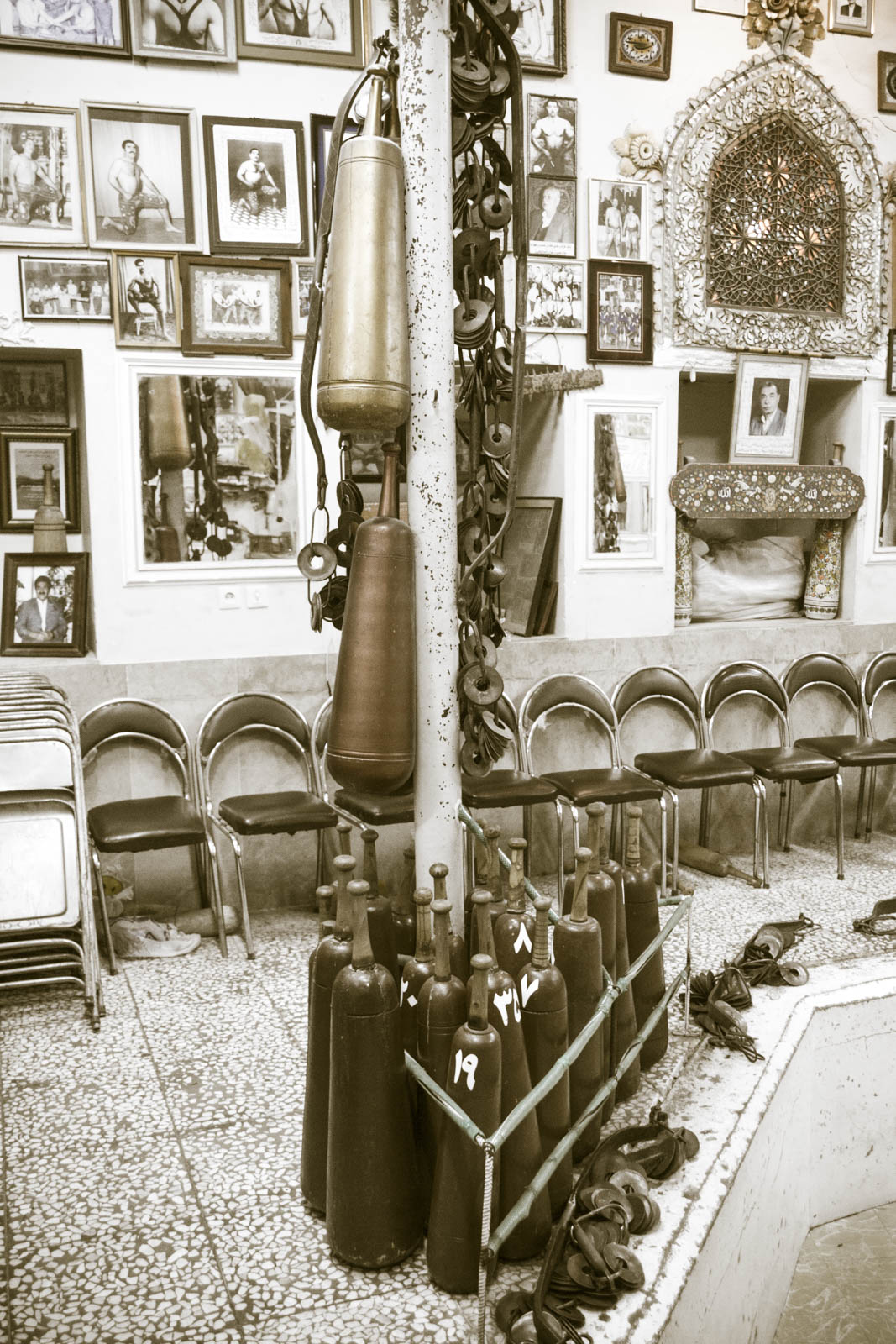 A Esfahan, on a aussi eu la chance de pouvoir rentrer dans un Zurkaneh, une maison de force, un lieu où l’on pratique un sport ancestral, le Varzesh-e Pahlavani. Il existe des lieux de ce type dans de nombreuses villes d’Iran, tous ayant à peu près la même forme. Dans la petite salle, une fosse octogonale au centre, d’environ un mètre de profondeur. Un perchoir domine la fosse et le reste de la salle. Autour de la fosse, des objets lourds semblables à des massues, de poids différents. Et partout sur les murs des photos d’hommes forts, des champions ou des anonymes pratiquant ce sport.