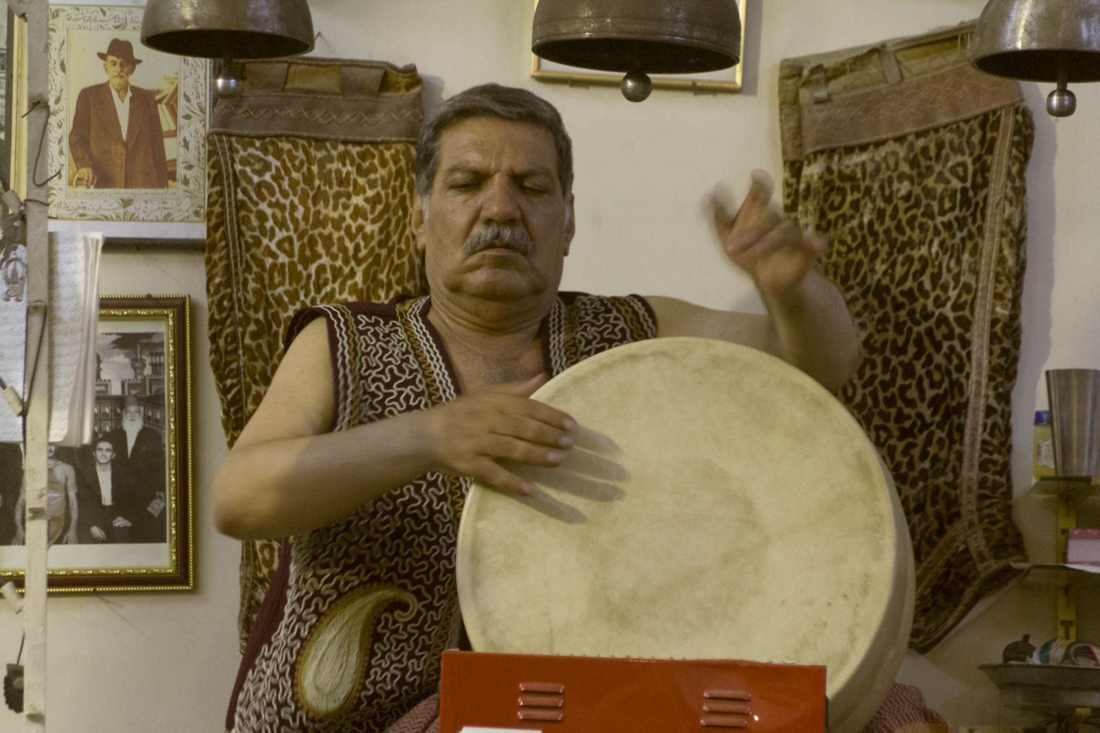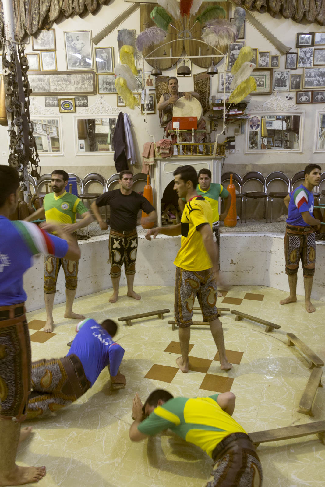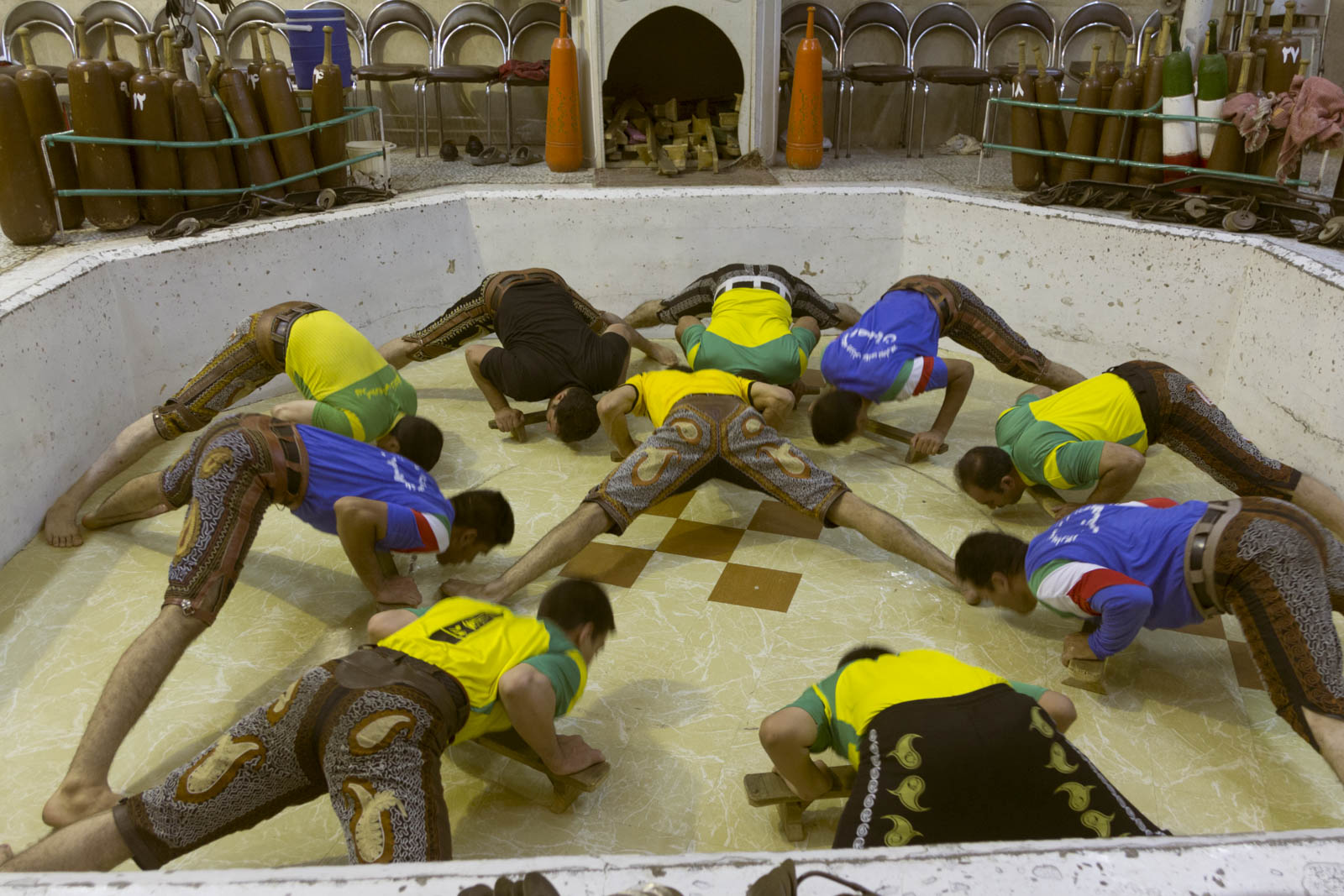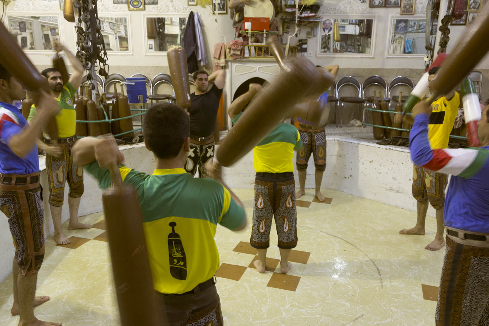 En cette soirée d’été, les sportifs débarquent dans la salle au compte-gouttes. Ils mettent leur tenue et s’échauffent à part, individuellement. Puis au bout d’un moment, ils commencent à descendre dans la fosse, pour le début de l’entraînement. Pendant une bonne heure, c’est au rythme des cloches, des chants et du tombak (un tambour), que les sportifs vont pratiquer les différents exercices : manipulation de massues, pompes, tournoiement sur soi-même… Et à la manœuvre de tout cela, derrière les cloches et le tombak, se trouve un homme plus vieux, celui qui nous a accueillis dans le zurkaneh, qui joue donc un peu le rôle d’entraîneur et de gardien des lieux.