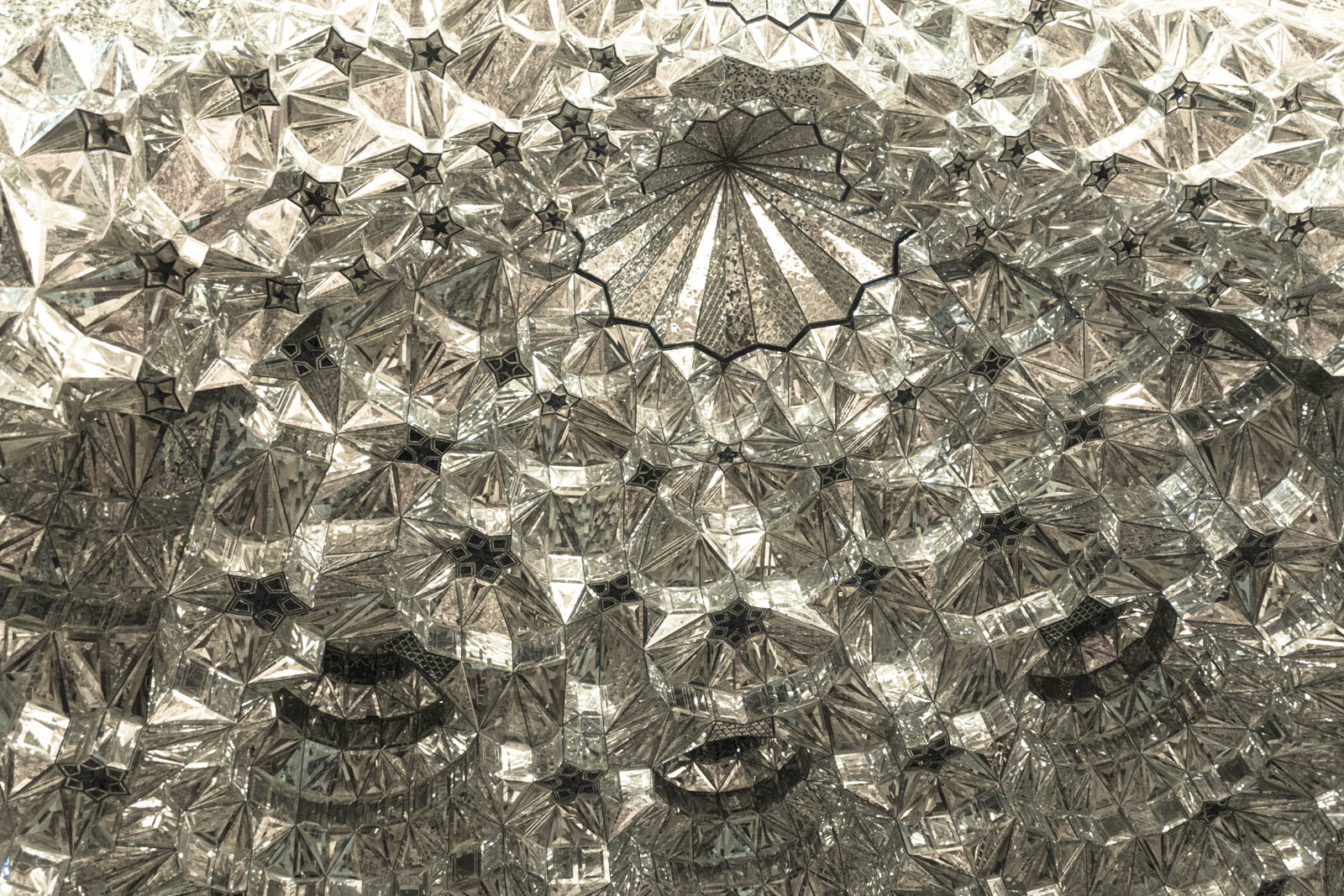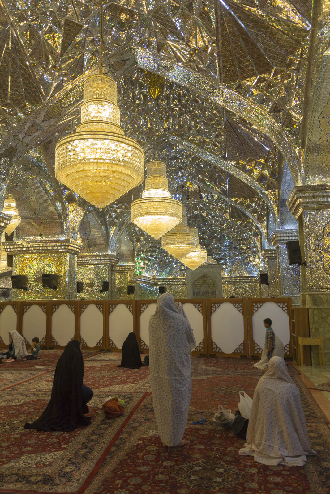 Quant au mausolée en lui-même, il est absolument extraordinaire. A l’intérieur, tout est recouvert de petits miroirs, taillés à la main pièce par pièce pour recouvrir le moindre centimètre carré de chaque voûte ou nid d’abeille. Des lustres somptueux tombent du plafond et créent de nombreux jeux de lumière avec les vitraux de couleurs sur les façades. Au cœur de la pièce, une grande foule de croyants est là. Ils viennent prier et se recueillir, chercher de la paix et de la sérénité dans ces lieux, et jeter quelques billets autour des tombeaux de deux des frères de l’imam Reza, l’un des 12 apôtres de Mahomet. Car c’est bien de cela qu’il s’agit : ce lieu est sacré car c’est là que reposent deux des proches de l’Imam.