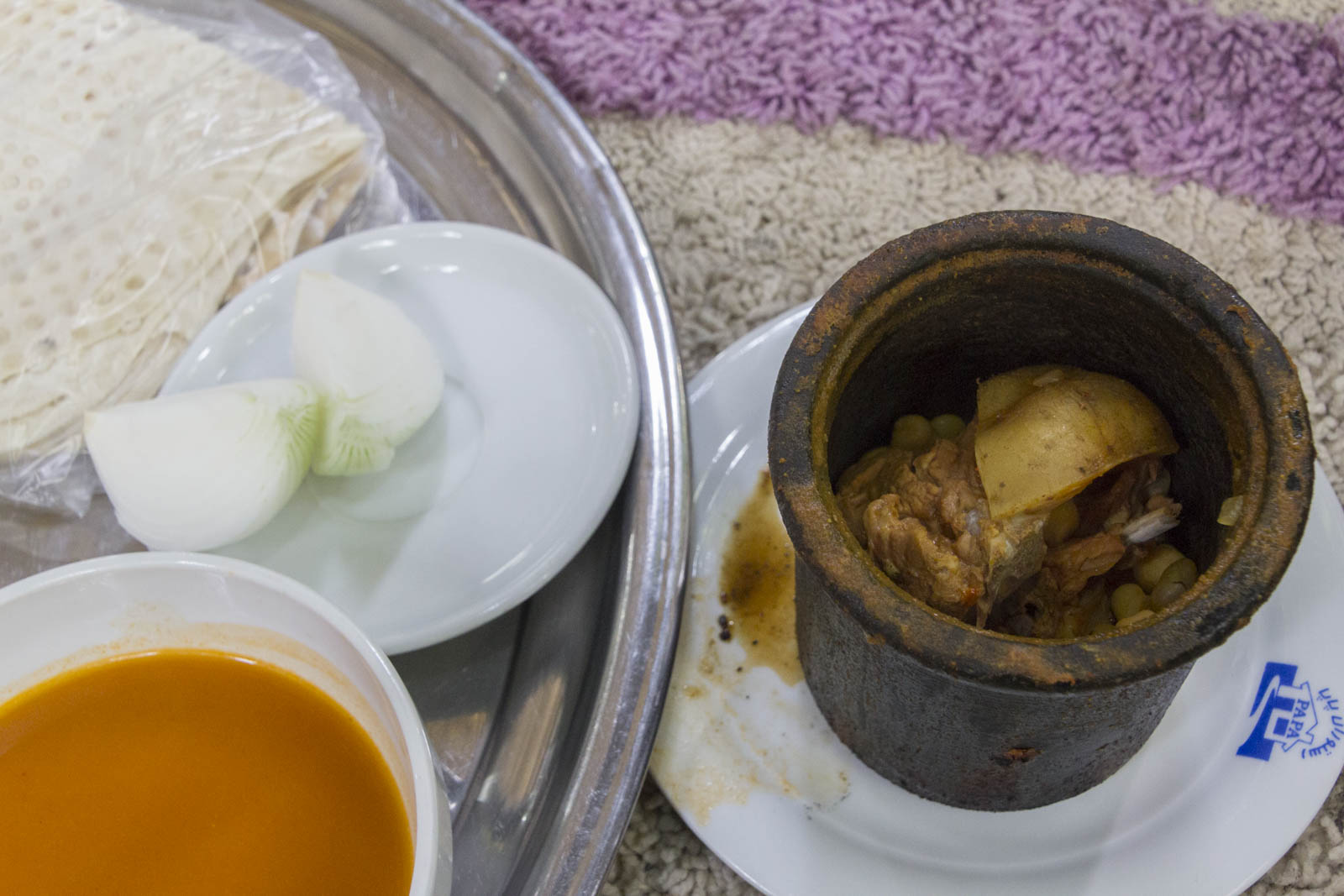 On nous a d’abord apporté un bol vide, une grande cuillère, un pilon, deux morceaux d’oignon cru pelés et du pain lavash. Puis on nous a amené le dizi en tant que tel : un grand cylindre en fonte contenant un ragoût de viande avec des morceaux de viande maigre, des morceaux de gras, des morceaux d’os, des patates, des grosses fèves et des pois chiches, le tout barbotant dans une soupe rougeâtre. C’est là qu’on s’est retrouvés comme des poules devant un couteau : qu’est-ce qu’on va bien faire avec tout ça ?