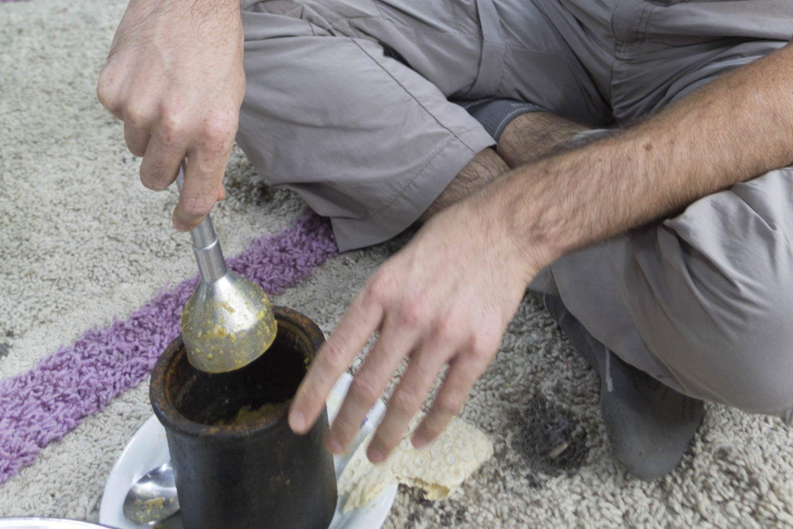 On a bien essayé de verser le jus dans le bol, puis de pilonner ce qui reste, en remettant au fur et à mesure un peu de jus (fallait bien qu’il serve à quelque chose), mais ce premier essai, avouons-le, n’a pas été des plus concluants… Mais heureusement, on a eu une deuxième chance quelques jours plus tard chez Somayeh et Farshid, nos couchsurfers de Kashan. Et là, c’était fameux !