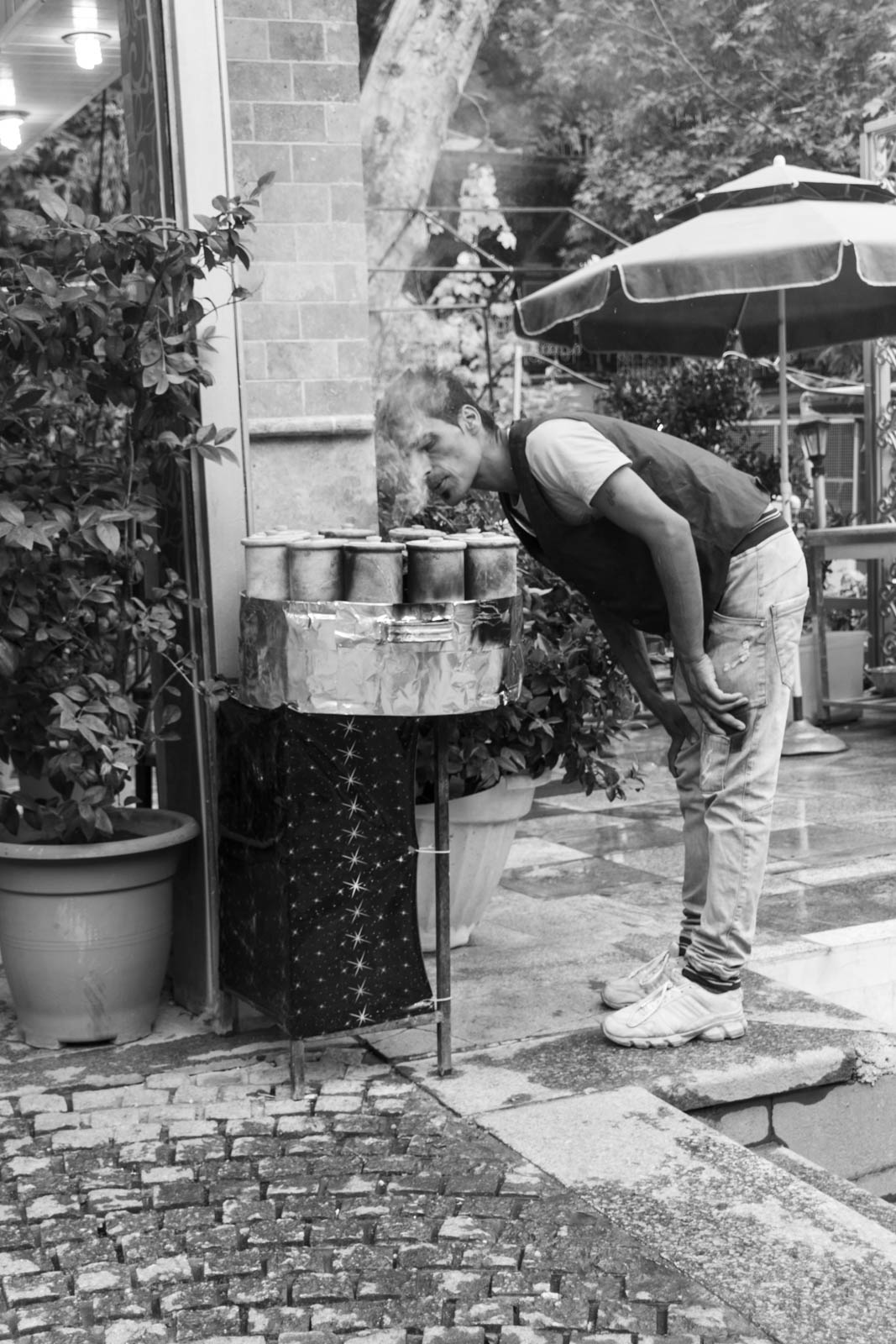 A l’opposé de toute cette relative finesse, on a le kaleh pache. C’est un plat typique qui, comme le beryun, ne se trouve que dans des établissements spécialisés. La première fois qu’on entre dans un endroit de ce type, ça surprend : on a d’un côté une énorme marmite dans laquelle cuit ce qui ressemble à des têtes de mouton, et d’un autre côté une grande casserole avec ce qui ressemble à des tripes. Et l’odeur, on s’en douterait, est assez épouvantable. On a quand même essayé de demander au maître des lieux le menu : il nous a regardés, interloqué, et a montré du doigt la marmite et la casserole. Nous voilà au parfum, c’est le cas de le dire. Alors on est partis !