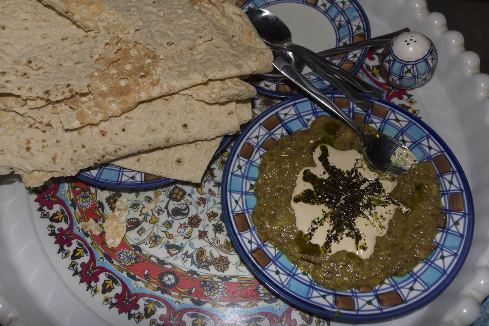 Pour les repas moins élaborés, le pain remplace le riz. Il y a essentiellement deux types de pain qui peuvent être servis avec le repas. Le plus courant est le pain lavash, très fin, qui se présente sous forme de grandes feuilles enroulées et a comme une texture de papier à bulles. Le pain barbari, quant à lui, est de forme ovale, plus épais et plus tendre. Celui-ci ressemble plus au pain que l’on connaît, et est bien meilleur !