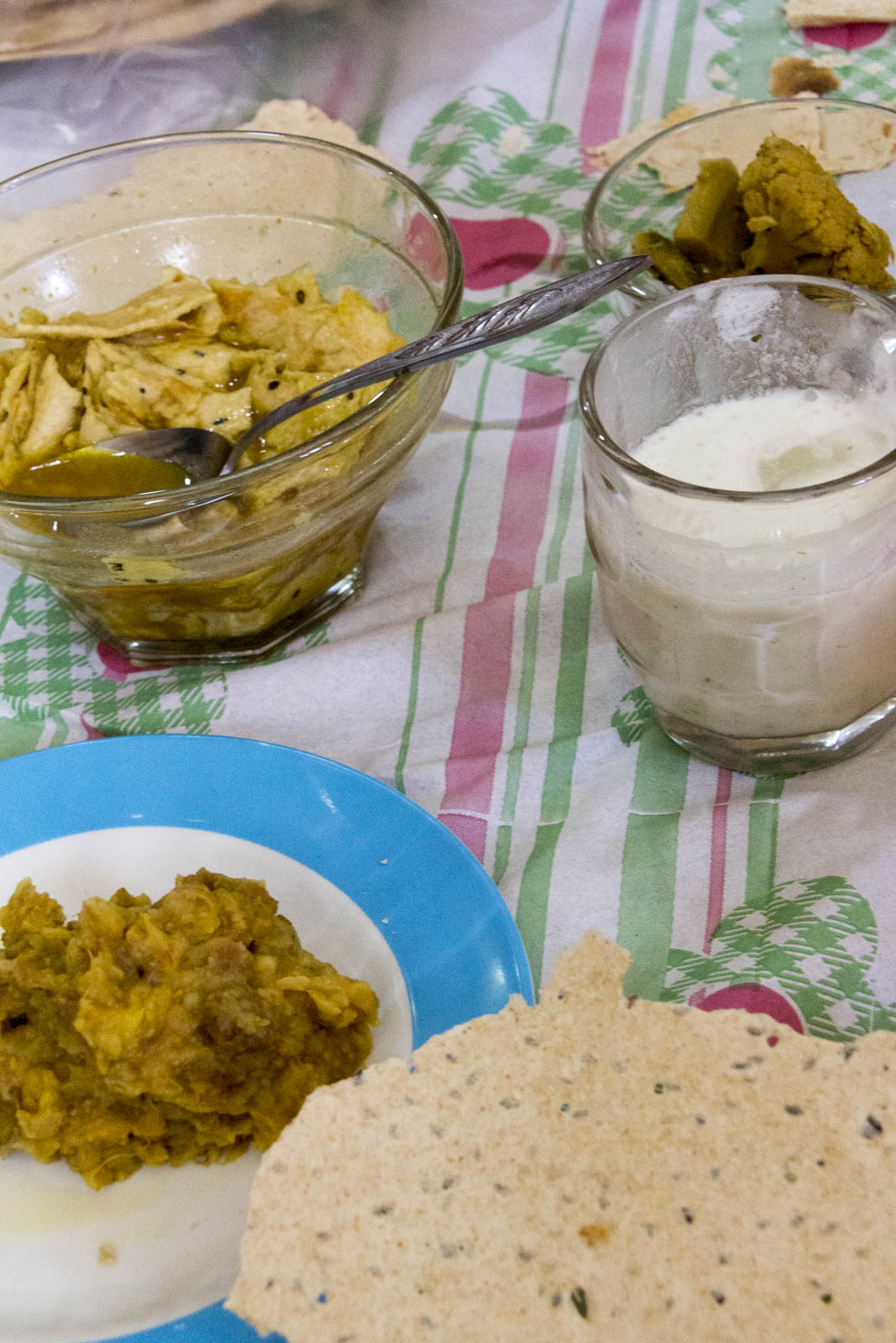 Au moment du repas, on distribue une assiette, une fourchette et une grande cuillère à chaque convive, mais pas de couteau. Cette différence dans l’utilisation des couverts nous a d’ailleurs menés une fois à ce mignon petit échange :