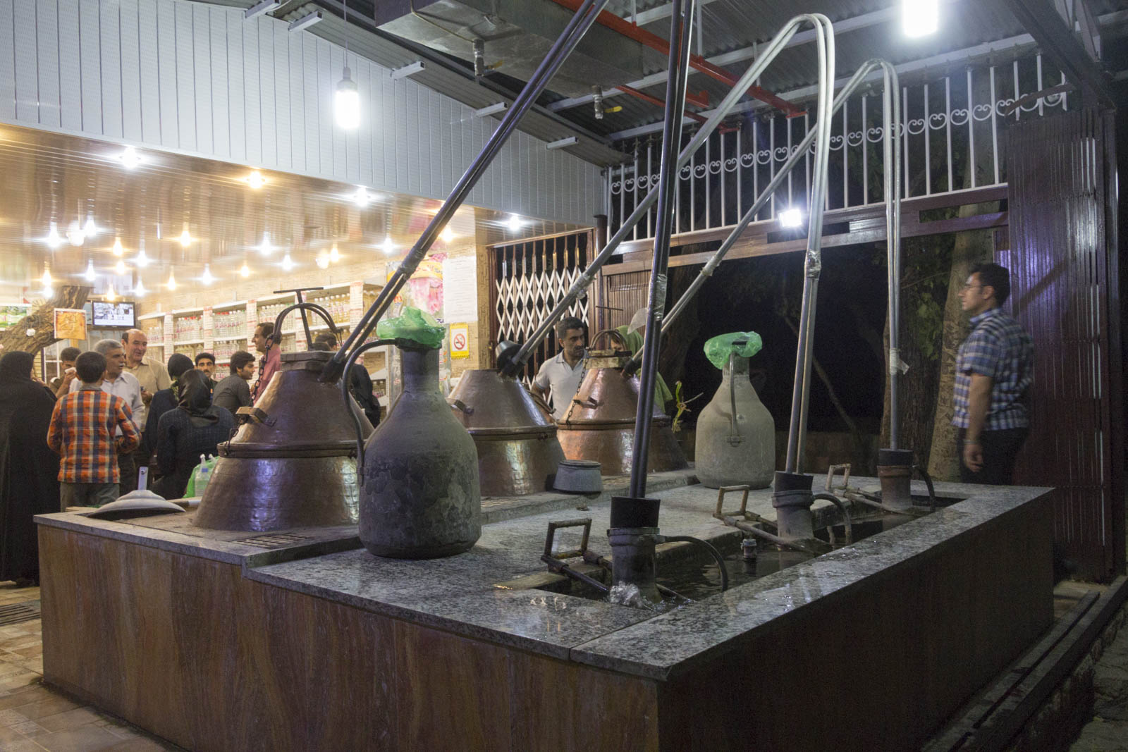 Les boissons fraîches à base d’extraits de fleurs ou d’épices méritent qu’on s’y attarde un peu plus. Elles résultent d’un processus assez ancien de distillation, qui consiste à faire bouillir des fleurs séchées (rose, nastaran, fleur d’oranger) ou des épices (cannelle, safran) dans de l’eau, puis à refroidir la vapeur dans une sorte d’alambic simplifié, où le distillat vient se condenser dans un autre récipient. On tient notre essence de fleurs. Il ne reste plus qu’à en diluer un peu dans de l’eau fraîche et sucrée !