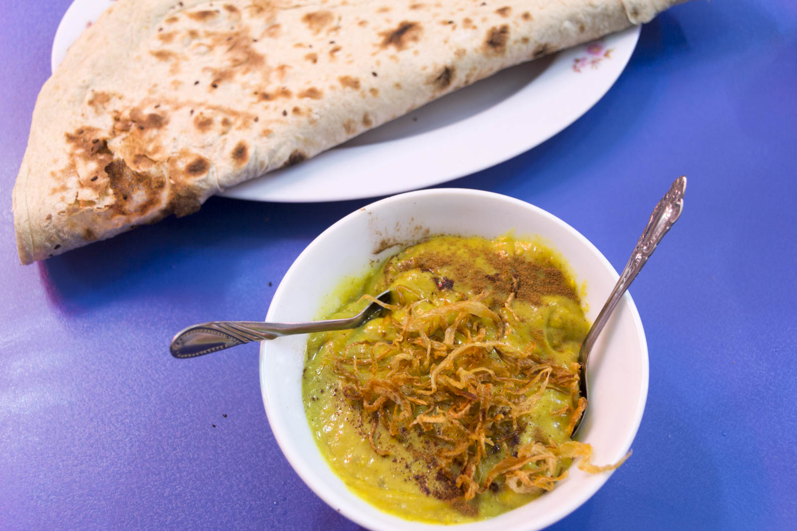 La solution, la voici : en fait, le dizi se mange en deux étapes. D’abord, on met des morceaux de lavash au fond du bol, et on verse le bouillon dessus. Le mélange du pain sec et de la soupe rend l’ensemble très intéressant, alors que pris séparément, les deux ingrédients sont plutôt quelconques…