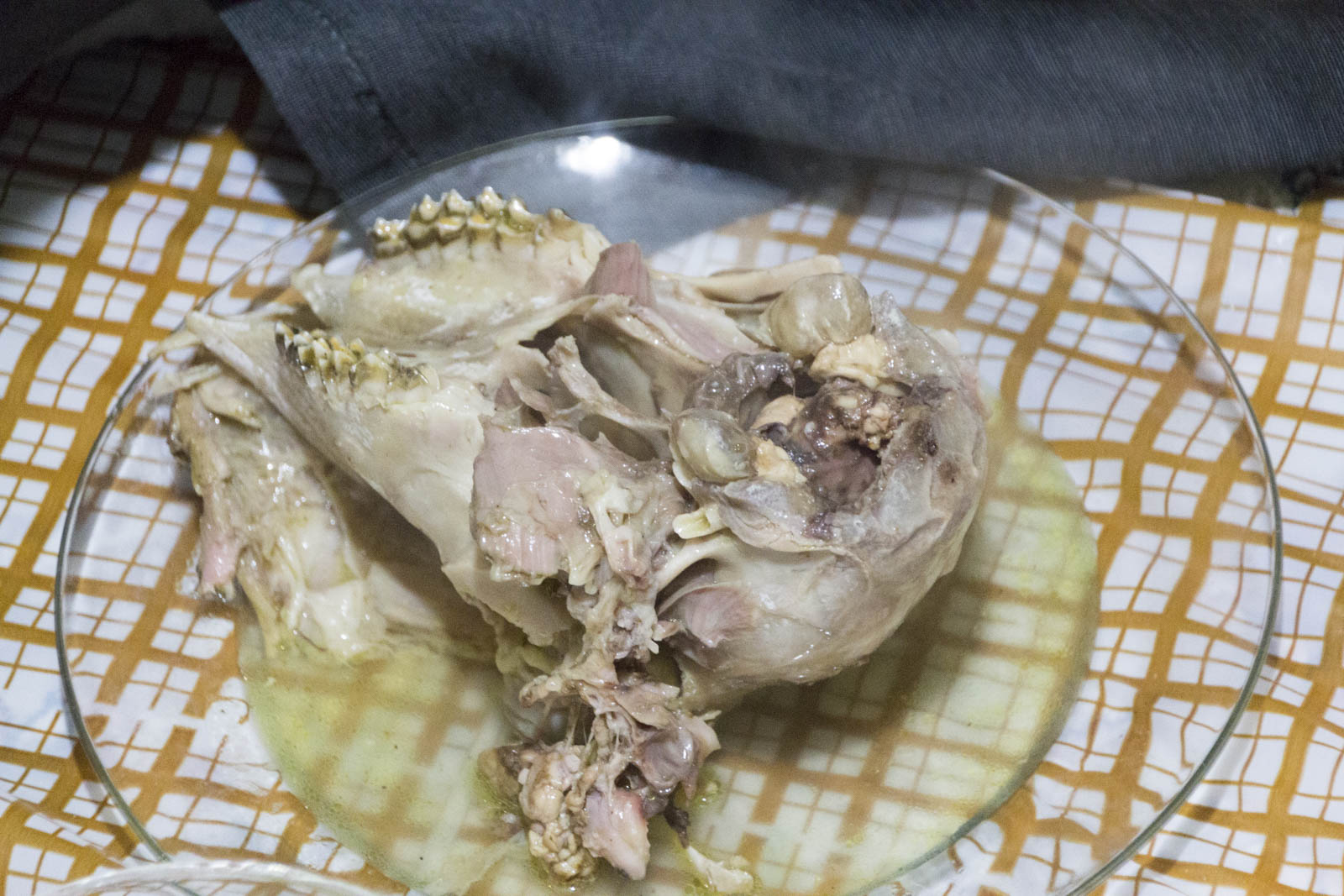 Kaleh signifie tête, en farsi. Pache signifie pied. C’est donc une soupe de têtes et pieds de moutons, que l’on laisse cuire de longues longues heures dans un bouillon d’épices et de gras de mouton. Avec toutefois une petite note de cannelle juste avant de servir… On peut l’agrémenter de tripes, pour rendre le repas encore plus convivial, mais nous on n’a eu droit qu’aux têtes et pieds. Mais là, tout y passe : langue, œil, joue, cervelle, chair crânienne, bref, tout ce qui n’est pas un os, ou presque. Un mélange violent et bien bien gras, que tous les Iraniens – mais peut-être pas toutes les Iraniennes – adorent. Inutile de préciser que le kaleh pache se mange juste avec du pain, et surtout pas avec des légumes, ni même avec du riz.