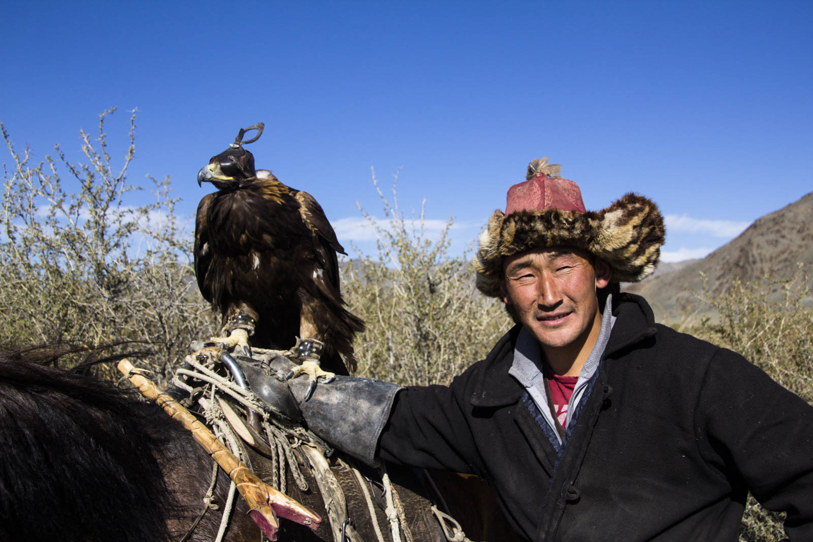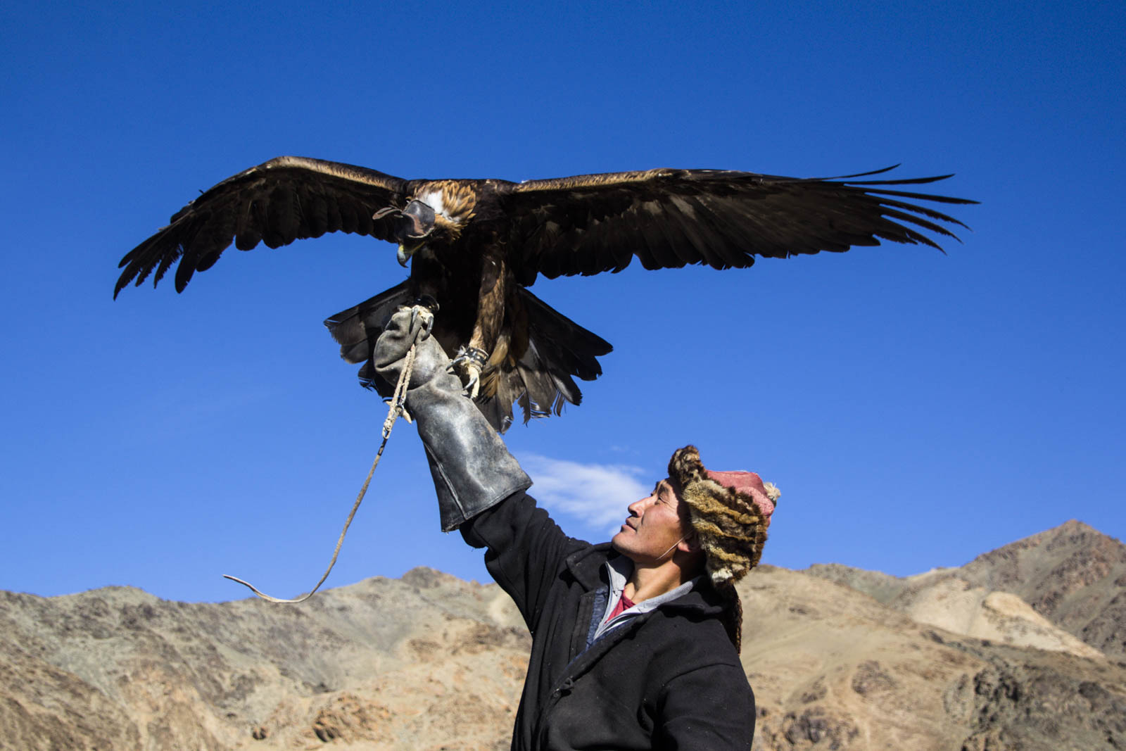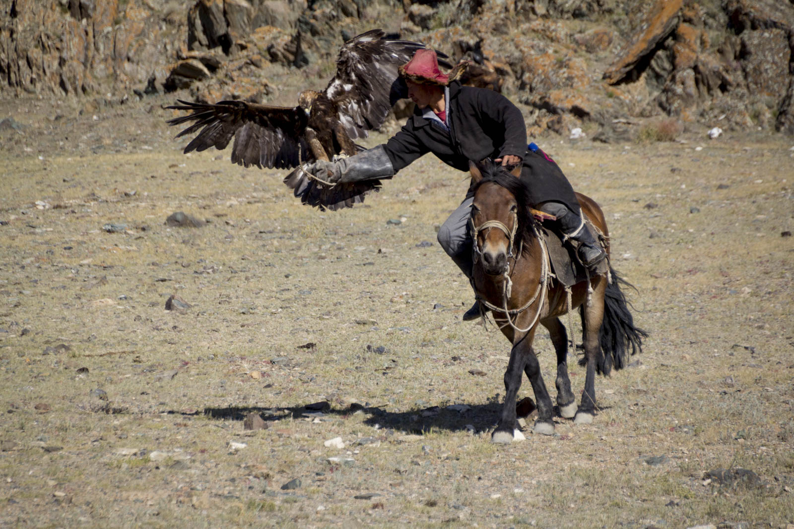 Puis, un par un, ils descendent de la montagne (à cheval, oh hé…) et se mettent à appeler leur aigle par de grands cris, en agitant un bout de viande dans leur main. La foule retient son souffle. L’aigle concerné est bien évidemment dé-casqué et détaché, et doit venir se poser directement sur le bras de son maître, et manger son petit morceau de barbaque en récompense.
