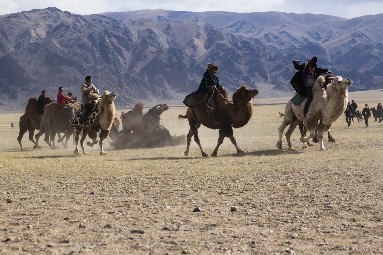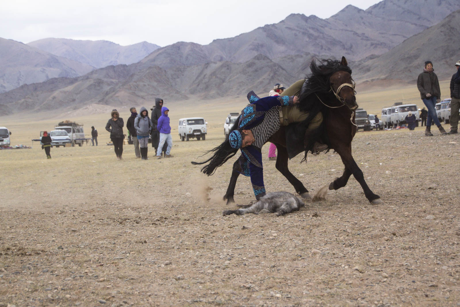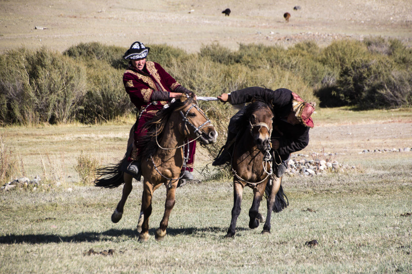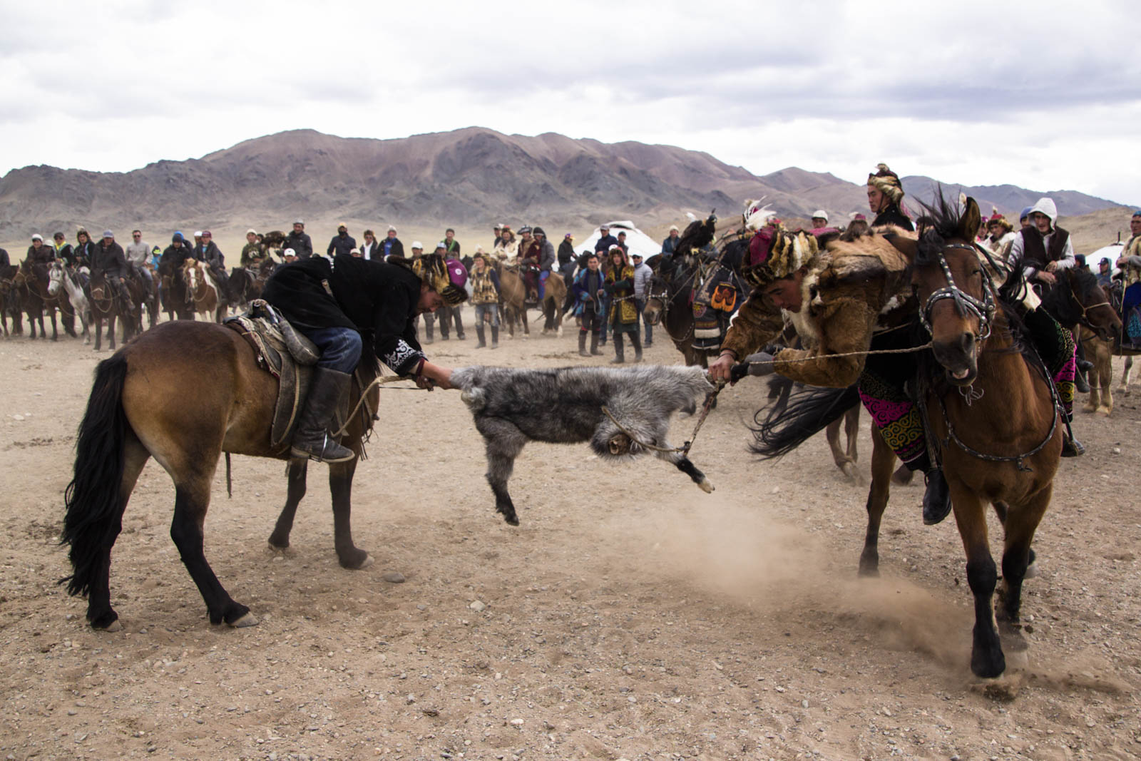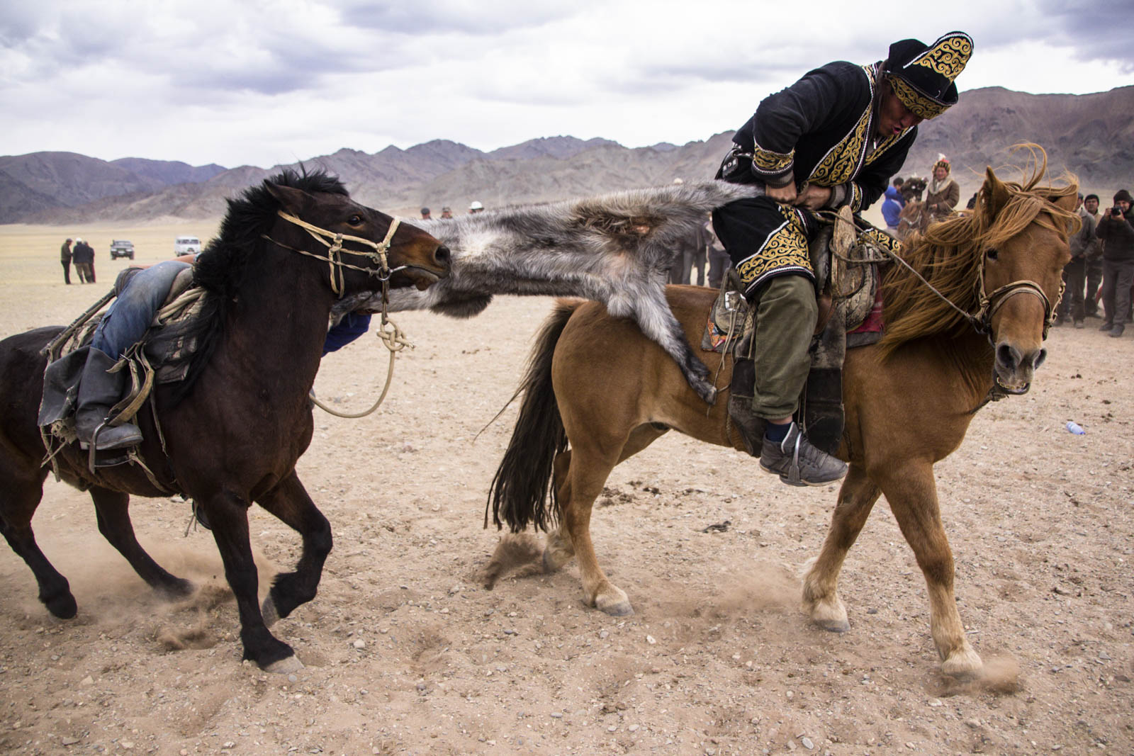 A partir de la tout s’accélère. Les deux cavaliers déploient une force énorme pour essayer de faire lâcher l’autre. Et ce qui est surtout impressionnant, c’est qu’une fois la bataille lancée, les deux cavaliers peuvent partir dans n’importe quelle direction, sans regarder où ils vont. Ils utilisent la puissance de leur cheval pour s’éloigner de leur adversaire, en essayant à tout prix de ne pas lâcher la proie. Il n’est donc pas rare que les chevaux courent sur la foule, qui fuit à toute vitesse dans un grand vacarme de poussière.