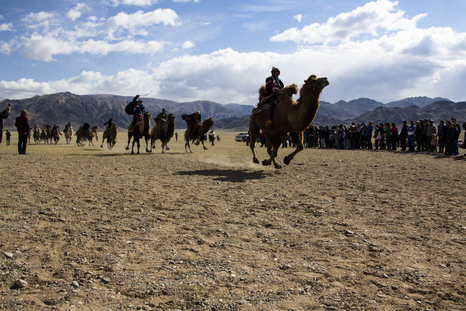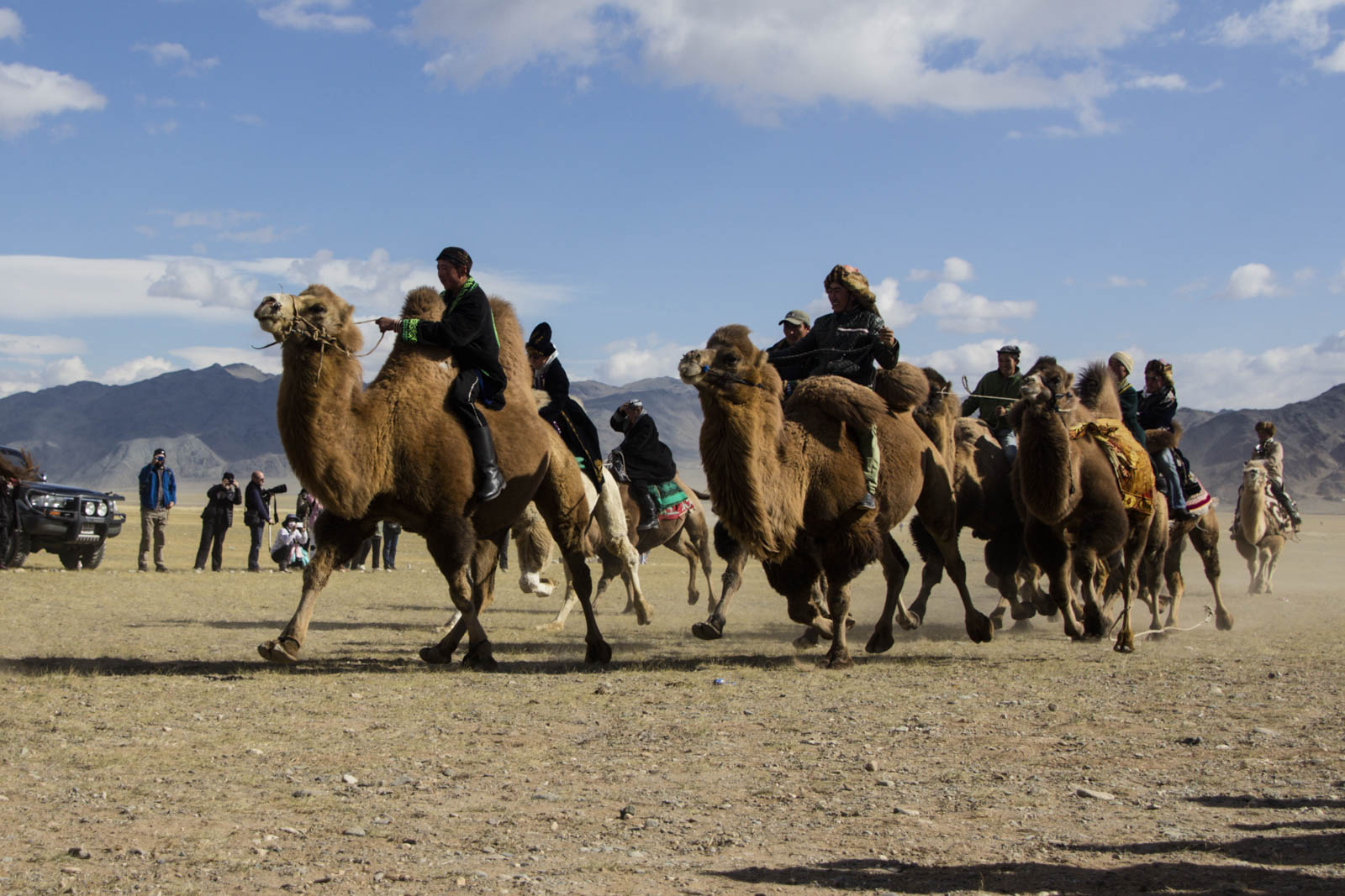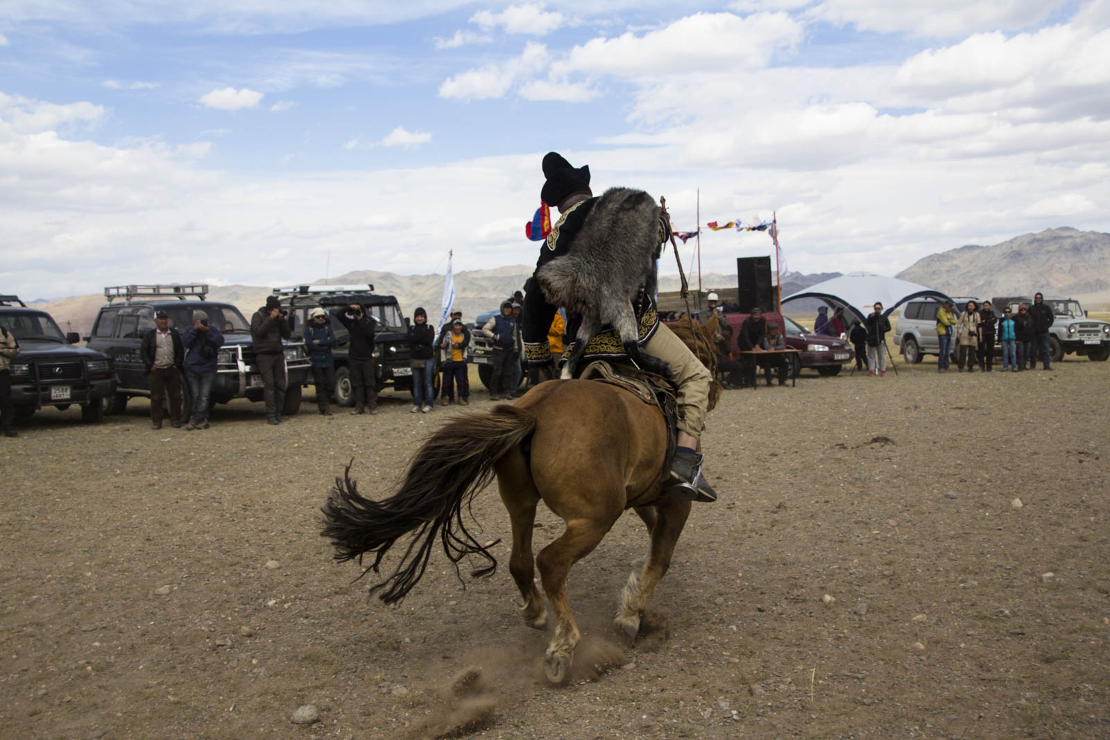 Après une ou deux bonnes heures (de retard), tout le monde est enfin là pour le début des compétitions. Un jury a été installé sur un côté, avec microphone et sono sur un camion. Des annonces sont en faites par un animateur, en mongol ou en kazakh, on ne sait pas trop. Sans doute à propos du programme des compétitions, mais là non plus on ne jure de rien. On se contente donc de suivre la foule des initiés.