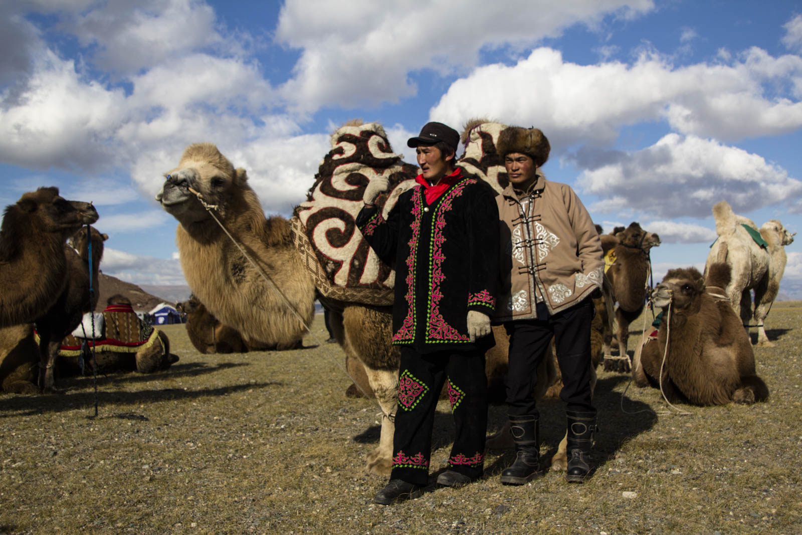 A notre arrivée, une petite foule de touristes est déjà là, à flâner devant quelques étals de souvenirs. Dans les quelques gers posées ici et là, on s’active déjà à préparer les soupes, buuz et khushuur qui seront vendus à la pause déjeuner. Dans le même temps, les concurrents arrivent sur les lieux au compte-goutte. On les voit venir de loin sur leurs chevaux, dans leur superbe tenue traditionnelle, tenant fièrement leur aigle à bout de bras.