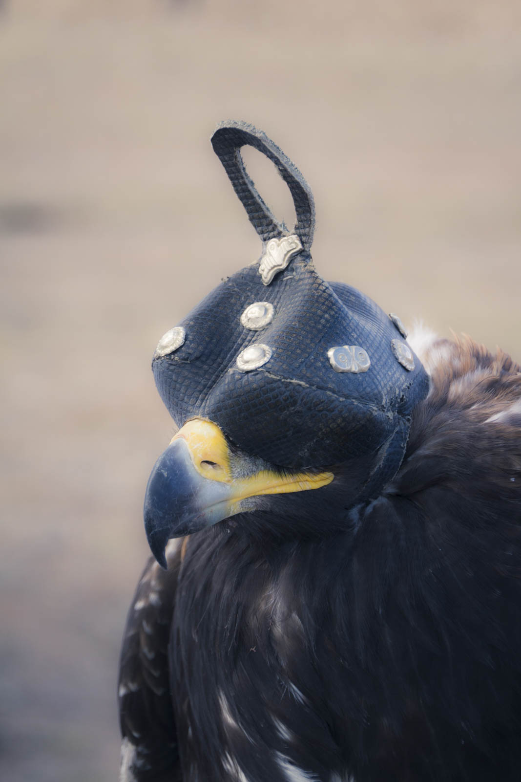 A noter que les aigles portent en permanence (sauf pendant les épreuves), une sorte de petit casque en cuir noir sur les yeux. A priori, cela les préserve du stress, inhabituel pour eux, de voir une foule s’agiter en permanence sous leur bec.