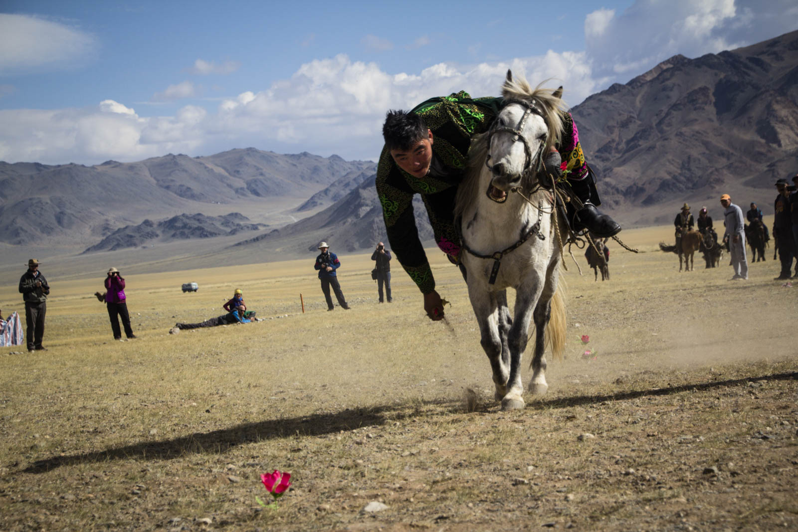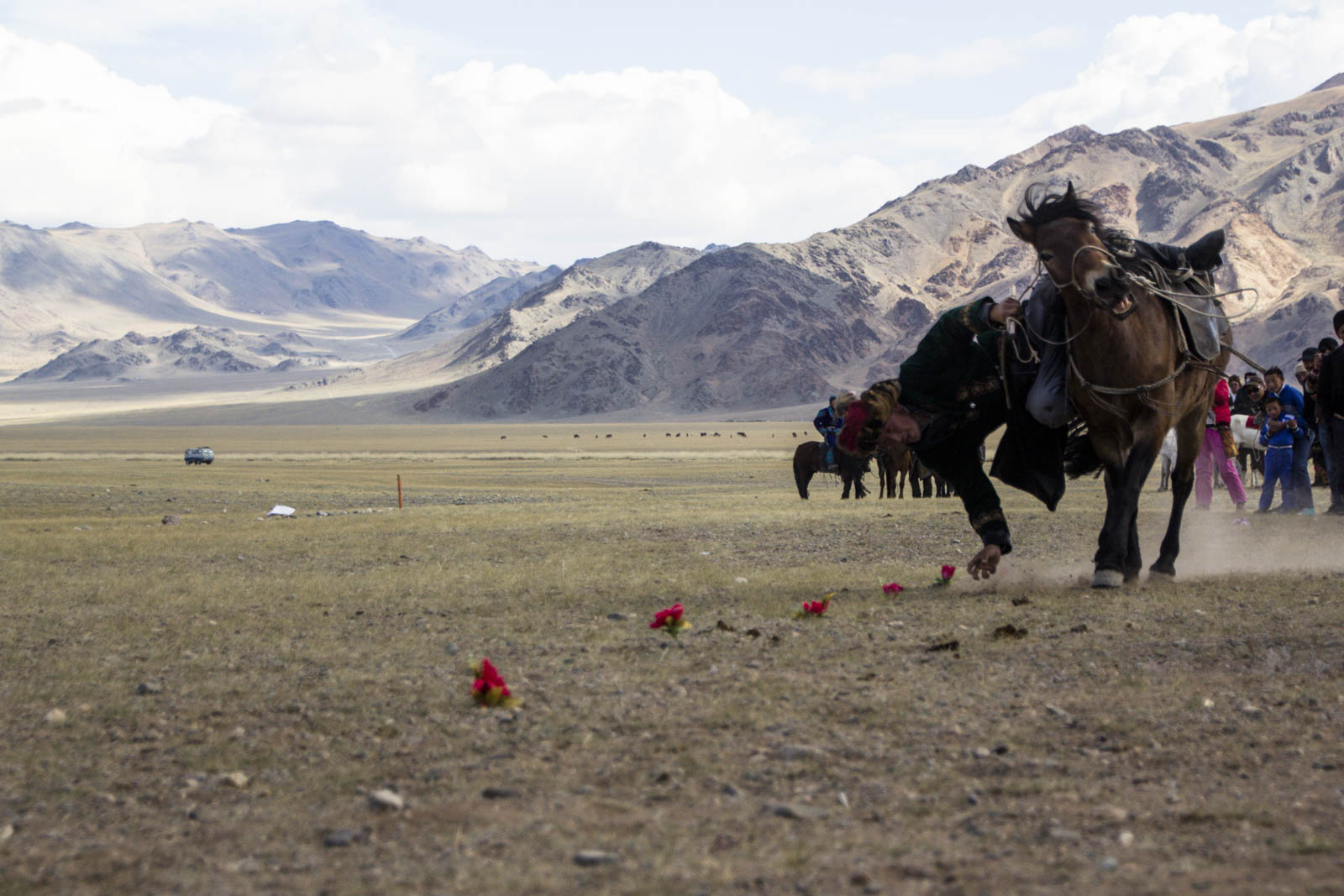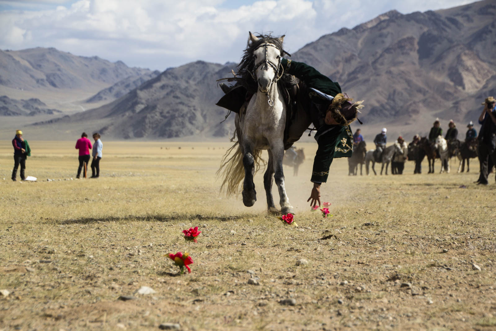 Un par un, les cavaliers, lancés au galop, doivent venir en attraper un maximum au sol. Un jeu qui demande encore beaucoup de souplesse et de dextérité : complètement penchés sur leur cheval, ils doivent d’une main attraper les fleurs, et de l’autre maintenir le cap et la vitesse de leur monture. Encore un jeu bien difficile, où très rares sont ceux qui ont réussi à prendre plus de trois fleurs. Mais là aussi, ça en jette !