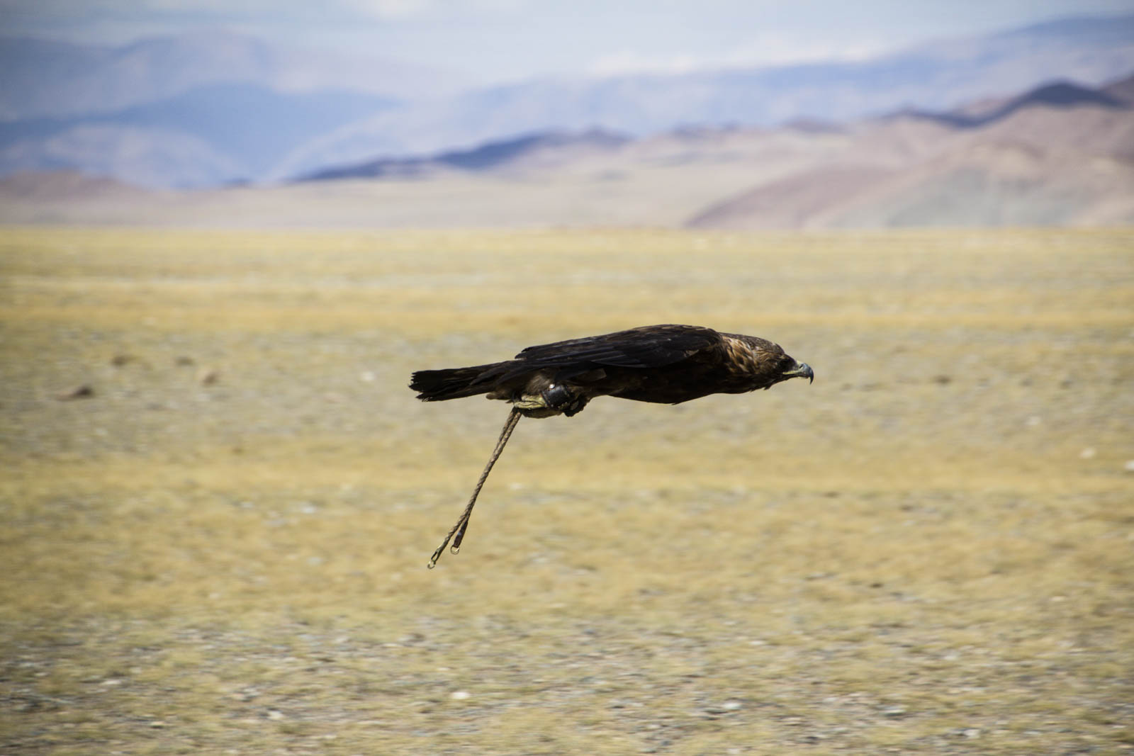 Ensuite, parce que le vent souffle fort aujourd’hui, et en plus dans le mauvais sens. On a ainsi vu fréquemment des aigles partir dans la direction opposée à leur maître, perturbés par ce vent. Ce fut le cas, malheureusement, de notre hôte Baï-Bolat. D’autres fois, les aigles sont partis dans la bonne direction mais ont été emportés dans leur élan, les faisant atterrir bien loin de leur cible…