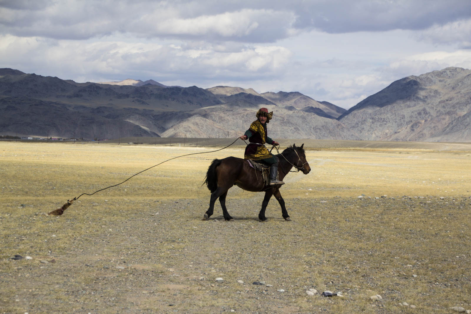 Le lendemain, on a droit à une autre variante de l’appel à l’aigle. Au lieu d’un morceau de viande tenu à bout de bras, c’est cette fois une peau de renard tirée par le cheval qui sert d’appat. Encore plus ardu, car l’aigle doit ensuite venir se poser sur le bras de son maître ! Et, malgré un vent un peu plus clément, le taux de réussite de l’exercice est toujours aussi faible.