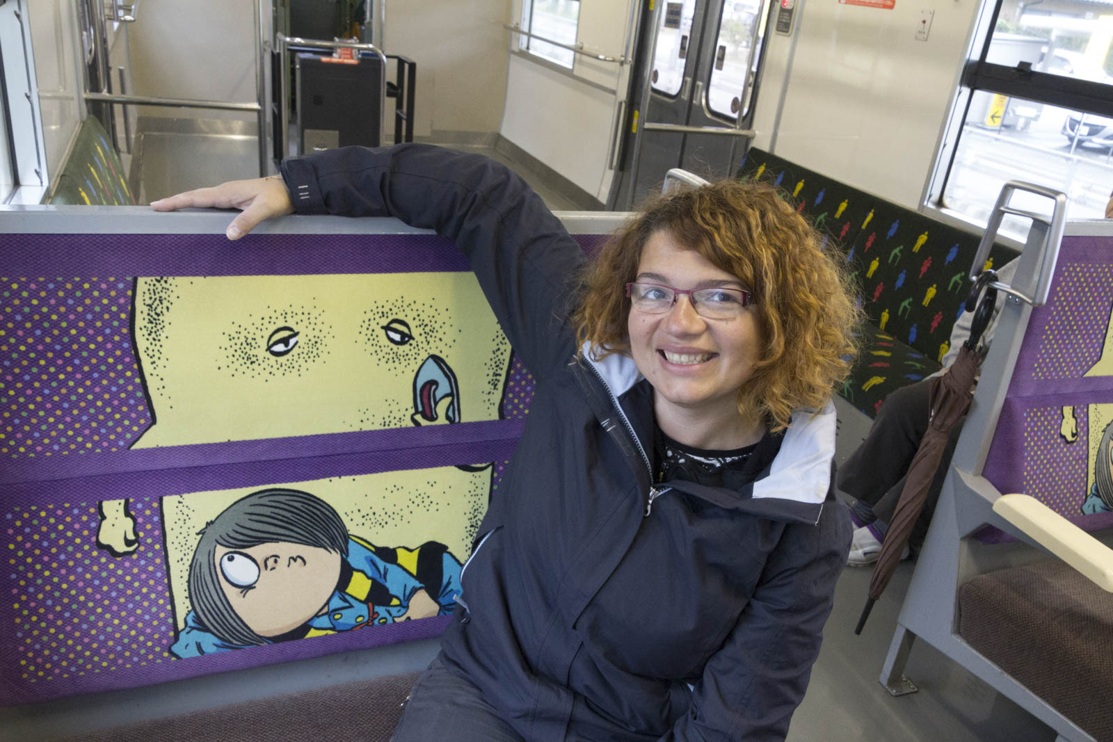 Malheureusement on ne pourra rester que trois heures dans cette ville, car nous sommes attendus ce soir. Alors après avoir mangé nos premiers udon, il est déjà l’heure de prendre le train. Un train aux couleurs des personnages du manga, bien sûr ! Jusqu’aux motifs des sièges et à la voix utilisée pour faire l’annonce des stations…